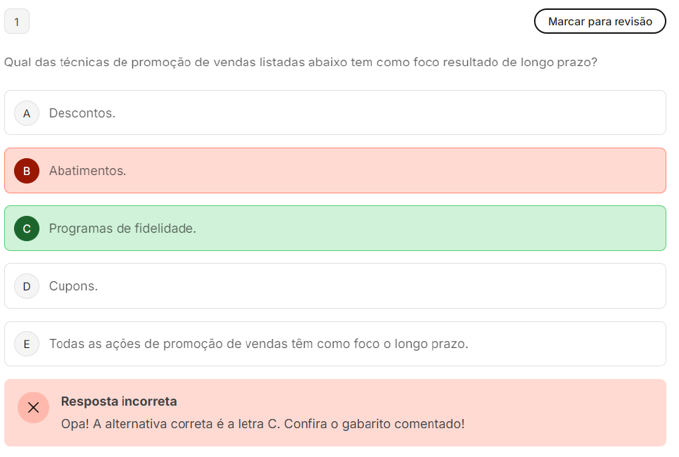 <p>1 Marcar para revisão Qual das técnicas de promoção de vendas listadas abaixo tem como foco resultado de longo prazo? A Descontos. B Abatimentos. C Programas de fidelidade. D Cupons. E Todas as ações de promoção de vendas têm como foco longo prazo. Resposta incorreta Opa! A alternativa correta é a letra C. Confira o gabarito comentado!</p><p>2 Marcar para revisão A área de marketing tinha papel de divulgar produtos ou serviços e departamento de vendas investia em treinamento de pessoas que tinham a responsabilidade de convencer e vender. As técnicas de promoção de vendas consideradas como promoções não monetárias tem como exemplo qual opção abaixo? A Descontos. B Redução percentual. C Cupons. D Abatimentos. E Amostra grátis. Resposta incorreta Opa! A alternativa correta é a letra E. Confira o gabarito comentado! Gabarito Comentado Amostra</p><p>3 Marcar para revisão Em qual dos fatores determinantes da compra consumidor lida com um conflito interno e psicológico entre o autocontrole e a predisposição de agir sem reflexão? A Consumo utilitário. B Consumo hedônico. C Impulso. D Lealdade. E Percepções de preço. X Resposta incorreta Opa! A alternativa correta é a letra C. Confira o gabarito comentado! Gabarito Comentado impulso é um fator determinante da compra que leva o consumidor a agir sem reflexão, por isso ele lida com um conflito interno e entre autocontrole e a predisposição de agir sem reflexão.</p><p>4 Marcar para revisão No contexto do trade-marketing, quem é considerado cliente das empresas e/ou fabricantes de produtos? A consumidor final. B varejista. C analista de marketing. D A equipe de logística. E Os vendedores. X Resposta incorreta Opa! A alternativa correta é a letra B. Confira o gabarito comentado! Gabarito Comentado No contexto do trade-marketing, cliente das empresas e/ou fabricantes de produtos é varejista. Isso ocorre porque trade-marketing é uma estratégia de marketing B2B (Business to Business), onde foco é</p><p>5 Marcar para revisão Em qual das interações internas do trade-marketing são entendidos os procedimentos, a flexibilidade e a velocidade de resposta ao abastecimento de ações promocionais? A Logística. B Marketing. C Agências de promoção. D Vendas. E Compras. X Resposta incorreta Opa! A alternativa correta é a letra A. Confira o gabarito comentado! Gabarito Comentado A logística é a área responsável por entender e gerenciar os procedimentos, a flexibilidade e a velocidade</p><p>6 Marcar para revisão Os principais erros estratégicos de marketing que acontecem no contexto do varejo multicanal e showrooming relacionam-se a: A Displays ultrapassados. B Baixa remuneração do trade-marketer. C Poucas opções de pagamento no mundo físico. D Gestão da equipe de vendedores do mundo físico. E Falta de programas de fidelização. Resposta correta você selecionou a alternativa correta. Confira o gabarito comentado! Gabarito Comentado erro estratégico de marketing mais comum no contexto do varejo multicanal e showrooming é a falta de</p><p>7 Marcar para revisão Para alcançar resultados melhores nos PDVs é essencial adotar ferramentas que contribuam para se atingir os objetivos de venda. Qual nome do desenho gráfico que orienta posicionamento de um produto na gôndola, no PDV, na prateleira ou expositor, de acordo com seu sortimento ou gerenciamento por categoria? A Eletrograma. B Permeografia. C Relevografia. D Encavografia. E Planograma. X Resposta incorreta Opa! A alternativa correta é a letra E. Confira o gabarito comentado! Gabarito Comentado planograma é um quia de posicionamento dos produtos que busca a exposição ideal deles, retratando</p><p>8 Marcar para revisão Merchandising é um conceito da área do marketing que indica uma técnica de planejamento e promoção de um produto, no local e tempo adequados. Nesse contexto, qual nome da prática de visitar uma loja física para examinar um determinado produto antes de comprá-lo on-line a um preço mais baixo? A Webrooming. B E-commerce. C Customer engagement. D Omnichannel marketing. E Showrooming. X Resposta incorreta Opa! A alternativa correta é a letra E. Confira o gabarito comentado! Gabarito Comentado Showrooming é a prática de visitar uma loia física para examinar um determinado produto antes de</p><p>9 Marcar para revisão Qual das alternativas abaixo melhor define fenômeno do showrooming? A A atitude de visualizar um produto na loja física e comprá-lo no online. B A atitude de verificar produto no online e comprá-lo na loja física. C A exposição de produtos em lojas online. D A atitude de comparar preços entre concorrentes. E A atitude de selecionar um vendedor específico para atendimento na loja física. X Resposta incorreta Opa! A alternativa correta é a letra A. Confira o gabarito comentado! Gabarito Comentado fenômeno do showrooming é caracterizado pela prática de examinar produtos em uma loja física e, posteriormente, adquiri-los pela internet, geralmente a um preço mais baixo. Essa prática tem se tornado cada do eletrônico Portanto a alternativa melhor</p><p>10 Marcar para revisão Qual fase de implementação do trade-marketing ocorre logo após a fase do resultado financeiro? A Fase de vendas. B Fase do marketing. C Fase do cliente. D Fase de desenvolvimento de negócios. E A fase do resultado financeiro é a última fase. X Resposta incorreta Opa! A alternativa correta é a letra D. Confira o gabarito comentado! Gabarito Comentado A fase de desenvolvimento de negócios é a fase que ocorre logo após a fase do resultado financeiro. Esta fase é responsável por desenvolver e implementar estratégias de marketing e vendas que irão ajudar a empresa a seus de negócios.</p>