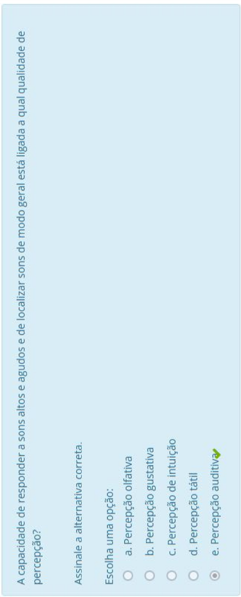 <p>A capacidade de responder a sons altos e agudos e de localizar sons de modo geral está ligada a qual qualidade de percepção? Assinale a alternativa correta. Escolha uma opção: a. Percepção olfativa b. Percepção gustativa Percepção de intuição d. Percepção tátil e. Percepção auditiva</p>