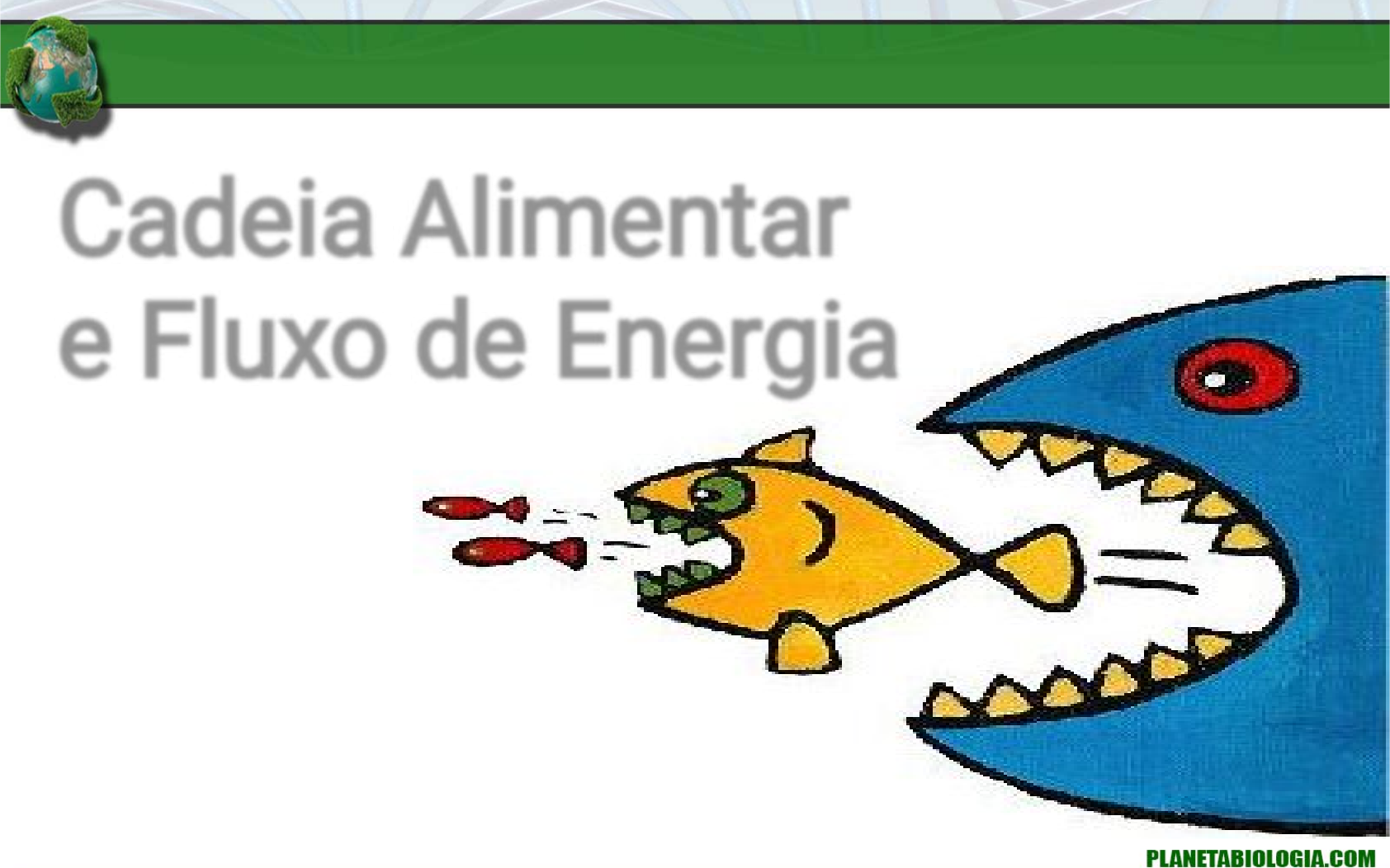 <p>Cadeia Alimentar</p><p>e Fluxo de Energia</p><p>1)</p><p>a)</p><p>•</p><p>•</p><p>Conceitos Prévios</p><p>Organismos Autótrofos</p><p>São organismos que possuem a capacidade de utilizar o CO2 como fonte de</p><p>carbono para produzir matéria orgânica.</p><p>Os organismos podem ser autótrofos de duas maneiras:</p><p>I) Realizando fotossíntese</p><p>A fonte de energia necessária para converter o CO2 em matéria orgânica</p><p>provém da luz.</p><p>II) Realizando quimiossíntese</p><p>A energia necessária para converter o CO2 em matéria orgânica</p><p>provém de reações químicas.</p><p>Cadeia Alimentar e Fluxo de Energia</p><p>6CO2 + 12H2O C6H12O6 + 6H2O + 6O2</p><p>1)</p><p>a)</p><p>Conceitos Prévios</p><p>Organismos Autótrofos</p><p>Cadeia Alimentar e Fluxo de Energia</p><p>Algas Verdes</p><p>Árvores</p><p>Bromélias</p><p>Cianobactérias</p><p>Algas</p><p>unicelulares</p><p>Algas Pardas</p><p>1)</p><p>a)</p><p>Conceitos Prévios</p><p>Organismos Heterótrofos</p><p>São organismos que não são capazes de produzir matéria orgânica. Dessa</p><p>maneira, precisam obter a matéria orgânica pronta.</p><p>Cadeia Alimentar e Fluxo de Energia</p><p>1)</p><p>a)</p><p>Conceitos Prévios</p><p>Importância dos autótrofos</p><p>Os autótrofos, por serem capazes de produzir matéria orgânica, são os</p><p>grandes produtores de nutrientes dos ecossistemas.</p><p>Cadeia Alimentar e Fluxo de Energia</p><p>a)</p><p>2) Cadeias Alimentares</p><p>Conceito</p><p>Relação alimentar entre organismos de um ecossistema. Representa a série</p><p>de organismos pela qual f lui a energia inicialmente assimilada pelos</p><p>produtores.</p><p>Luz</p><p>Capim Gafanhoto Sapo Serpente</p><p>Decompositores</p><p>(bactérias e fungos)</p><p>Cadeia Alimentar e Fluxo de Energia</p><p>TEIA ALIMENTAR</p><p>Cadeia Alimentar e Fluxo de Energia</p><p>FLUXO DE ENERGIA</p><p>Fluxo de energia</p><p>1</p><p>2</p><p>8</p><p>9</p><p>10</p><p>11</p><p>4</p><p>3</p><p>5</p><p>6</p><p>7</p><p>Q</p><p>ua</p><p>nt</p><p>id</p><p>ad</p><p>e</p><p>de</p><p>en</p><p>er</p><p>gi</p><p>a</p><p>Cadeia Alimentar e Fluxo de Energia</p><p>Cadeia Alimentar e Fluxo de Energia</p><p>Cadeia Alimentar e Fluxo de Energia</p><p>PIRÂMIDES ECOLÓGICAS</p><p>a) Pirâmide de Energia</p><p>É sempre direta!!!</p><p>Cadeia Alimentar e Fluxo de Energia</p><p>PIRÂMIDES ECOLÓGICAS</p><p>b) Pirâmide de números</p><p>Pode ser direta ou</p><p>inversa</p><p>Se os produtores forem</p><p>organismos pequenos e os</p><p>consumidores</p><p>relativamente maiores, a</p><p>pirâmide será sempre</p><p>direta.</p><p>Se os produtores forem de</p><p>grande tamanho (uma</p><p>árvore) e os herbívoros</p><p>pequenos (lagartas) a</p><p>base da pirâmide será</p><p>estreita e o gráfico não</p><p>apresentará forma de</p><p>pirâmide.</p><p>Cadeia Alimentar e Fluxo de Energia</p><p>PIRÂMIDES ECOLÓGICAS</p><p>b) Pirâmide de biomassa</p><p>Pode ser direta ou</p><p>inversa</p><p>Produtores</p><p>Herbívoros</p><p>Carnívoros</p><p>Fitoplâncton</p><p>Zooplâncton</p><p>Peixes</p><p>Expressa a quantidade de substância</p><p>viva (“peso seco” em cada nível trófico.</p><p>Ciclos Biogeoquímicos</p><p>Bactérias</p><p>desnitrificantes</p><p>FIXAÇÃO DO</p><p>NITROGÊNIO</p><p>ATMOSFÉRICO</p><p>DESNITRIFICAÇÃO</p><p>Assimilação pelos herbívoros</p><p>Excreção</p><p>Morte e</p><p>decomposição</p><p>NITRIFICAÇÃO</p><p>Nitrosomonas</p><p>Bactérias</p><p>fixadoras de N2</p><p>no solo</p><p>NO2 (nitrito)</p><p>NO3 (amônia)</p><p>NO3(nitrato)</p><p>Nitrobacter</p><p>Absorção de</p><p>NH3 por</p><p>algumas</p><p>plantas</p><p>Decompositores</p><p>Bactérias</p><p>fixadoras de</p><p>N2 nos</p><p>nódulos de</p><p>raízes de</p><p>leguminosas</p><p>Absorção pelas raízes</p><p>N2 atmosférico</p><p>Ciclo do</p><p>Nitrogênio</p><p>Ciclos Biogeoquímicos</p><p>Ciclo do</p><p>Carbono</p><p>Ciclos Biogeoquímicos</p><p>Ciclo da água</p>