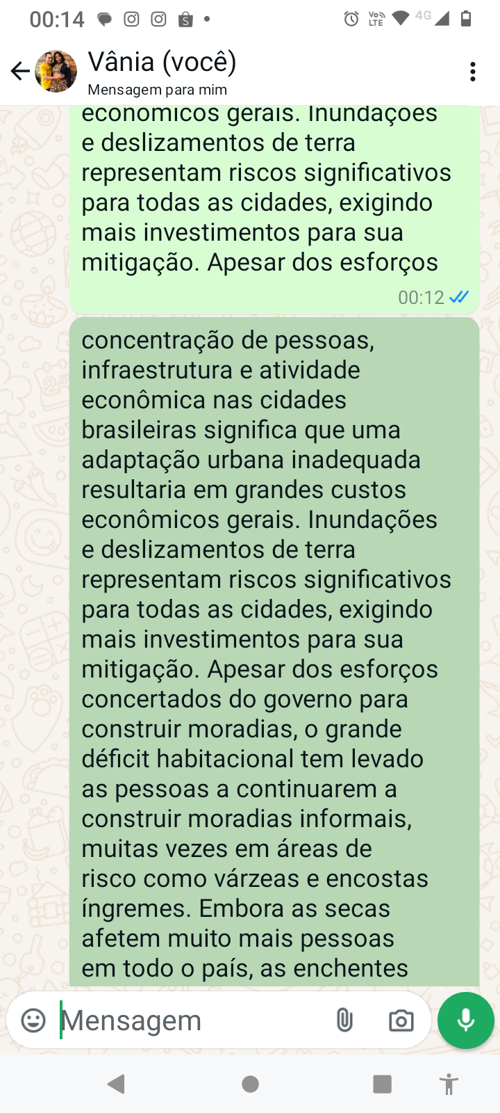 <p>00:14 4G LTE Vânia (você) Mensagem para mim economicos gerais. e deslizamentos de terra representam riscos significativos para todas as cidades, exigindo mais investimentos para sua mitigação. Apesar dos esforços 00:12 II concentração de pessoas, infraestrutura e atividade econômica nas cidades brasileiras significa que uma adaptação urbana inadequada resultaria em grandes custos econômicos gerais. Inundações e deslizamentos de terra representam riscos significativos para todas as cidades, exigindo mais investimentos para sua mitigação. Apesar dos esforços concertados do governo para construir moradias, o grande déficit habitacional tem levado as pessoas a continuarem a construir moradias informais, muitas vezes em áreas de risco como várzeas e encostas íngremes. Embora as secas afetem muito mais pessoas em todo o país, as enchentes Mensagem</p>
