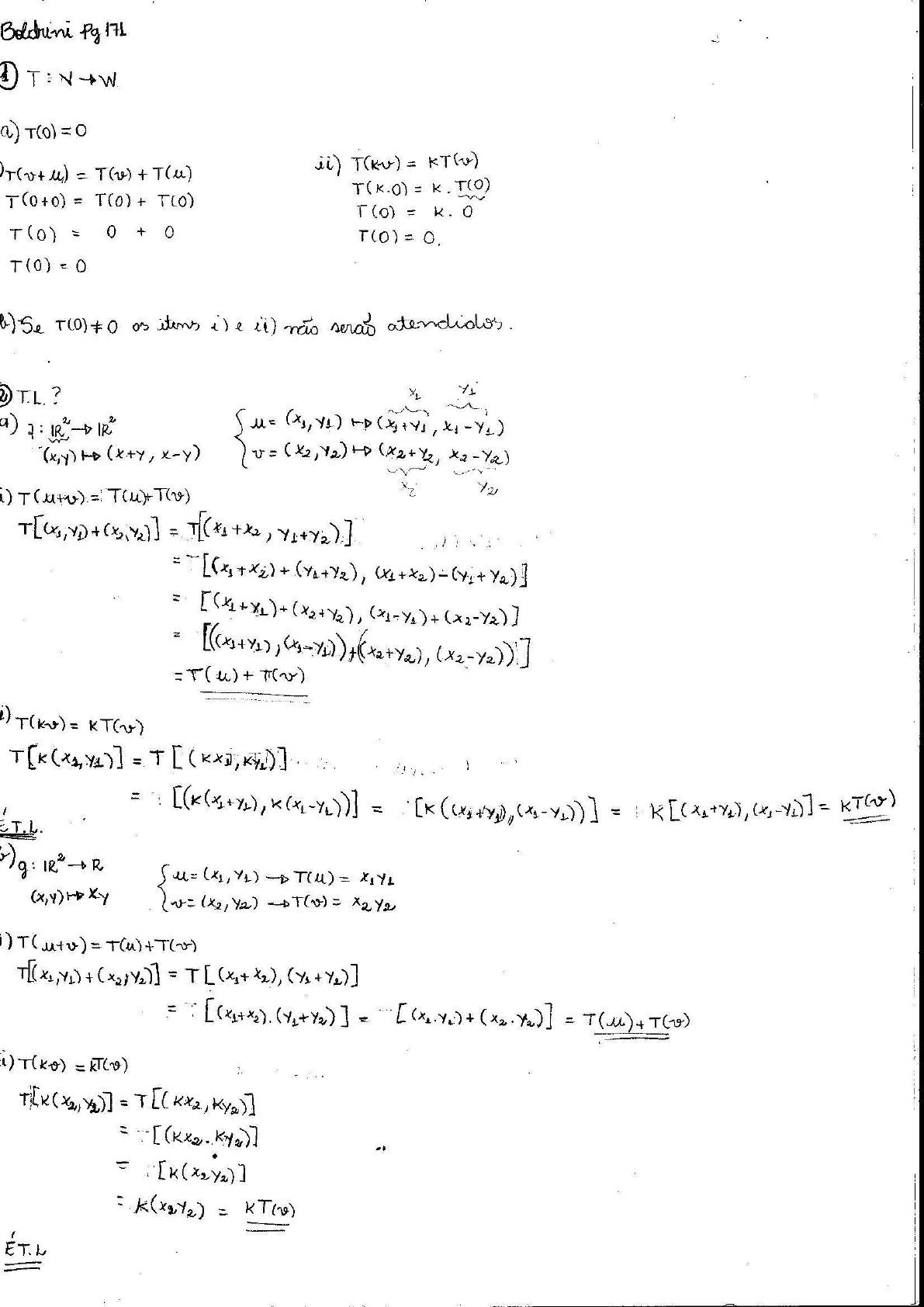 <p>1 a) = T(v) +T(u) ii) = T(0+0) = + = K. 0 + b) Se items i) ii) 2 T.L.? a) u= T Y2 = = = ] i) = = T [ = = : = T.L. R ) = (Y1+Y2)] (Y1+Y2) ] = = i) = = = = = KT(v) ET.L</p><p>c) h: M2 R T d b ] = det = (ad - 1) T(u+v) = T(u) + T + C2 d2 = T ) = (d2+d2) - (CL+C2) = + a2d2)+ - = [ + - = T(u) + T(v). ii) T(KN) = T b2 d2 1) = T Ka2 Kb2 1) = - = I K - ] = K = K.T(v) ET.L</p><p>= bx2+ex) + = + = = T(KV) = = = + = + = = T.L = 0-1 = + = T = ( 2 now da para the</p><p>N: IR IR 1x2+x2 T(u) = 1x1 + T (v) T(u) ou / saw r logo e T.L. 11)</p><p>3 a) T(1,0,0)= (20) = (1,1) T(0,0,1) = (0,-1) + = # Y-Z) # 4 b) = # = T(0,1) = T(0,-2) c) b=x-y 3a=x a=x 2a+b=y = + + = + = # = = = # (3,2,1) + = (3,2,1) = (3a, = d=0</p><p>T: IR 3 d) T R R 3 IR& = = 0 - = (a,a-2b) x A. 01 . = a=x 2x2 2 2 a-2b=y + (0,-2) (x,x) + -x+y) = x-x+y) = = (1,1) = = (3,1) = (a,a-2b) Sa=1 1-2b=1. b=0 =</p><p>T:U V co(v) # Im(T) {T(us) = T + + cuk) = au, bu2= = = # 10 T= ? [R] = = = 211 = 404 02 415 0-11 3x3 = 3x3 404 = 3x3 3x1 T(v) = (0,1,0) + = # = = = 1 2 -5/2</p><p>11 HR a) 10 A.[v]= a 2 2 2 = (a,-a+2b) = X Sa=x 3x+Y b=y+x 2 2 X+Y 2 x(1,0,-1)+ = 2 2 IR2 IR (-2,2,1) = (-2,2,1) = b+2c=2 101-2 101-2 0122 of -a+2b=1 0122 021-1 (4,-2,0) = 1014 d=4 012-2 =D 012-2 1200 0214 00-30 in -11 12 =</p><p>c) 10 01 10 2 3x2 + (0,1,0) + = a=1 = + T(0,2) = (0,0,1) GEO D (0,1,0), (0,0,1) } C2=1 # 12 = R : IR 2 IR2 212 2x3 R.S = = (5x+2y+z) (1,0) + = #</p><p>13 R: IR 2 = = 3x2 2x3 = = a=2, b=1; # b) = S(0,1,0)=(1,0) 3x2 [SOR] = # 14 T = (a+d,b+c) B= / a) T =</p><p>IR2 V 2 = ) A.v = 2 1 (2x+y) (x-y) 4x2 -1 1 -x Y (2x+y) = = 00 + (x-y) 00 10 + Y + + + 2x+y Y = = 2a+b a-b -a b 2a+b -a a-b b = 1 a-b = (F) a=o b=1 SI b=1 ha i possivel (ab) uma igualdade logo</p><p>15 T: 122 [T] = a) u (x,y) 0 -2 + { = x 2y Logo u= (x,y)= (x,-x) # b) v=? - = y) { a x Logo NEO # 16 a) E KEIR i) T(u) + T(v) = T(u+v) EW ii) KT(u) = EW > hogo Im(+) e S.V de W. b) Sexam u, v E K = ii) = T(uk)=0 ker(T) de V.</p><p>17 W S: V S(v) = T: V W = (v) = a) i) = + = + + + T(V2) = + + = ii) = = = Logo S+T i T.L # b) v) = T(u) = + = a + a = = a N = K = hogs. # e) X= {T IT:V Syam T(v), T(u) EIR i) + T(u) = E ii) K. = E x 8 prop de EV.</p><p>d) 2 W dim W=3 = = 6 18 : = = O T(v) = 2 = 2 2 =0 2 x+2x in Im(T) = / > dimIm(T) = 2 S(v) = => x (0,1,1) + Y (2,-1,0) = dim = 2 + Im($) = dim + 2 = 2 + Im(T) = + 2 =</p><p>19 a) Ker(T) : = = (z,x-y, -z) = x(3,1,0) = base de # b) dimIm(T) = ? 010 10-1 10-1 0-10 010 Im(T) LD 010 1.0-1 000 = (0,1,0) + + Z (1,0,-1) (0,1,0)} é base de Im(T) = dimIm(T) = 2 # 1 + = 3 = e) Im(T) = CD (T) dim Im(T) = 2 # Logo now e d) )</p><p>21 T: P3 P3 D at bx + T(v) = a2 + + a) + = + x + base de P3 b) = b2 + 2C2X + i) = ] = + + = + x2 = + + + = ii) = KT(u) = + [ K + = i T.L. # 2 = EP3 Ker(T)= = K {L} base dim 1 ast + (1,0,0) + Co, 2, + a4 (0,0,3) (T) = 3 {s, base de Im(+) #</p><p>22 D: P3 P3 i v= D(v) = > D = 11 + = + = D(u) + D = D(p(x)) = = T.L. T(v) = =0 (2c)+ + 3dx2 { C=O 2C + 6 dx 6d=0 DE P3 D = 0,0) = K1 + K2 (0,1,0,0) base de</p><p>23 = 40 20 B= 0-4 3x2 40 2y+ 2a-b=y 3x2 -0-4 4y+2x = 4 2 2 = 8y+4x 2y+x 4 = 2y+x -2x 2 2 4 4 5(x,y) = 2 = + = = -2y-3x) 2 = #</p><p>24 tem bases, B : {(1,0,0), Para A : Para = Y 3x3 3x1 3x2 3x1 A(v)= = 2y (0,1,0) + = = Ker TA = 0=0 ImTAi {(1,2,13} = LD -x) = = = 100 de 01 = Im = 06 by (0,6y, 0-1 -Y de {(s,0)} de</p>