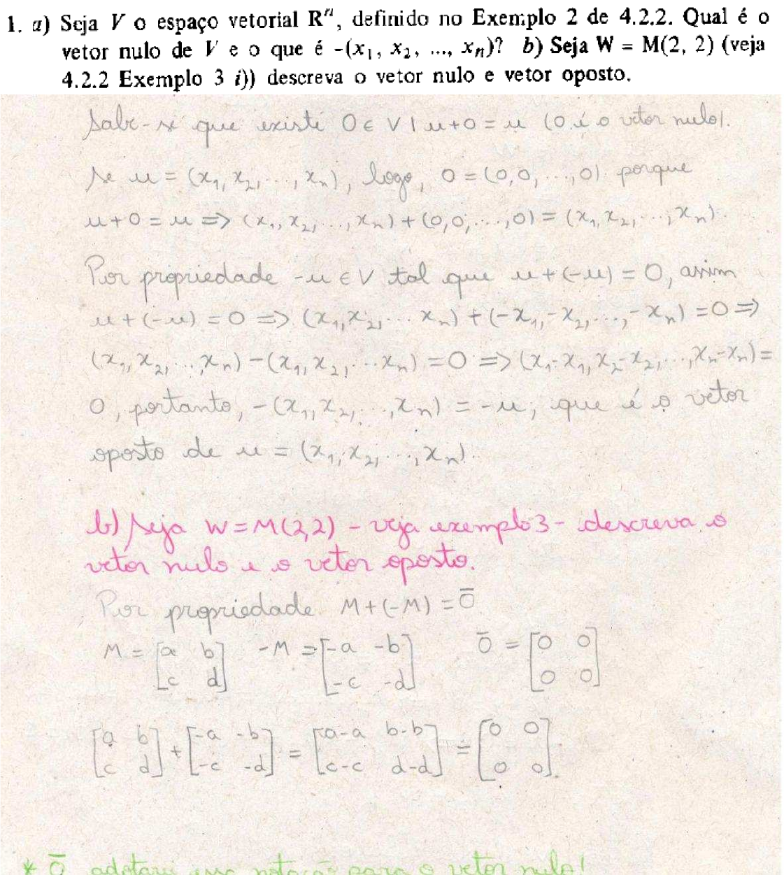 <p>Solução:</p><p>Como M3 = M1+M2, então [M1, M2, M3, M4]=[M 1, M2, M4] 1 −5−4 2</p><p>+ 1 1−1 5</p><p>+ 1 −7−5 1</p><p>= 0 0</p><p>0 0</p><p>+ + = 0−5 + − 7 = 0</p><p>−4 − − 5 = 0</p><p>2 + 5 + = 0</p><p>+</p><p>4</p><p>3</p><p>= 0 → = −4</p><p>3</p><p>− 1</p><p>3</p><p>= 0 → =</p><p>1</p><p>3</p><p>SPI=> 1, 2 , 4 , é . −4</p><p>3</p><p>. 1 +</p><p>1</p><p>3</p><p>. 2 + . 4 = 0 → ∀ ∈ �.</p><p>Como 4 =</p><p>4</p><p>3 1 − 1</p><p>3 2 => 1, 2, 4 = 1, 2</p><p>Como 1 , 2 , não são múltiplos, então são L.I. Logo, 1, 2 é a base de W.</p><p>Assim: dim W = 2.</p><p>Solução:</p><p>a) e b)</p><p>1 ∩ 2 = ; = , = , = = → ; = = =</p><p>1 ∩ 2 = ; ∈ � → 1 1</p><p>1 1</p><p>, 1 1</p><p>1 1</p><p>. � � 1 ∩ 2,</p><p>Então é base de 1 ∩ 2. dim 1 ∩ 2 = 1</p><p>Então: 1 = ; , ∈ � → 1 0</p><p>0 1</p><p>+ 0 1</p><p>1 0</p><p>; , ∈ � → 1 0</p><p>0 1</p><p>, 0 1</p><p>1 0</p><p>.</p><p>Então a base será: 1 0</p><p>0 1</p><p>, 0 1</p><p>1 0</p><p>= �</p><p>1</p><p>, ã . �, � ã é � .</p><p>1 0</p><p>1 0</p><p>, 0 1</p><p>0 1</p><p>= �</p><p>2</p><p>, ã . �, � ã é � .</p><p>dim 1 = 2; dim 2 = 2 → dim 1 + 2 = 2 + 2 − 1 = 3.</p><p>1 + 2 ≠ (2,2) então, 1 + 2 = 1 0</p><p>0 1</p><p>, 0 1</p><p>1 0</p><p>, 1 0</p><p>1 0</p><p>, 0 1</p><p>0 1</p><p>.</p><p>Solução:</p><p>a) ∝ =? → ∝ = −1</p><p>2</p><p>3</p><p>→ ∝ = � ∝∝´. ∝` → 1 1 0</p><p>0 −1 1</p><p>1 0 1</p><p>. −1</p><p>2</p><p>3</p><p>=> 1</p><p>1−4</p><p>.</p><p>b) ∝ = −1</p><p>2</p><p>3</p><p>, ∝` =? → ∝` = � ∝`</p><p>∝ . ∝ → � ∝`</p><p>∝ = � ∝`</p><p>∝ −1 =></p><p>−1</p><p>2</p><p>3</p><p>= 1 1 0</p><p>0 −1 1</p><p>1 0 −1</p><p>. → + = −1− + = 2− = 3</p><p>→ 2 = 4 → = 2 → = −3 → = −1</p><p>∝` = 2−3−1</p><p>.</p><p>Solução: � = 1,0 , (0,1)</p><p>�` = �1 ,�2 →</p><p>600 = 1</p><p>1</p><p>→ 1 = 600 → 3</p><p>2</p><p>600 = 1</p><p>1</p><p>→ 1 = 600 →</p><p>1</p><p>2</p><p>�1 = 1</p><p>2</p><p>,− 3</p><p>2</p><p>300 = 2</p><p>1</p><p>→ 2 = 300 →</p><p>1</p><p>2</p><p>300 = 2</p><p>1</p><p>→ 2 = 300 → 3</p><p>2</p><p>→ �2 = − 3</p><p>2</p><p>,</p><p>1</p><p>2</p><p>� = 1,0 , (0,1) → �´ = 1</p><p>2</p><p>,− 3</p><p>2</p><p>, 3</p><p>2</p><p>,</p><p>1</p><p>2</p><p>a) � ��`</p><p>=?</p><p>1</p><p>2</p><p>,− 3</p><p>2</p><p>= 1,0 + (0,1)</p><p>3</p><p>2</p><p>,</p><p>1</p><p>2</p><p>= 1,0 + (0,1)</p><p>� ��`</p><p>= →</p><p>=</p><p>1</p><p>2</p><p>= − 3</p><p>2</p><p>→</p><p>=</p><p>3</p><p>2</p><p>=</p><p>1</p><p>2</p><p>→</p><p>1</p><p>2</p><p>3</p><p>2− 3</p><p>2</p><p>1</p><p>2</p><p>.</p><p>b) � �`</p><p>�</p><p>= � ��` −1</p><p> 1,0 = 1</p><p>2</p><p>,− 3</p><p>2</p><p>+ 3</p><p>2</p><p>,</p><p>1</p><p>2</p><p> 0,1 = 1</p><p>2</p><p>,− 3</p><p>2</p><p>+ 3</p><p>2</p><p>,</p><p>1</p><p>2</p><p>1</p><p>2</p><p>+</p><p>3</p><p>2</p><p>= 1 3</p><p>− 3</p><p>2</p><p>+</p><p>1</p><p>2</p><p>= 0</p><p>→ 2 = 3 → =</p><p>3</p><p>2</p><p>− 3</p><p>2</p><p>= − 1</p><p>2</p><p>→ =</p><p>1</p><p>2</p><p>2 3</p><p>→ =</p><p>1 3</p><p>3</p><p>2</p><p>=</p><p>1</p><p>2</p><p>.</p><p>1</p><p>2</p><p>+</p><p>3</p><p>2</p><p>= 0 3</p><p>− 3</p><p>2</p><p>+</p><p>1</p><p>2</p><p>= 1</p><p>→ 2 = 1 → =</p><p>1</p><p>2</p><p>→ 1</p><p>2</p><p>= − 3</p><p>2</p><p>C=− 3</p><p>2</p><p>2</p><p>1</p><p>→ − 3</p><p>1</p><p>1</p><p>2</p><p>→ = − 3</p><p>2</p><p>.</p><p>� �`</p><p>�</p><p>=</p><p>1</p><p>2</p><p>− 3</p><p>2 3</p><p>2</p><p>1</p><p>2</p><p>→ � �`</p><p>�</p><p>= � ��` −1</p>