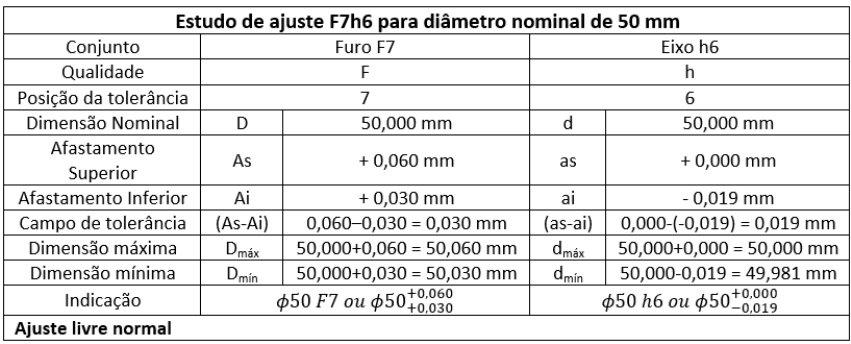 <p>ATIVIDADES DE ESTUDO 1 – DESENHO MECÂNICO E METROLOGIA</p><p>QUESTÃO 1</p><p>Como responsável técnico pelo setor de execução de projetos de uma empresa de peças mecânicas, foi solicitado que você avaliasse alguns conjuntos mecânicos. Para isso, você deverá avaliar, a partir de um determinado tipo de ajuste, quais as principais informações que o eixo e o furo especificado em projeto devem apresentar. A norma da ABNT NBR 6158 – Sistema de tolerâncias e ajustes, regulamenta e padroniza os ajustes e tolerâncias para peças que se encaixam. Por padrão, a norma tem indicações para “furos” e “eixos”, sendo furo referente a uma dimensão interna e eixo a uma dimensão externa, incluindo, também, elementos não cilíndricos. A partir da medida nominal indicada em projeto, e das medidas limites, temos os afastamentos superior e inferior. Diante dessas informações, avaliaremos a seguinte situação:</p><p>Após avaliar o modelo anterior, realize a mesma análise com as mesmas informações da tabela apresentada, para os seguintes acoplamentos mecânicos, indicando qual o tipo de ajuste:</p><p>1) H7j6 para diâmetro nominal de 55mm</p><p>2) H7r6 para diâmetro nominal de 55mm</p><p>Fonte: https://edisciplinas.usp.br/pluginfile.php/5688891/mod_resource/content/1/NBR%206158.pdf. Acessoem: 3 jul. 2024.</p><p>1) H7j6 para diâmetro nominal de 55mm</p><p>Estudo de ajuste H7j6 para diâmetro nominal de 55 mm</p><p>Conjunto</p><p>Furo H7</p><p>Eixo j6</p><p>Qualidade</p><p>H</p><p>j</p><p>Posição da tolerância</p><p>7</p><p>6</p><p>Dimensão Nominal</p><p>D</p><p>50,000 mm</p><p>d</p><p>50,000 mm</p><p>Afastamento Superior</p><p>As</p><p>+ 0,030 mm</p><p>as</p><p>+ 0,013 mm</p><p>Afastamento Inferior</p><p>Ai</p><p>+ 0,000 mm</p><p>ai</p><p>- 0,006 mm</p><p>Campo de tolerância</p><p>(As-ai)</p><p>0,030 – 0,000 = 0,030 mm</p><p>(as-ai)</p><p>0,013 – 0,006 = 0,007 mm</p><p>Dimensão Máxima</p><p>Dmáx</p><p>50,000 + 0,030 = 50,030 mm</p><p>dmáx</p><p>50,000 + 0,013 = 50,013 mm</p><p>Dimensão mínima</p><p>Dmín</p><p>50 + 0,000 = 50,000 mm</p><p>dmín</p><p>50,00 + (-0,006) = 49,994 mm</p><p>Indicação</p><p>Ajuste Livre Normal</p><p>2) H7r6 para diâmetro nominal de 55mm</p><p>Estudo de ajuste H7r6 para diâmetro nominal de 55 mm</p><p>Conjunto</p><p>Furo H7</p><p>Eixo r6</p><p>Qualidade</p><p>H</p><p>r</p><p>Posição da tolerância</p><p>7</p><p>6</p><p>Dimensão Nominal</p><p>D</p><p>50,000 mm</p><p>d</p><p>50,000 mm</p><p>Afastamento Superior</p><p>As</p><p>+ 0,030 mm</p><p>as</p><p>- 0,035 mm</p><p>Afastamento Inferior</p><p>Ai</p><p>+ 0,000 mm</p><p>ai</p><p>- 0,054 mm</p><p>Campo de tolerância</p><p>(As-ai)</p><p>0,030 – 0,000 = 0,030 mm</p><p>(as-ai)</p><p>-0,035 – 0,054 = -0,089 mm</p><p>Dimensão Máxima</p><p>Dmáx</p><p>50,000 + 0,030 = 50,030 mm</p><p>dmáx</p><p>50,000 +(– 0,035) = 49,965 mm</p><p>Dimensão mínima</p><p>Dmín</p><p>50,000 + 0,000 = 50,000 mm</p><p>dmín</p><p>50,000 + (-0,054) = 49,946 mm</p><p>Indicação</p><p>Ajuste Livre Normal</p><p>image1.emf</p>