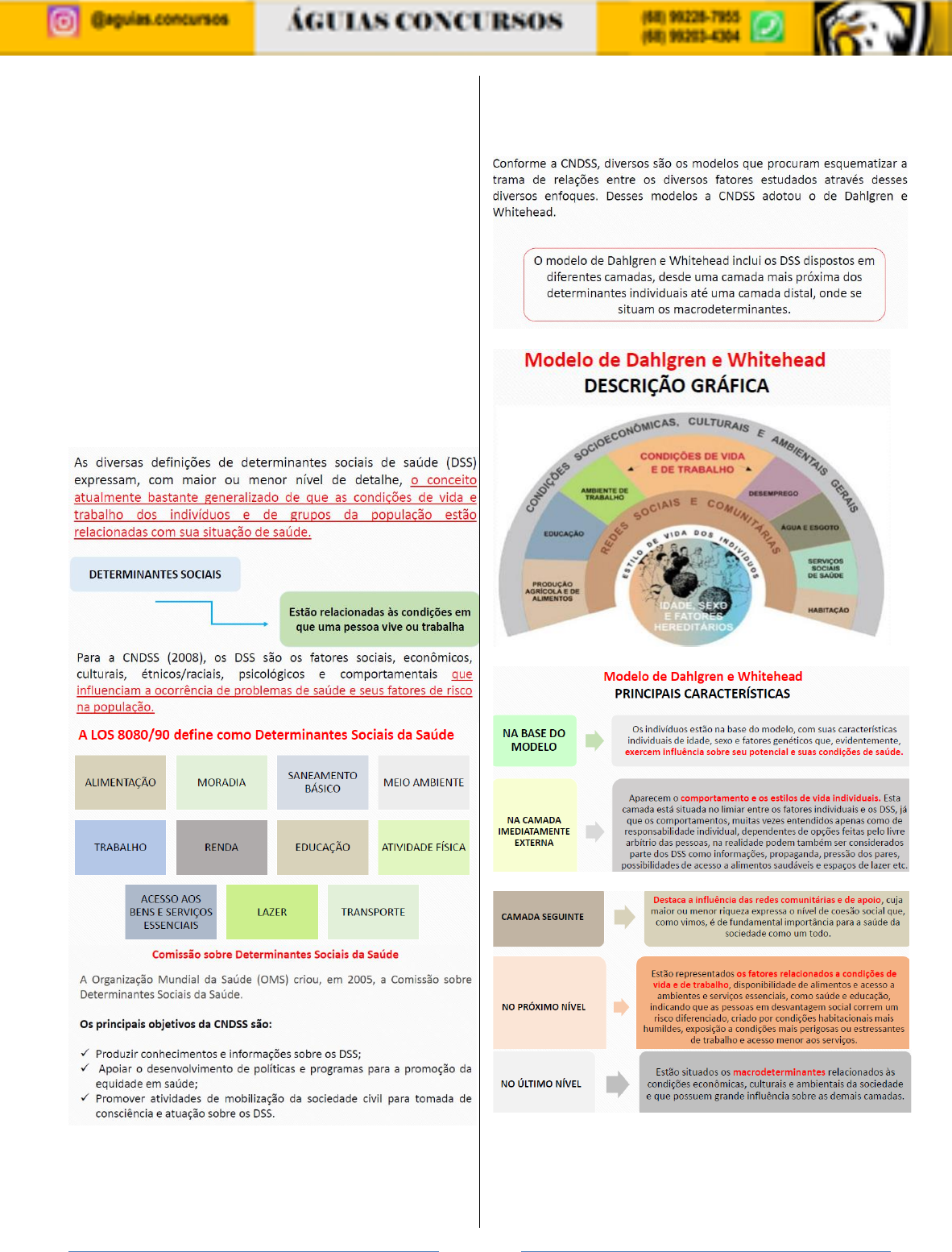 <p>Página 1</p><p>1</p><p>LEGISLAÇÃO GERAL</p><p>DETERMINANTES SOCIAIS DA SAÚDE</p><p>Aluno: _________________________________</p><p>Os Determinantes Sociais da Saúde (DSS) são</p><p>características socioeconômicas, culturais e ambientais</p><p>de uma sociedade que influenciam as condições de vida</p><p>e trabalho de todos os seus integrantes. Habitação,</p><p>saneamento, ambiente de trabalho, serviços de saúde e</p><p>de educação, e também a trama de redes sociais e</p><p>comunitárias são exemplos de determinantes sociais. Os</p><p>estilos de vida individuais, como hábito de fumar,</p><p>praticar exercícios e adotar dieta saudável, estão, em</p><p>parte, também condicionados por DSS como renda,</p><p>padrões culturais e mensagens publicitárias, entre</p><p>outros.</p><p>• O que é a CNDSS?</p><p>A Comissão Nacional sobre Determinantes Sociais da</p><p>Saúde (CNDSS) foi criada por Decreto Presidencial, em</p><p>março de 2006, e é composta por dezesseis especialistas</p><p>e personalidades da vida social, econômica, cultural e</p><p>científica do país. Sua criação e composição expressam</p><p>o reconhecimento de que a saúde é um bem público, a</p><p>ser construído com a participação solidária de todos os</p><p>setores da sociedade brasileira.</p><p>Página 2</p><p>2 FOCO SESACRE</p><p>Segundo a Organização Mundial da Saúde, “há ampla</p><p>evidência de que fatores sociais, incluindo educação,</p><p>situação de emprego, nível de renda, gênero e etnia têm</p><p>uma influência marcante sobre a saúde de uma pessoa.</p><p>Em todos os países – sejam de baixa, média ou alta renda</p><p>– existem grandes disparidades no estado de saúde dos</p><p>diferentes grupos sociais. Quanto mais baixa a posição</p><p>socioeconômica de um indivíduo, maior o risco de</p><p>problemas de saúde.</p><p>As iniquidades em saúde são diferenças sistemáticas</p><p>no estado de saúde de diferentes grupos populacionais.</p><p>Essas desigualdades têm custos sociais e econômicos</p><p>significativos tanto para os indivíduos quanto para as</p><p>sociedades. As iniquidades em saúde são diferenças no</p><p>estado de saúde ou na distribuição dos recursos de saúde</p><p>entre diferentes grupos populacionais, decorrentes das</p><p>condições sociais em que as pessoas nascem, crescem,</p><p>vivem, trabalham e envelhecem. As iniquidades em</p><p>saúde são injustas e poderiam ser reduzidas com a</p><p>combinação certa de políticas governamentais”.</p><p>Iniquidades em saúde referem-se:</p><p>A diferenças desnecessárias e evitáveis e que são ao</p><p>mesmo tempo consideradas injustas e indesejáveis. O</p><p>termo iniquidade tem, assim, uma dimensão ética e</p><p>social” (WHITEHEAD, 1992).</p><p>Determinantes Sociais Estruturais e Intermediários</p><p>Um dos modelos elaborados pela comissão nacional</p><p>sobre os determinantes sociais da saúde-CNDSS,</p><p>identifica os dois principais grupos de determinantes</p><p>(estruturais e intermediários) e fornece exemplos</p><p>específicos para cada um.</p><p>Os determinantes estruturais são aqueles que geraram</p><p>estratificação social. Eles incluem fatores</p><p>tradicionalmente ligados à renda e à educação. Hoje</p><p>também é vital reconhecer gênero, etnicidade e</p><p>sexualidade como estratificadores sociais.</p><p>(CNDSS,2005)</p><p>Os determinantes intermediários surgem a partir da</p><p>configuração da estratificação social subliminar, e</p><p>determinam as diferenças na exposição e</p><p>vulnerabilidade a condições comprometedoras da saúde.</p><p>(CNDSS,2005)</p><p>De acordo com a (CNDSS,2005), na categoria de</p><p>determinantes intermediários:</p><p>Condições de vida, condições de trabalho,</p><p>disponibilidade de alimento, comportamentos de</p><p>população e barreiras para a adoção de um estilo de vida</p><p>saudável.</p><p>O recolhimento de amostras relevantes da população</p><p>para análise e tomada de ação sobre os determinantes</p><p>específicos pode ser feito de várias formas. Introduzimos</p><p>dois exemplos de grupos selecionados (1) por maior</p><p>vulnerabilidade (crianças) e (2) por distribuição</p><p>geográfica (favelados).</p><p>Vamos praticar!!!</p><p>No que diz respeito aos “Determinantes Sociais da</p><p>Saúde (DSS)”, assinale a alternativa incorreta.</p><p>a) Iniquidades em saúde estão diretamente ligadas as</p><p>diferenças existentes na sociedade, que também são</p><p>consideradas como injustas e indesejáveis</p><p>b) Pode-se definir os determinantes sociais da saúde</p><p>como sendo os fatores e mecanismos através dos quais</p><p>as condições sociais afetam a saúde e que</p><p>potencialmente podem ser alterados através de ações</p><p>baseadas em informação</p><p>c) A Comissão Nacional sobre os Determinantes Sociais</p><p>de Saúde (CNDSS) é composta por 8 médicos</p><p>especialistas de cada área da medicina; essa constituição</p><p>diversificada é uma expressão do reconhecimento de que</p><p>a saúde é um bem público, construído com a participação</p><p>solidária de todos os setores da sociedade brasileira</p><p>d) Enquanto os fatores individuais são importantes para</p><p>identificar que indivíduos nos seus grupos possuem</p><p>maior risco, as diferenças nos níveis de saúde entre</p><p>grupos e países estão mais relacionadas com outros</p><p>fatores, principalmente o quão desigual é a distribuição</p><p>de renda</p><p>e) Pode-se definir os determinantes sociais da saúde</p><p>como sendo as condições de vida e trabalho dos</p><p>indivíduos estão relacionadas com sua saúde</p><p>No que se refere aos “Determinantes Sociais da Saúde</p><p>(DSS)”, assinale a alternativa incorreta.</p><p>a) Pode-se definir os determinantes sociais da saúde</p><p>como sendo os fatores sociais, econômicos, culturais,</p><p>étnico-raciais, psicológicos e comportamentais