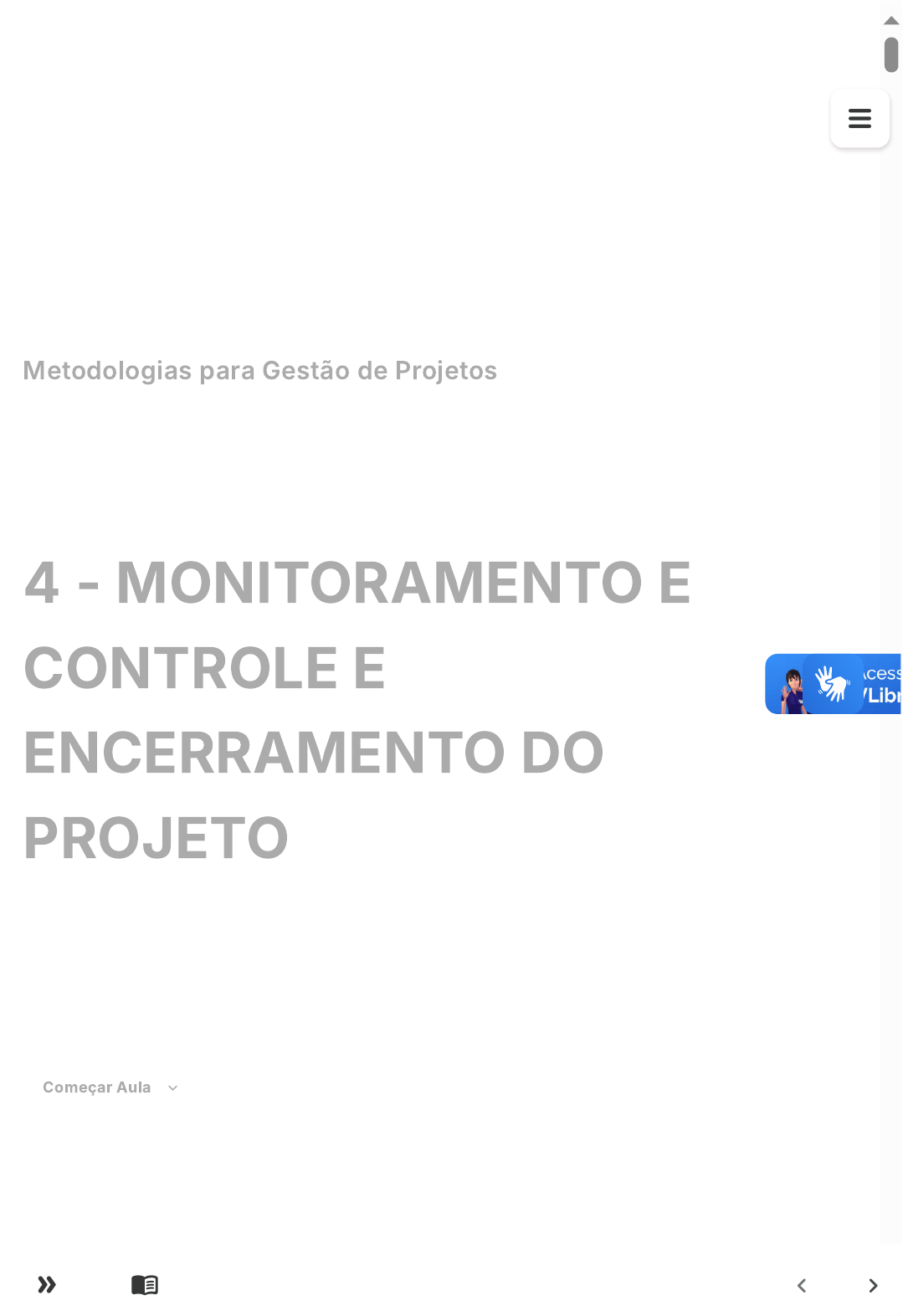 <p>Metodologias para Gestão de Projetos</p><p>Começar Aula </p><p>4 - MONITORAMENTO E</p><p>CONTROLE E</p><p>ENCERRAMENTO DO</p><p>PROJETO</p><p> </p><p></p>