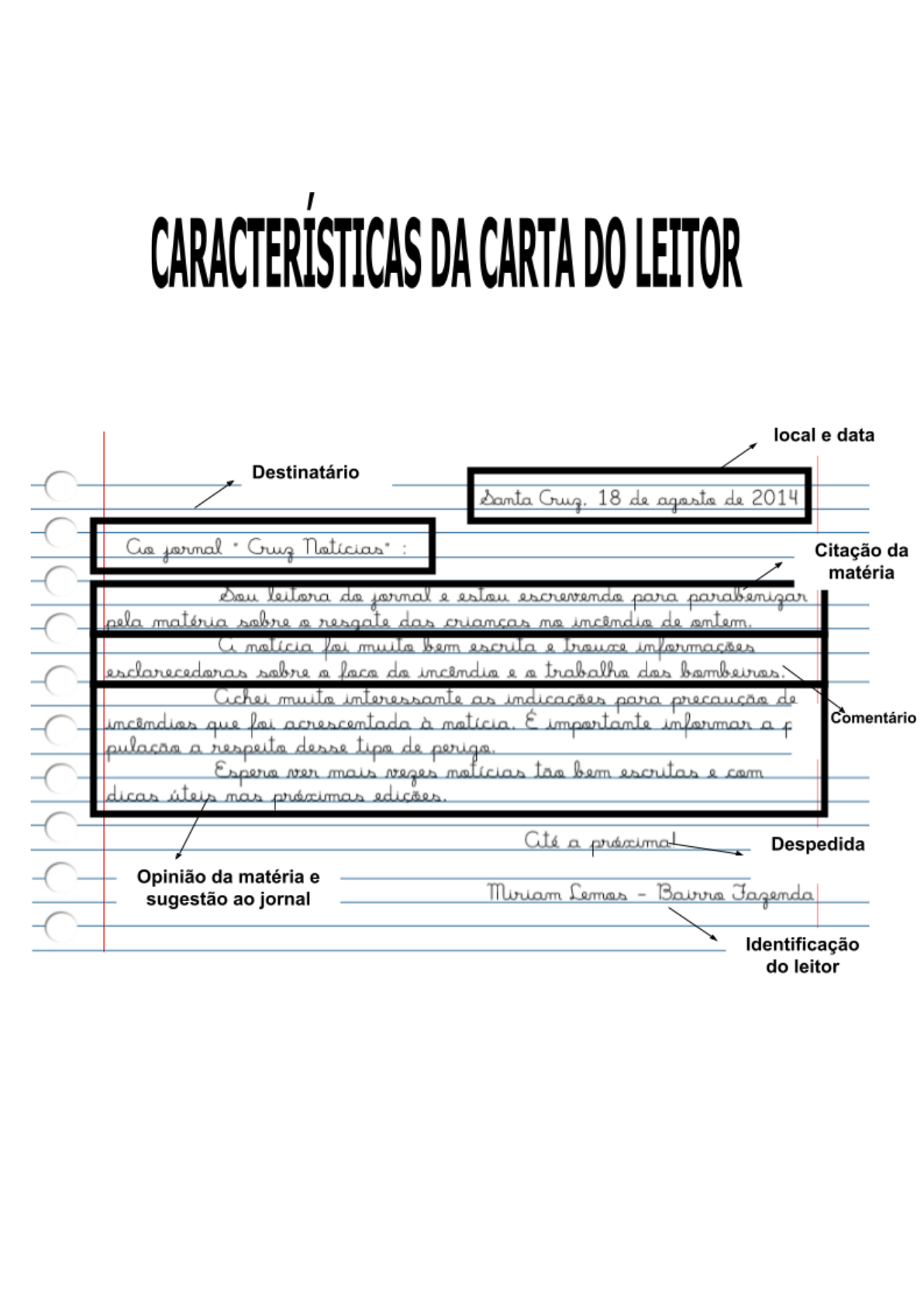 <p>NOME:____________________________________ ____ º ANO: ______</p><p>PROFESSOR(A): ______________________ DATA: _____/______/______</p><p>Até agora, vimos cartas de leitor na forma em que aparecem já prontas,</p><p>na revista ou jornal. Vamos conhecer “os bastidores” da carta, ou seja, os</p><p>elementos presentes na carta original, antes de passar pela edição:</p><p>Veja que a carta do leitor apresenta o mesmo formato de uma carta</p><p>comum, porém o assunto é voltado à matéria lida. Na carta de leitor é preciso</p><p>ter, no texto, apresentação, desenvolvimento e finalização.</p><p>ESCOLA MUNICIPAL DE ENSINO BÁSICO IVO DE BONA</p><p>AV. Francisco Roveri, 505 – Almerinda Chaves – Jundiaí – SP</p><p>Tel. 4582-3400 E-mail: emebibona@jundiai.sp.gov.br</p><p>NOME:_______________________________________ ____ º ANO: ______</p><p>PROFESSOR(A): ______________________ DATA: _____/______/______</p><p>CARTA AO LEITOR</p><p>QUAL A MELHOR FORMA DE NOS LIVRARMOS DO LIXO?</p><p>Revista CHC – Acervo Histórico – Blog do Rex - Edição</p><p>A leitora Nicole Bastos Smaniotto, 11 anos, enviou a seguinte pergunta:</p><p>Qual a melhor forma de nos livrarmos do lixo, já que produzimos tanto?</p><p>Para encontrar a resposta, falei com o pesquisador Emilio Eigenheer, da Universidade Federal</p><p>Fluminense. A primeira coisa que ele me disse foi: “antes de falar na melhor forma de nos</p><p>livrarmos do lixo, é preciso saber que podemos diminuir esta enorme quantidade”.</p><p>Isso é possível, por exemplo, se cuidarmos melhor das nossas coisas para que elas durem mais</p><p>tempo e não virem lixo tão cedo. Também não precisamos comprar coisas que não precisamos</p><p>de verdade só porque estão na moda. Se cuidarmos bem do que temos e comprarmos menos,</p><p>teremos menos lixo para jogar fora depois.</p><p>Mesmo assim, sempre produziremos algum</p><p>lixo. Então, fique de olho na melhor forma de</p><p>descartá-lo.UAL A MELHOR FO</p><p>Em casa, se você mora em uma cidade que já</p><p>tem coleta seletiva, separe os materiais secos</p><p>– papel, plástico, metal e vidro – para que</p><p>sejam encaminhados para a reciclagem.</p><p>Outra opção, caso não haja coleta seletiva, é</p><p>doar esses materiais para catadores e</p><p>campanhas de recolhimento.</p><p>Mas o que fazer com o lixo que sobrou? “Ele</p><p>deve ser bem ensacado e deixado no local e horário certos para ser recolhido pela prefeitura da</p><p>cidade. Depois, deve ser levado para um aterro sanitário, onde será enterrado em local</p><p>especialmente preparado”, diz Emílio.</p><p>Se você não conhece pontos de coleta de materiais recicláveis, pode começar a sua pesquisa</p><p>pela página da Recicloteca. Outra opção é tentar entrar em contato com a sua prefeitura e</p><p>pedir informações. Ah! Lembre-se que itens como pilhas e baterias devem ter um descarte</p><p>diferenciado.</p><p>https://chc.org.br/acervo/qual-a-melhor-forma-de-nos-livrarmos-do-lixo/ (Acesso em</p><p>07/09/2023) Matéria publicada em 15.06.2012</p><p>mailto:emebibona@jundiai.sp.gov.br</p><p>http://www.recicloteca.org.br/QuemRecebe.asp</p><p>https://chc.org.br/acervo/qual-a-melhor-forma-de-nos-livrarmos-do-lixo/</p><p>Leia a matéria sobre o DESCARTE DE LIXO e escreva a seguir</p><p>duas opiniões sobre ela. Pode ser sobre qualquer parte do texto lido.</p><p>_______________________________________________________________</p><p>_______________________________________________________________</p><p>_______________________________________________________________</p><p>Escreva uma carta de leitor para a revista responsável pelo artigo.</p><p>Antes de escrever, vamos fazer um rascunho dos três elementos</p><p>principais de sua carta:</p><p>Agora, escreva sua carta original de leitor. Use os indicadores a seguir</p><p>para não esquecer nenhum elemento de sua carta. Ao terminar, “cheque” cada</p><p>elemento.</p><p>Para melhorar ainda mais sua escrita, o professor irá trocar as cartas</p><p>entre os colegas da turma. Você lerá a carta de leitor de seu colega e atribuir</p><p>uma nota para ela. Se encontrar erros ou achar difícil de ler alguma parte, faça</p><p>uma anotação no campo ‘comentários’. Depois, destroque e arrume o que</p><p>estiver errado em sua carta.</p><p>O campo abaixo é a avaliação de SUA CARTA DE LEITOR, feita por</p><p>seu amigo:</p><p>0 – A carta não aborda o assunto.</p><p>1 – A carta aborda o assunto de modo geral, apenas citando a notícia.</p><p>2 – A carta apenas comenta ou apenas dá opinião sobre a notícia.</p><p>3 – A carta cita a matéria e dá uma opinião.</p><p>4 – A carta cita a matéria, comenta o assunto e dá uma opinião.</p>