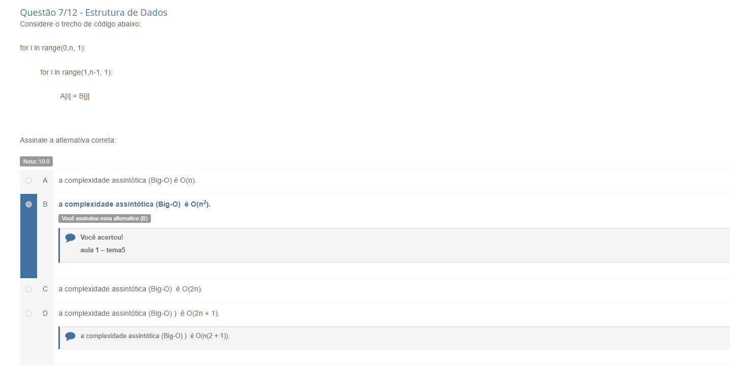 <p>Questão 7/12 - Estrutura de Dados Considere o trecho de código abaixo: for i in range(0,n, 1): for i in range(1,n-1 1): A[i] = B[j] Assinale a alternativa correta: Nota: 10.0 A a complexidade assintótica (Big-O) é O(n). B a complexidade assintótica (Big-O) é Você assinalou essa alternativa (B) Você acertou! aula 1 - tema5 a complexidade assintótica (Big-O) é O(2n). a complexidade assintótica a complexidade</p>