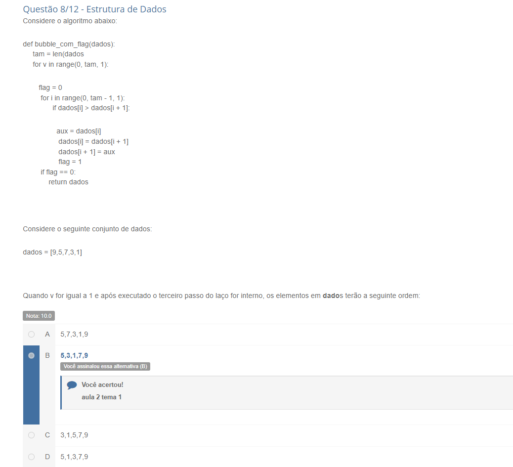 <p>Questão 8/12 - Estrutura de Dados Considere algoritmo abaixo: def tam = len(dados for V in 1): flag 0 for in if flag = 1 if flag == 01 return dados Considere seguinte conjunto de dados = [9,5,7,3,1] Quando V for igual a 1 e após executado terceiro passo do laço for os elementos em dados terão a seguinte ordem: Nota: 10.0 A 5,7,3,1,9 B 5,3,1,7,9 Você assinalou essa alternativa (B) Você acertou! aula 2 tema 1 C D</p>