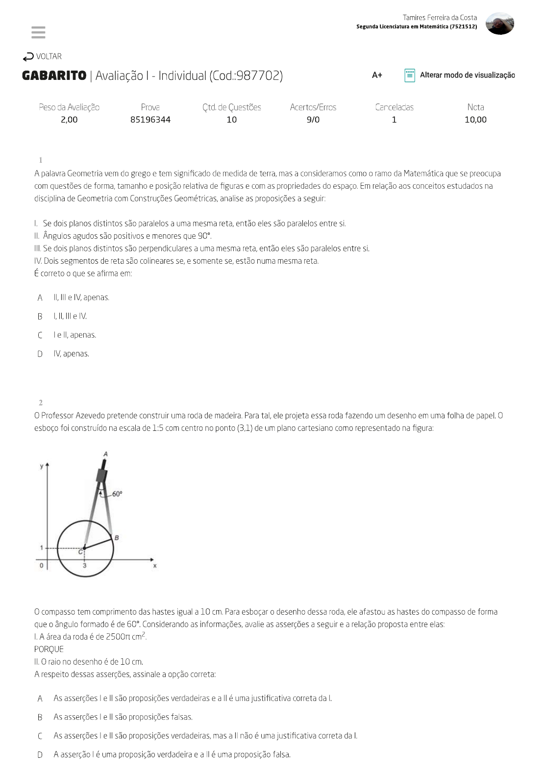 <p>Tamires Ferreira da Costa Segunda Licenciatura em Matemática (7521512) VOLTAR GABARITO Avaliação Individual (Cod.:987702) A+ Alterar modo de visualização Peso da Avaliação Prova Qtd. de Questões Acertos/Erros Canceladas Nota 2,00 85196344 10 9/0 1 10,00 1 A palavra Geometria vem do grego e tem significado de medida de terra, mas a consideramos como ramo da Matemática que se preocupa com questões de forma, tamanho e posição relativa de figuras e com as propriedades do espaço. Em relação aos conceitos estudados na disciplina de Geometria com Construções Geométricas, analise as proposições a seguir: Se dois planos distintos são paralelos a uma mesma reta, então eles são paralelos entre si. II. agudos são positivos e menores que III. Se dois planos distintos são perpendiculares a uma mesma reta, então eles são paralelos entre si. IV. Dois segmentos de reta são colineares se, e somente se, estão numa mesma reta. É correto que se afirma em: A II, III e IV apenas. B III e IV. C e II, apenas. D 2 0 Professor Azevedo pretende construir uma roda de madeira. Para tal, ele projeta essa roda fazendo um desenho em uma folha de papel. esboço foi construído na escala de 1:5 com centro no ponto (3,1) de um plano cartesiano como representado na figura: A y B 1 0 3 compasso tem comprimento das hastes igual a 10 cm. Para esboçar desenho dessa roda, ele afastou as hastes do compasso de forma que ângulo formado é de Considerando as informações, avalie as asserções a seguir e a relação proposta entre elas: A área da roda é de PORQUE II. raio no desenho é de 10 cm. A respeito dessas asserções, assinale a opção correta: A As asserções e são proposições verdadeiras e a é uma justificativa correta da B As asserções e são proposições falsas. C As asserções e são proposições verdadeiras, mas a não é uma justificativa correta da I. D A asserção é uma proposição verdadeira e a é uma proposição falsa.</p><p>Tamires Ferreira da Costa Segunda Licenciatura em Matemática (7521512) Com base nas informações acima e considerando que a expressão "torneira 1/4 de volta" indica um arco, a fração que representa esse arco é: A B C D 4 Através de uma minuciosa investigação das propriedades geométricas inerentes aos triângulos, estabelecemos uma base sólida para conduzir uma análise criteriosa das afirmações subsequentes. De acordo com nossos estudos a respeito dos triângulos, analise as afirmativas a seguir: Cada ângulo agudo de um triângulo retângulo isósceles mede Se o ângulo do vértice de um triângulo isósceles mede então, cada ângulo da base mede III. Se a altura de um triângulo equilátero mede 6/3 cm, então, seu lado mede 12 cm. IV. No triângulo equilátero o incentro e ortocentro coincidem, mas baricentro não coincide com eles. É correto que se afirma em: A e IV, apenas B II, III e IV, C e III, apenas. D e III, apenas. 5 Na figura a seguir, temos uma circunferência de centro no ponto 0. Além disso, triângulo PCD é equilátero, de altura OP e as retas PA, PB e EF são tangentes à circunferência nos pontos A, B e E respectivamente.</p><p>Tamires Ferreira da Costa Segunda Licenciatura em Matemática (7521512) E F A B Considerando as informações, avalie as asserções a seguir C D e a relação proposta entre elas: Os triângulos OBD e POD são PORQUE II. segmento EF é paralelo ao segmento respeito dessas asserções, assinale a opção correta: A As asserções e são proposições verdadeiras, mas a não é uma justificativa correta da I. B A asserção é uma proposição verdadeira e a é uma proposição falsa. C As asserções e são proposições verdadeiras e a é uma justificativa correta da D As asserções e são proposições falsas. 6 Abaixo, na figura, temos um retângulo ABCD de base 10cm e altura 15cm. Ele foi dividido em 2 quadrados, AJHF e JBIH, de lados 5cm, e 2 retângulos, FHED e HICE, de bases 5cm e alturas 10cm. Além disso, Gé ponto de interseção do segmento AE com segmento FH. D E C G H A B Assim, com base nesta informação, avalie as asserções a seguir e a relação proposta entre elas: A medida GH é igual a 5/3 cm. PORQUE II. Os triângulos EGH e AEJ são A respeito dessas asserções, assinale a opção correta: A As asserções e são proposições verdadeiras, mas a não é uma justificativa correta da I. B As asserções e são proposições verdadeiras e all é uma justificativa correta da ( A asserção é uma proposição falsa e a é uma proposição D As asserções | e são proposições falsas.</p><p>Tamires Ferreira da Costa Segunda Licenciatura em Matemática (7521512) d h 3/4h Sabendo que a câmara escura tem profundidade d, qual será a distância entre a pessoa e sua imagem? A 4d/3. B 3dh/4. C 7d/3. D 4dh/3. 8 As posições relativas entre duas figuras geométricas constituem estudo das possibilidades de interação entre esses elementos no espaço em que ocupam. Em outras palavras, as figuras são classificadas de acordo com número ou com a forma como as interações entre elas ocorrem. Neste sentido e de acordo com nossos estudos a respeito das posições relativas entre retas e planos, analise as alternativas e assinale a correta: A Dois planos perpendiculares a um terceiro são perpendiculares entre si. Retas pertencentes a um mesmo plano são concorrentes. C Duas retas não concorrentes são paralelas. D Duas retas distintas perpendiculares a um mesmo plano são paralelas entre si. Ao construir um trilho para a passagem de um trem, os engenheiros se deparam com a situação apresentada a seguir: 9 B A Teriam que então, atravessar a montanha ou contorná-la. Se contornassem desvio seria muito grande e com isso custo se elevaria. A sugestão seria fazer um túnel reto que atravesse a montanha. Para calcular a distância de um lado a outro da montanha AB um teodolito foi posicionado no ponto C verificando um ângulo de 75° em relação aos pontos A e B. As di