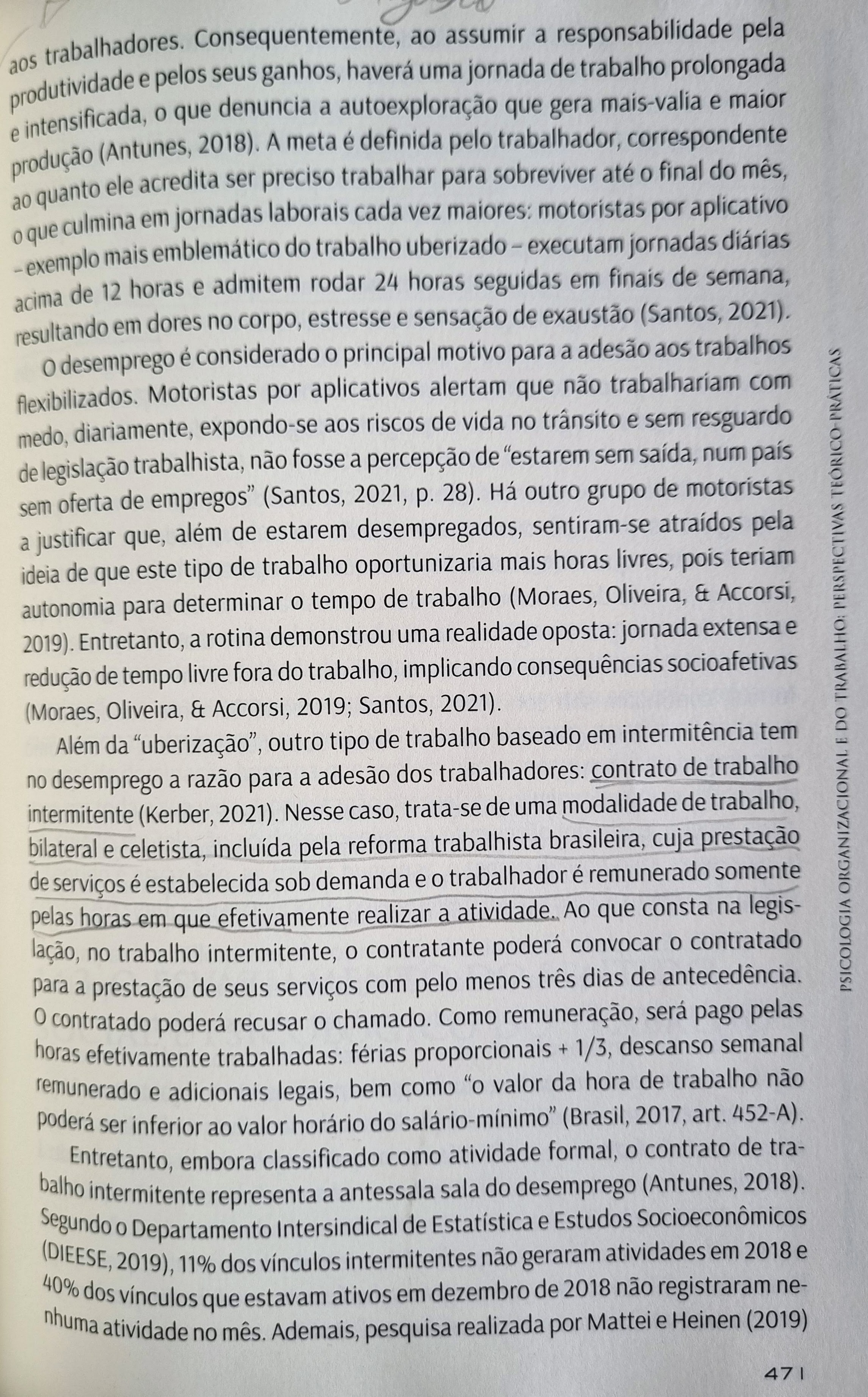 <p>trabalhadores. Consequentemente, ao assumir a responsabilidade pela aos produtividade e pelos seus ganhos, haverá uma jornada de trabalho prolongada intensificada, o que denuncia a autoexploração que gera mais-valia e maior produção e (Antunes, 2018). A meta é definida pelo trabalhador, correspondente quanto ele acredita ser preciso trabalhar para sobreviver até final do mês, ao culmina em jornadas laborais cada vez maiores: motoristas por aplicativo 0 que mais emblemático do trabalho uberizado executam jornadas diárias acima de 12 horas e admitem rodar 24 horas seguidas em finais de semana, resultando em dores no corpo, estresse e sensação de exaustão (Santos, 2021). desemprego é considerado o principal motivo para a adesão aos trabalhos flexibilizados. Motoristas por aplicativos alertam que não com medo, diariamente, expondo-se aos riscos de vida no trânsito e sem resguardo de legislação trabalhista, não fosse a percepção de "estarem sem saída, num país sem oferta de empregos" (Santos, 2021, p. 28). Há outro grupo de motoristas a justificar que, além de estarem desempregados, sentiram-se atraídos pela ideia de que este tipo de trabalho oportunizaria mais horas livres, pois teriam autonomia para determinar o tempo de trabalho (Moraes, Oliveira, & Accorsi, 2019). Entretanto, a rotina demonstrou uma realidade oposta: jornada extensa e redução de tempo livre fora do trabalho, implicando consequências socioafetivas (Moraes, Oliveira, & Accorsi, 2019; Santos, 2021). Além da "uberização", outro tipo de trabalho baseado em tem no desemprego a razão para a adesão dos trabalhadores: contrato de trabalho intermitente (Kerber, 2021). Nesse caso, trata-se de uma modalidade de trabalho, bilateral e celetista, incluída pela reforma trabalhista brasileira, cuja prestação de serviços é estabelecida sob demanda e o trabalhador é remunerado somente pelas horas em que efetivamente realizar a atividade. Ao que consta na legis- lação, no trabalho intermitente, o contratante poderá convocar o contratado para a prestação de seus serviços com pelo menos três dias de antecedência. 0 contratado poderá recusar o chamado. Como remuneração, será pago pelas horas efetivamente trabalhadas: férias proporcionais + 1/3, descanso semanal remunerado e adicionais legais, bem como valor da hora de trabalho não poderá ser inferior ao valor horário do salário-mínimo" (Brasil, 2017, art. 452-A). Entretanto, embora classificado como atividade formal, o contrato de tra- balho intermitente representa a antessala sala do desemprego (Antunes, 2018). Segundo Departamento Intersindical de Estatística e Estudos Socioeconômicos (DIEESE, 2019), 11% dos vínculos intermitentes não geraram atividades em 2018 e 40% dos vínculos que estavam ativos em dezembro de 2018 não registraram ne- nhuma atividade no mês. Ademais, pesquisa realizada por Mattei e Heinen (2019) 47</p>