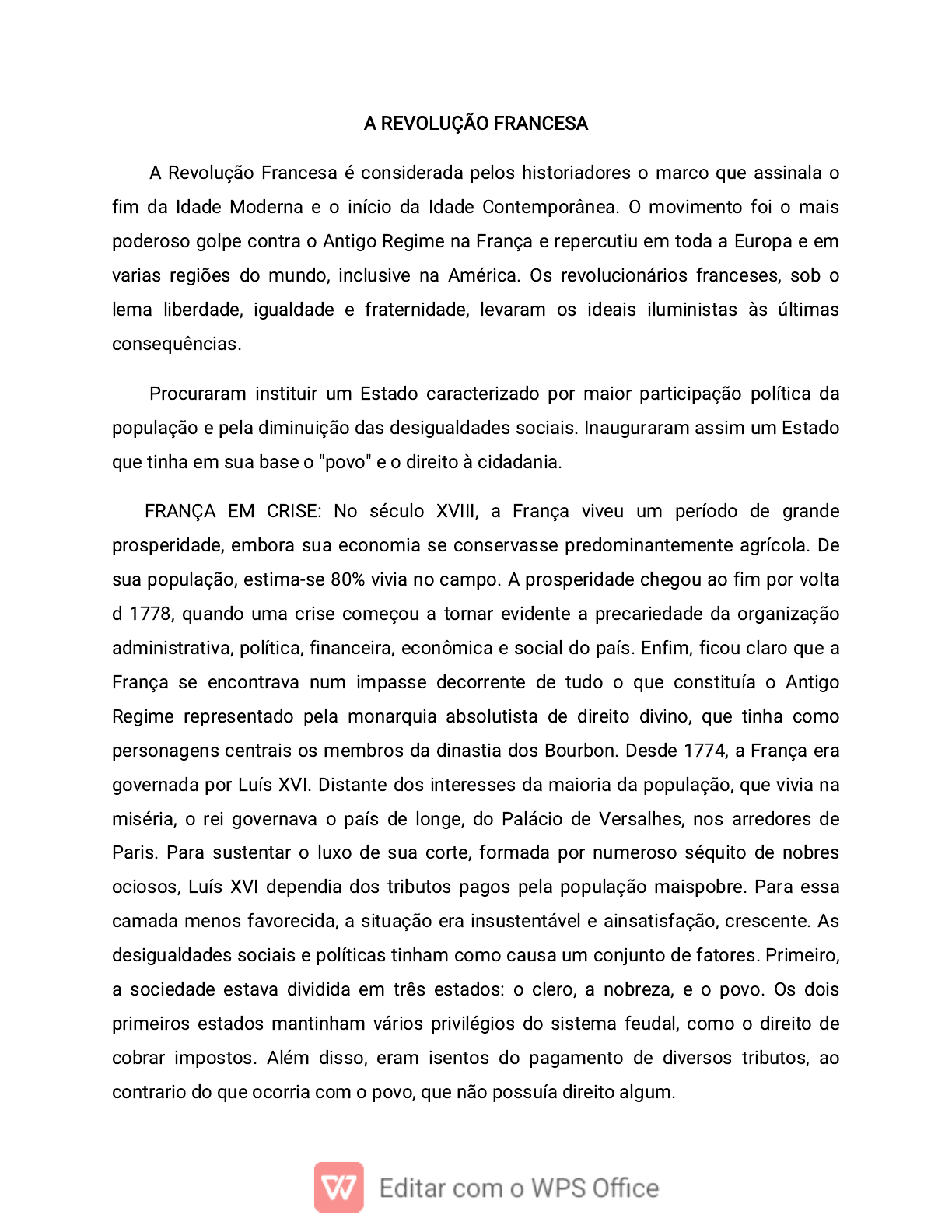 <p>A REVOLUÇÃO FRANCESA</p><p>A Revolução Francesa é considerada pelos historiadores o marco que assinala o</p><p>fim da Idade Moderna e o início da Idade Contemporânea. O movimento foi o mais</p><p>poderoso golpe contra o Antigo Regime na França e repercutiu em toda a Europa e em</p><p>varias regiões do mundo, inclusive na América. Os revolucionários franceses, sob o</p><p>lema liberdade, igualdade e fraternidade, levaram os ideais iluministas às últimas</p><p>consequências.</p><p>Procuraram instituir um Estado caracterizado por maior participação política da</p><p>população e pela diminuição das desigualdades sociais. Inauguraram assim um Estado</p><p>que tinha em sua base o "povo" e o direito à cidadania.</p><p>FRANÇA EM CRISE: No século XVIII, a França viveu um período de grande</p><p>prosperidade, embora sua economia se conservasse predominantemente agrícola. De</p><p>sua população, estima-se 80% vivia no campo. A prosperidade chegou ao fim por volta</p><p>d 1778, quando uma crise começou a tornar evidente a precariedade da organização</p><p>administrativa, política, financeira, econômica e social do país. Enfim, ficou claro que a</p><p>França se encontrava num impasse decorrente de tudo o que constituía o Antigo</p><p>Regime representado pela monarquia absolutista de direito divino, que tinha como</p><p>personagens centrais os membros da dinastia dos Bourbon. Desde 1774, a França era</p><p>governada por Luís XVI. Distante dos interesses da maioria da população, que vivia na</p><p>miséria, o rei governava o país de longe, do Palácio de Versalhes, nos arredores de</p><p>Paris. Para sustentar o luxo de sua corte, formada por numeroso séquito de nobres</p><p>ociosos, Luís XVI dependia dos tributos pagos pela população maispobre. Para essa</p><p>camada menos favorecida, a situação era insustentável e ainsatisfação, crescente. As</p><p>desigualdades sociais e políticas tinham como causa um conjunto de fatores. Primeiro,</p><p>a sociedade estava dividida em três estados: o clero, a nobreza, e o povo. Os dois</p><p>primeiros estados mantinham vários privilégios do sistema feudal, como o direito de</p><p>cobrar impostos. Além disso, eram isentos do pagamento de diversos tributos, ao</p><p>contrario do que ocorria com o povo, que não possuía direito algum.</p>