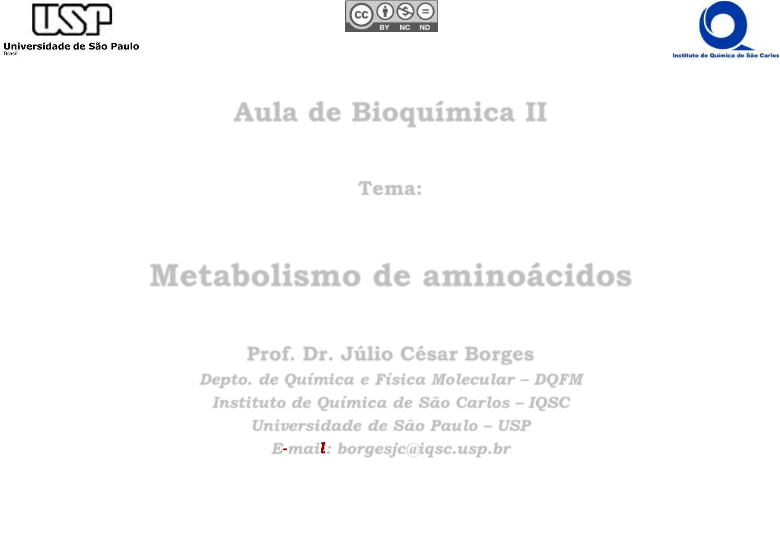 <p>Aula de Bioquímica II</p><p>Tema:</p><p>Metabolismo de aminoácidos</p><p>Prof. Dr. Júlio César Borges</p><p>Depto. de Química e Física Molecular – DQFM</p><p>Instituto de Química de São Carlos – IQSC</p><p>Universidade de São Paulo – USP</p><p>E-mail: borgesjc@iqsc.usp.br</p><p>Metabolismo do Nitrogênio</p><p> Nitrogênio: para ser utilizado pelos animais, ele precisa ser fixado</p><p>- Grande custo energético</p><p> Reduzido de N2 para NH3 (amônia)</p><p>- Somente algumas poucas bactérias de solo ou que vivem associadas a raízes de plantas</p><p>podem converter N2 a NH3- Fixação de nitrogênio</p><p> As rotas de biossíntese de aminoácido e nucleotídeos necessitam de nitrogênio na forma</p><p>solúvel e reacional</p><p> Amônia, aminoácidos e nucleotídeos são utilizados de forma econômica pela maioria dos</p><p>organismos</p><p>- Reciclagem menor custo energético</p><p>- Excedente é eliminado na natureza</p><p>Principais formas de excreção de N</p><p>Degradação oxidativa de Aminoácidos</p><p>Energia metabólica gerada nos tecidos</p><p>1. Metabolismo dos carboidratos e lipídeos (~90%)</p><p>2. Metabolismo dos aminoácidos (~10%)</p><p>- Derivados de proteínas endógenas e exógenas</p><p> Carnívoros – podem obter até 90% de energia proveniente de aminoácidos</p><p> Herbívoros – obtém apenas uma pequena fração de suas necessidades energéticas a</p><p>partir dessa via</p><p> Microrganismos – retiram aminoácidos do ambiente e podem utilizá-lo como fonte de</p><p>energia</p><p> Plantas – utilizado para biossíntese de proteínas. Raramente ou nunca oxidam</p><p>aminoácidos</p><p>Aminoácidos podem sofrer degradação oxidativa:</p><p>1. Dieta rica em proteínas – excedente de aminoácidos podem ser catabolizados e virar</p><p>gordura ou glicogênio</p><p>2. Durante o jejum ou diabetes mellitus – proteínas são utilizadas como combustível</p><p>3. Protein turnover – Durante a dinâmica normal de síntese e degradação das proteínas no</p><p>organismo</p><p>Degradação das proteínas da dieta</p><p>A digestão de proteínas pode ser dividida em fases</p><p>1º: Gástrica 2º: Pancreática 3º: Intestinal</p><p>Estômago Gastrina</p><p> HCl do suco gástrico –</p><p>elimina microrganismos e</p><p>desnatura proteínas.</p><p> O muco da mucosa gástrica</p><p>protege da agressão do suco</p><p>gástrico.</p><p> A desnaturação torna as</p><p>proteínas mais susceptíveis à</p><p>hidrólise de proteases</p><p>gástricas.</p><p> Pepsinas são enzimas que</p><p>são ativas em pH ácido.</p><p> Pepsina é gerada a partir da</p><p>pró-enzima pepsinogênio</p><p>(remoção de 46 aminoácidos</p><p>do NH2 terminal), em pH</p><p>abaixo de 2.</p><p> Pepsina corta proteínas (em</p><p>Phe, Trp e Tyr) em peptídeos</p><p>menores e aminoácidos livres</p><p>Intestino delgado</p><p> A chegada do hidrolisado no</p><p>Intestino induz a secreção de</p><p>secretina e liberação de HCO3</p><p>- pelo</p><p>pâncreas, neutraliza o pH no</p><p>intestino delgado</p><p> Secreção de colescitocinina</p><p>induz a secreção de precursores de</p><p>enzimas pancreáticas:</p><p>Quimiotripsinogênio, Tripsinogênio</p><p>e Procarboxipeptidase</p><p> Enteropepdidase ativa o</p><p>tripsinogênio em tripsina, esta</p><p>ativa as outras pró-enzimas</p><p> Carboxipeptidase e</p><p>aminopeptidase hidrolisam os</p><p>peptídeos em aminoácidos livres</p><p> Os aminoácidos livres entram</p><p>nos capilares sanguíneos das</p><p>vilosidades e são transportados até</p><p>o fígado.</p><p>Renovação de proteínas</p><p> As proteínas estão em constante processo de degradação e síntese.</p><p>- A concentração proteica geral mantém-se constante no indivíduo adulto e saudável.</p><p>- Entretanto há grande variação na velocidade de degradação para cada proteína.</p><p>- Os aminoácidos excedentes são oxidados e o N é excretado NH3 é tóxico.</p><p>Renovação</p><p> Renovação de cerca de 400 g de proteínas/dia</p><p>em um adulto com dieta adequada</p><p> Eliminação de N correspondente a 100 g de</p><p>proteína/dia</p><p> Como 400 g são renovados, os 100 g eliminados</p><p>devem ser repostos pela alimentação</p><p> Aminoácidos em excesso não são armazenados</p><p>para utilização futura e tampouco excretados</p><p>São convertidos em intermediários metabólicos,</p><p>como piruvato, oxalacetato, acetil-coenzima</p><p>(Acetil-CoA) e -cetoglutarato</p><p>HMG-CoA redutase 3.0</p><p>Degradação das proteínas intracelulares</p><p>Processo controlado para regular a fisiologia das células</p><p> Proteínas regulatórias que tem sua concentração ajustada às variações de condições do</p><p>organismo.</p><p> Remoção de proteínas defeituosas, velhas, mal enoveladas, etc.</p><p>Dois processos para a degradação intracelular de proteína:</p><p>1) Catepsinas: proteases de lisossomos. Atuam na degradação de proteínas de membrana,</p><p>extracelulares e proteínas de meia-vida longa.</p><p>2) Proteólise mediada pelo sistema ubiquitina-proteassoma: processo mais geral que ocorre</p><p>no citoplasma.</p><p> A ubiquitina é uma</p><p>proteína de 76</p><p>aminoácidos de organismos</p><p>eucarióticos</p><p> Encontrada livre ou</p><p>covalentemente ligada a</p><p>outras proteínas</p><p> Proteína abundante e</p><p>muito conservada</p><p>evolutivamente</p><p>Papel da adição</p><p>de ubiquitina</p><p> marcador para</p><p>degradação de</p><p>proteínas pelo</p><p>proteossoma 26S</p><p>Degradação das proteínas intracelulares</p><p>Principais alvos da via</p><p>ubiquitina-proteossoma</p><p> Proteínas velhas</p><p> Proteínas mutantes</p><p> Proteínas enoveladas</p><p>erroneamente ou</p><p>desnaturadas</p><p> Reguladores de</p><p>processos bioquímicos</p><p>(proliferação, diferenciação,</p><p>resposta inflamatória e</p><p>imunológica)</p><p>Doenças genéticas,</p><p>neurogenerativas e tumores</p><p>malignos sã