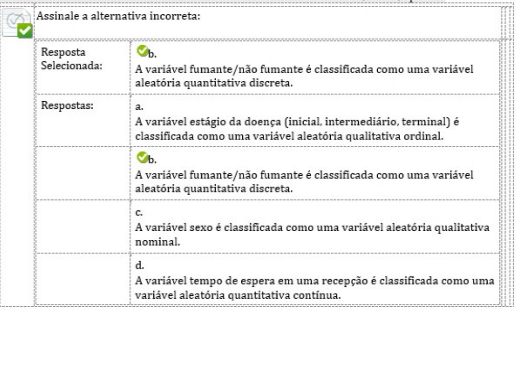 <p>Assinale a alternativa incorreta: Resposta b. Selecionada: A variável fumante/não fumante é classificada como uma variável aleatória quantitativa discreta. Respostas: a. A variável estágio da doença (inicial, terminal) é classificada como uma variável aleatória qualitativa ordinal. b. A variável fumante/não fumante é classificada como uma variável aleatória quantitativa discreta. c. A variável sexo é classificada como uma variável aleatória qualitativa nominal. d. A variável tempo de espera em uma recepção é classificada como uma variável aleatória quantitativa contínua.</p>