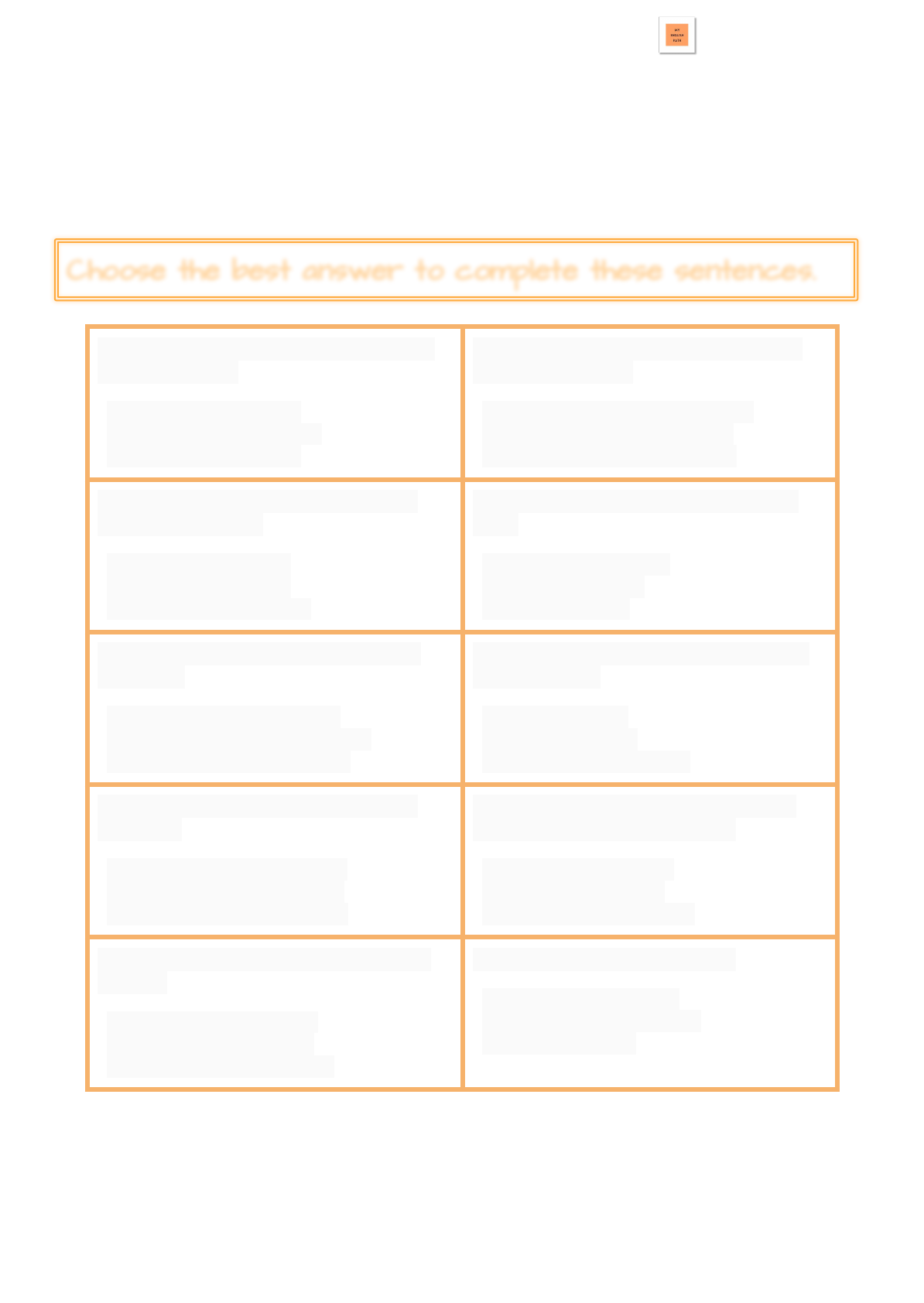<p>If Clause Type 1</p><p>Name: ___________________________________ Date: __________________________</p><p>Grade & Section: ___________________________ Teacher: ________________________</p><p>myenglishpath.com</p><p>Choose the best answer to complete these sentences.</p><p>1. If we ... the money tomorrow, we ... a</p><p>flight to Canada.</p><p>❏ receive - will book</p><p>❏ will receive - booked</p><p>❏ will receive - book</p><p>2. If you ..., yourself, your father ... you</p><p>with him next time.</p><p>❏ won't behave - doesn't take</p><p>❏ don't behave - won't take</p><p>❏ won't behave - won't take</p><p>3. If you ... this manual, you ... how to</p><p>install the machine.</p><p>❏ check - will learn</p><p>❏ will check - learn</p><p>❏ checked - will learn</p><p>4. You ... home early if you ... this task</p><p>early.</p><p>❏ can go- will finish</p><p>❏ can go - finish</p><p>❏ go - finished</p><p>5. If you ... to our service, you ... extra</p><p>discounts.</p><p>❏ subscribe - will receive</p><p>❏ will subscribe - will receive</p><p>❏ subscribed - will receive</p><p>6. If nobody ... the watch, please ... it to</p><p>the front office.</p><p>❏ claim - send</p><p>❏ claims - send</p><p>❏ will claim - will send</p><p>7. If you ... a passport, you ... to other</p><p>countries.</p><p>❏ won't have - can't travel</p><p>❏ don't have - can't travel</p><p>❏ didn't have - can't travel</p><p>8. The teacher ... you a better grade if</p><p>you ... the assignment on time.</p><p>❏ gives - will submit</p><p>❏ will give - submit</p><p>❏ can give - submitted</p><p>9. If they ... me an email by tomorrow, I</p><p>... them.</p><p>❏ didn't send - will call</p><p>❏ don't send - will call</p><p>❏ won't send- would call</p><p>10. If he ... tired, he ... running.</p><p>❏ feels - should stop</p><p>❏ will feel - should stop</p><p>❏ felt - will stop</p><p>If Clause Type 1</p><p>Name: ___________________________________ Date: __________________________</p><p>Grade & Section: ___________________________ Teacher: ________________________</p><p>myenglishpath.com</p><p>Answer Key:</p><p>1. If we ... the money tomorrow, we ... a</p><p>flight to Canada.</p><p>❏ receive - will book</p><p>2. If you ..., yourself, your father ... you</p><p>with him next time.</p><p>❏ don't behave - won't take</p><p>3. If you ... this manual, you ... how to</p><p>install the machine.</p><p>❏ check - will learn</p><p>4. You ... home early if you ... this task</p><p>early.</p><p>❏ can go - finish</p><p>5. If you ... to our service, you ... extra</p><p>discounts.</p><p>❏ subscribe - will receive</p><p>6. If nobody ... the watch, please ... it to</p><p>the front office.</p><p>❏ claims - send</p><p>7. If you ... a passport, you ... to other</p><p>countries.</p><p>❏ don't have - can't travel</p><p>8. The teacher ... you a better grade if</p><p>you ... the assignment on time.</p><p>❏ will give - submit</p><p>9. If they ... me an email by tomorrow, I</p><p>... them.</p><p>❏ don't send - will call</p><p>10. If he ... tired, he ... running.</p><p>❏ feels - should stop</p>