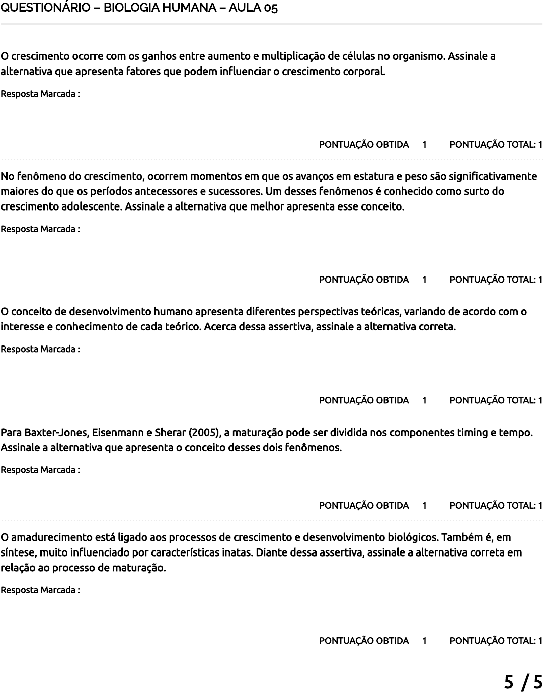<p>5 / 5</p><p>QUESTIONÁRIO – BIOLOGIA HUMANA – AULA 05</p><p>PONTUAÇÃO TOTAL: 1PONTUAÇÃO OBTIDA 1</p><p>O crescimento ocorre com os ganhos entre aumento e multiplicação de células no organismo. Assinale a</p><p>alternativa que apresenta fatores que podem in�uenciar o crescimento corporal.</p><p>Resposta Marcada :</p><p>Além do potencial genético, o crescimento é in�uenciado por variáveis como as qualidades sociais, econômicas e</p><p>políticas do contexto de cada indivíduo.</p><p>PONTUAÇÃO TOTAL: 1PONTUAÇÃO OBTIDA 1</p><p>No fenômeno do crescimento, ocorrem momentos em que os avanços em estatura e peso são signi�cativamente</p><p>maiores do que os períodos antecessores e sucessores. Um desses fenômenos é conhecido como surto do</p><p>crescimento adolescente. Assinale a alternativa que melhor apresenta esse conceito.</p><p>Resposta Marcada :</p><p>O surto do crescimento adolescente é um fenômeno que ocorre no início da puberdade, fase na qual meninos e</p><p>meninas experimentam ganhos rápidos em estatura, que tende a ser acompanhada pelo peso corporal.</p><p>PONTUAÇÃO TOTAL: 1PONTUAÇÃO OBTIDA 1</p><p>O conceito de desenvolvimento humano apresenta diferentes perspectivas teóricas, variando de acordo com o</p><p>interesse e conhecimento de cada teórico. Acerca dessa assertiva, assinale a alternativa correta.</p><p>Resposta Marcada :</p><p>Cada uma das diferentes teorias do desenvolvimento possui grande relevância para o entendimento desse</p><p>fenômeno. No entanto, nenhuma delas é considerada completa, uma vez que enfatizaram aspectos especí�cos.</p><p>PONTUAÇÃO TOTAL: 1PONTUAÇÃO OBTIDA 1</p><p>Para Baxter-Jones, Eisenmann e Sherar (2005), a maturação pode ser dividida nos componentes timing e tempo.</p><p>Assinale a alternativa que apresenta o conceito desses dois fenômenos.</p><p>Resposta Marcada :</p><p>O timing se refere à época em que as mudanças ocorrem, e o tempo, à taxa em que a maturação se processa.</p><p>PONTUAÇÃO TOTAL: 1PONTUAÇÃO OBTIDA 1</p><p>O amadurecimento está ligado aos processos de crescimento e desenvolvimento biológicos. Também é, em</p><p>síntese, muito in�uenciado por características inatas. Diante dessa assertiva, assinale a alternativa correta em</p><p>relação ao processo de maturação.</p><p>Resposta Marcada :</p><p>A maturação sugere que as mudanças desenvolvimentais ocorrem em uma ordem �xa de progressão, mas de</p><p>ritmo variado.</p><p>Total de Pontos</p><p>23/08/2024, 17:28 Course Status – AVA Saúde Unifaveni</p><p>https://ava.saude.unifaveni.com.br/course-status/ 1/1</p>