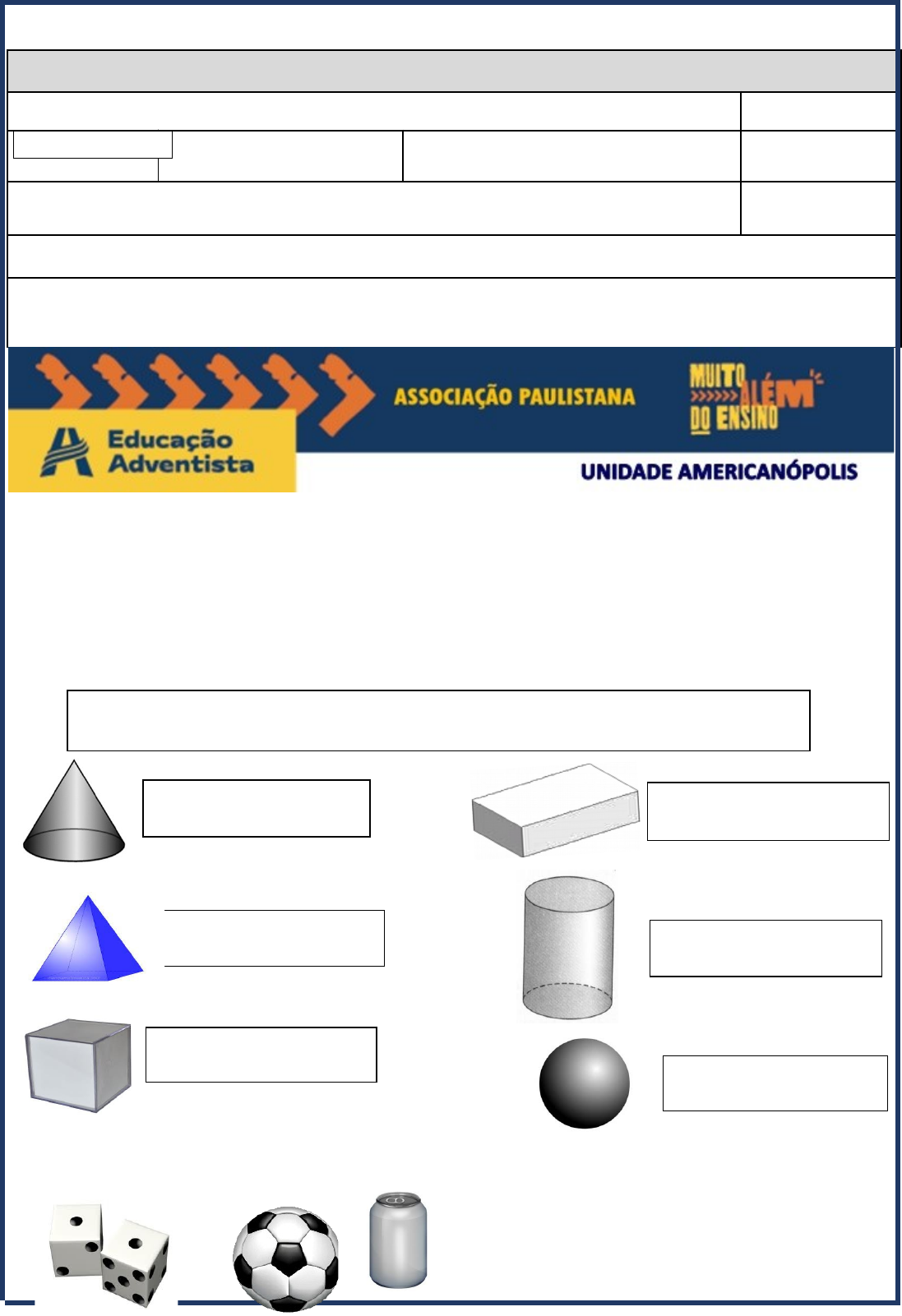 <p>Questionário de Matemática – P1</p><p>Nome:</p><p>Série: 4º F</p><p>1º Bimestre</p><p>Data: / /</p><p>Professora: Maricélia Castro</p><p>Valor: 8,0</p><p>Conteúdo:</p><p>Cap. 1 – Imagens e movimentos (sólidos geométricos espaciais).</p><p>Valor Alcançado:</p><p>Assinatura do aluno:</p><p>Habilidades:</p><p>H5 – Identificar semelhanças e diferenças entre figuras geométricas espaciais, reconhecendo suas características.</p><p>De acordo com o que estudamos em classe, responda as questões.</p><p>As imagens serão projetadas.</p><p>1) Escreva nos espaços o nome correto de cada sólido geométrico, seguindo o banco de palavras. (1,5) ( )</p><p>Cilindro Cone Cubo Esfera Paralelepípedo Pirâmide</p><p>Assinale a alternativa correta, conforme podemos afirmar que os objetos abaixo lembram os sólidos geométricos, respectivamente: (1,0) ( )</p><p>a) Pirâmide, Cone e Esfera.</p><p>b) Cubo, Esfera e Cilindro.</p><p>c) Paralelepípedo, Esfera e Cone.</p><p>d) Cone, Pirâmide e Cilindro.</p><p>2) Observe as imagens e classifique-as, assinalando a alternativa correta. (1,0) ( )</p><p>a) A primeira e a segunda figuras são pirâmides, a terceira e a quarta são</p><p>prismas.</p><p>b) A primeira e a segunda são figuras geométricas planas, enquanto a terceira e</p><p>a quarta são figuras geométricas de corpos redondos.</p><p>c) A primeira figura é um prisma triangular, a segunda figura é um prisma</p><p>hexagonal, a terceira figura é uma pirâmide hexagonal e a quarta figura é uma</p><p>pirâmide pentagonal.</p><p>d) Todas as figuras representam prismas.</p><p>3) Observe as imagens abaixo e escreva o nome dos sólidos geométricos representadas por elas. (1,0) ( )</p><p>Chapéu de aniversário:</p><p>Bola:</p><p>Dado:</p><p>Latinha:</p><p>Caixa de fósforos:</p><p>4) As pirâmides são nomeadas de acordo com a quantidade de lados de sua base. Analise as figuras e classifique-as de acordo com a sua base. (1,5) ( )</p><p>5) Observe as figuras e complete a tabela. (2,0) ( )</p><p>SÓLIDOS</p><p>GEOMÉTRICOS</p><p>NÚMERO DE FACES</p><p>NÚMERO DE VÉRTICES</p><p>NÚMERO DE ARESTAS</p><p>TORÇO POR VOCÊ!</p><p>VOCÊ É CAPAZ!</p><p>image1.jpg</p><p>image2.jpeg</p><p>image3.jpeg</p><p>image4.png</p><p>image5.jpeg</p><p>image6.jpeg</p><p>image60.jpeg</p><p>image7.jpeg</p><p>image8.png</p><p>image9.jpeg</p><p>image10.jpeg</p><p>image11.png</p><p>image12.png</p><p>image13.jpeg</p><p>image14.png</p><p>image15.jpeg</p><p>image150.jpeg</p><p>image100.jpeg</p><p>image16.jpeg</p><p>image17.png</p><p>image18.jpeg</p><p>image19.png</p><p>image20.png</p><p>image21.png</p><p>image210.png</p><p>image22.png</p><p>image23.jpeg</p><p>image24.png</p><p>image25.jpeg</p>