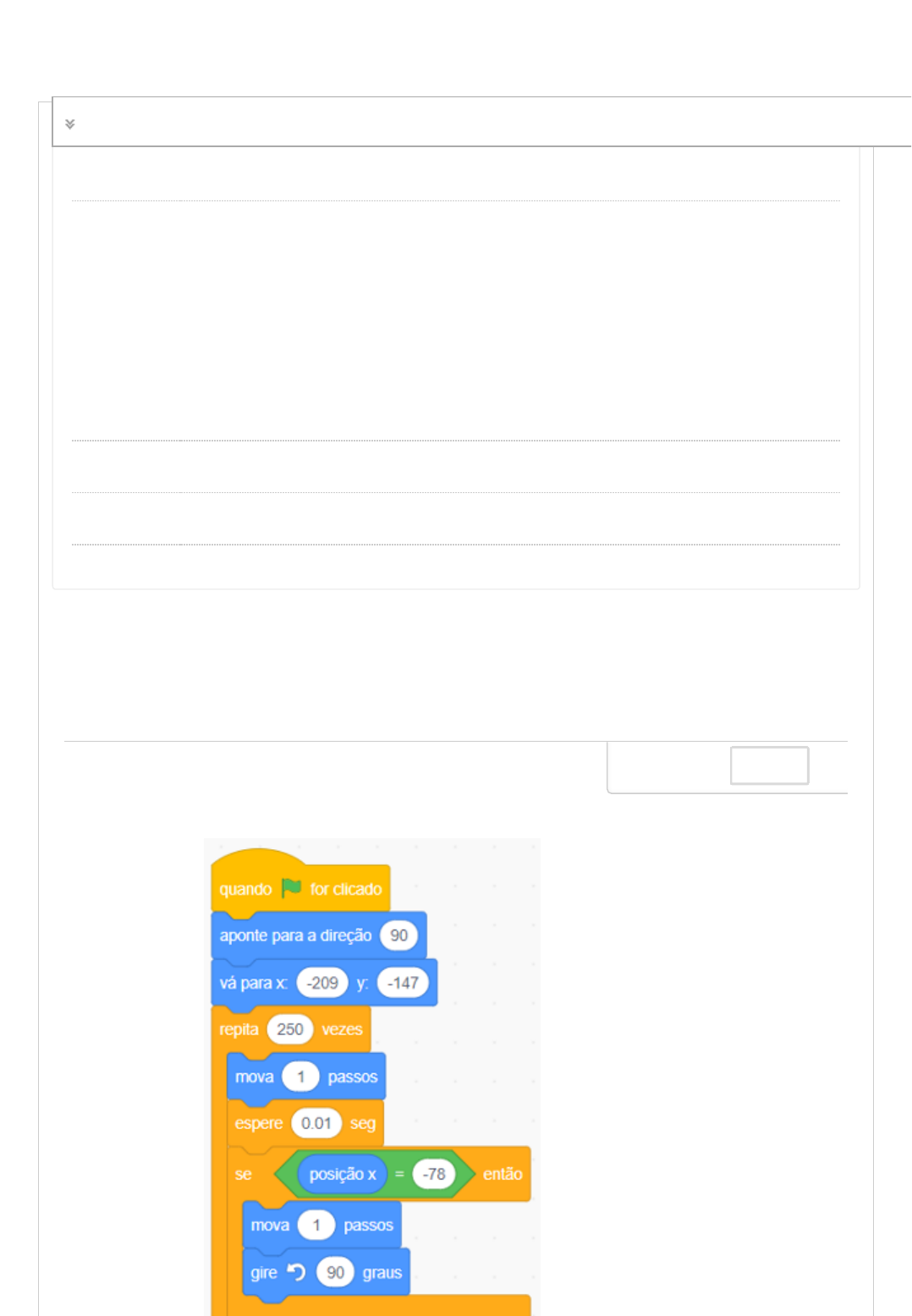 <p>Fazer teste: Semana 4 - Atividade Avaliativa</p><p>Informações do teste</p><p>Descrição</p><p>Instruções Olá, estudante!</p><p>1. Para responder a esta atividade, selecione a(s) alternativa(s) que você</p><p>considerar correta(s);</p><p>2. Após selecionar a resposta correta em todas as questões, vá até o �m da</p><p>página e pressione “Enviar teste”.</p><p>3. A cada tentativa, você receberá um novo conjunto de questões diferentes</p><p>para que você responda e tente alcançar melhores resultados.</p><p>Pronto! Sua atividade já está registrada no AVA.</p><p>Várias</p><p>tentativas</p><p>Este teste permite 3 tentativas. Esta é a tentativa número 2.</p><p>Forçar</p><p>conclusão</p><p>Este teste pode ser salvo e retomado posteriormente.</p><p>Suas respostas foram salvas automaticamente.</p><p>Quando, no programa abaixo, vai ser executado o comando “gire”?</p><p>PERGUNTA 1 1,42 pontos Salva</p><p>Estado de Conclusão da Pergunta:</p><p>19/08/2024, 15:22 Fazer teste: Semana 4 - Atividade Avaliativa – ...</p><p>https://ava.univesp.br/webapps/assessment/take/launch.jsp?course_assessment_id=_197991_1&course_id=_13147_1&new_attempt=1&content… 1/6</p><p>a. Quando a posição horizontal na tela (x) do ator for menor que</p><p>78.</p><p>b. Quando a posição horizontal na tela (x) do ator for menor que</p><p>-78.</p><p>c. Quando a posição horizontal na tela (x) do ator for maior que</p><p>-78.</p><p>d. Quando a posição horizontal na tela (x) do ator for igual a</p><p>-78.</p><p>e. Quando a posição horizontal na tela (x) do ator for maior que</p><p>78.</p><p>Quais comandos no programa abaixo garantem que o personagem</p><p>sempre comece na mesma posição e direção no palco?</p><p>a. Aponte, “vá para...” e o primeiro “mova”.</p><p>b. Aponte e “vá para…”.</p><p>c. Todos, menos o último “mova”.</p><p>d. Todos até o “espere”.</p><p>e. Todos.</p><p>PERGUNTA 2 1,42 pontos Salva</p><p>PERGUNTA 3 1,42 pontos Salva</p><p>19/08/2024, 15:22 Fazer teste: Semana 4 - Atividade Avaliativa – ...</p><p>https://ava.univesp.br/webapps/assessment/take/launch.jsp?course_assessment_id=_197991_1&course_id=_13147_1&new_attempt=1&content… 2/6</p><p>No programa abaixo, o ator dá pulos grandes e �ca muito tempo</p><p>parado entre eles. Como você mudaria o programa para que ele</p><p>andasse a mesma quantidade de passos, mas de forma mais</p><p>contínua e realista, sem pulos e sem demorar tanto?</p><p>a. Nenhuma das demais alternativas está correta.</p><p>b. Aponte para a direção 180.</p><p>c. Mova 10 passos.</p><p>d. Espere 0.1s (menos tempo).</p><p>e. Vá para x: 0 y: 0.</p><p>, p</p><p>Quantos passos o ator vai se deslocar no total ao rodar o programa</p><p>abaixo?</p><p>PERGUNTA 4 1,42 pontos Salva</p><p>19/08/2024, 15:22 Fazer teste: Semana 4 - Atividade Avaliativa – ...</p><p>https://ava.univesp.br/webapps/assessment/take/launch.jsp?course_assessment_id=_197991_1&course_id=_13147_1&new_attempt=1&content… 3/6</p><p>a. 10</p><p>b. 90</p><p>c. Depende das variáveis.</p><p>d. 150</p><p>e. 15</p><p>O que acontecerá quando se clicar na bandeira verde no programa</p><p>abaixo?</p><p>a. O ator falará “Bem-vindos à Universidade Tchau” por 6</p><p>segundos.</p><p>b. O ator falará “Bem-vindos à Univesp Tchau” por 6 segundos.</p><p>c. O ator falará “Bem-vindos à”, esperará 2 segundos, falará</p><p>“Universidade”, esperará mais 2 segundos e falará “Tchau” por</p><p>mais 2 segundos.</p><p>d. Nenhuma das demais alternativas está correta.</p><p>e. O ator falará “Bem-vindos à”, esperará 2 segundos, falará</p><p>“Univesp”, esperará mais 2 segundos, e falará “Tchau” por</p><p>mais 2 segundos.</p><p>PERGUNTA 5 1,45 pontos Salva</p><p>Por que tem o comando “mova 1” dentro do “se” no programa</p><p>b i ?</p><p>PERGUNTA 6 1,45 pontos Salva</p><p>19/08/2024, 15:22 Fazer teste: Semana 4 - Atividade Avaliativa – ...</p><p>https://ava.univesp.br/webapps/assessment/take/launch.jsp?course_assessment_id=_197991_1&course_id=_13147_1&new_attempt=1&content… 4/6</p><p>abaixo?</p><p>a. Para que o ator sempre comece na mesma posição.</p><p>b. Sem esse “mova”, o programa entraria duas vezes no “se” e o</p><p>ator giraria 180 graus (90 + 90), passando a andar na direção</p><p>contrária.</p><p>c. Para ele girar.</p><p>d. Porque tem que ter pelo menos dois comandos dentro de um</p><p>“se”.</p><p>e. Para o ator se movimentar ao longo do programa, senão ele</p><p>�caria parado.</p><p>O que é apresentado na parte demarcada com o retângulo</p><p>vermelho?</p><p>PERGUNTA 7 1,42 pontos Salva</p><p>19/08/2024, 15:22 Fazer teste: Semana 4 - Atividade Avaliativa – ...</p><p>https://ava.univesp.br/webapps/assessment/take/launch.jsp?course_assessment_id=_197991_1&course_id=_13147_1&new_attempt=1&content… 5/6</p><p>a. Quantos passos o ator já deu.</p><p>b. O valor de duas variáveis que o programador criou.</p><p>c. Nenhuma das demais alternativas está correta.</p><p>d. A largura do desenho do ator.</p><p>e. A posição em que está o ator no palco.</p><p>19/08/2024, 15:22 Fazer teste: Semana 4 - Atividade Avaliativa – ...</p><p>https://ava.univesp.br/webapps/assessment/take/launch.jsp?course_assessment_id=_197991_1&course_id=_13147_1&new_attempt=1&content… 6/6</p>