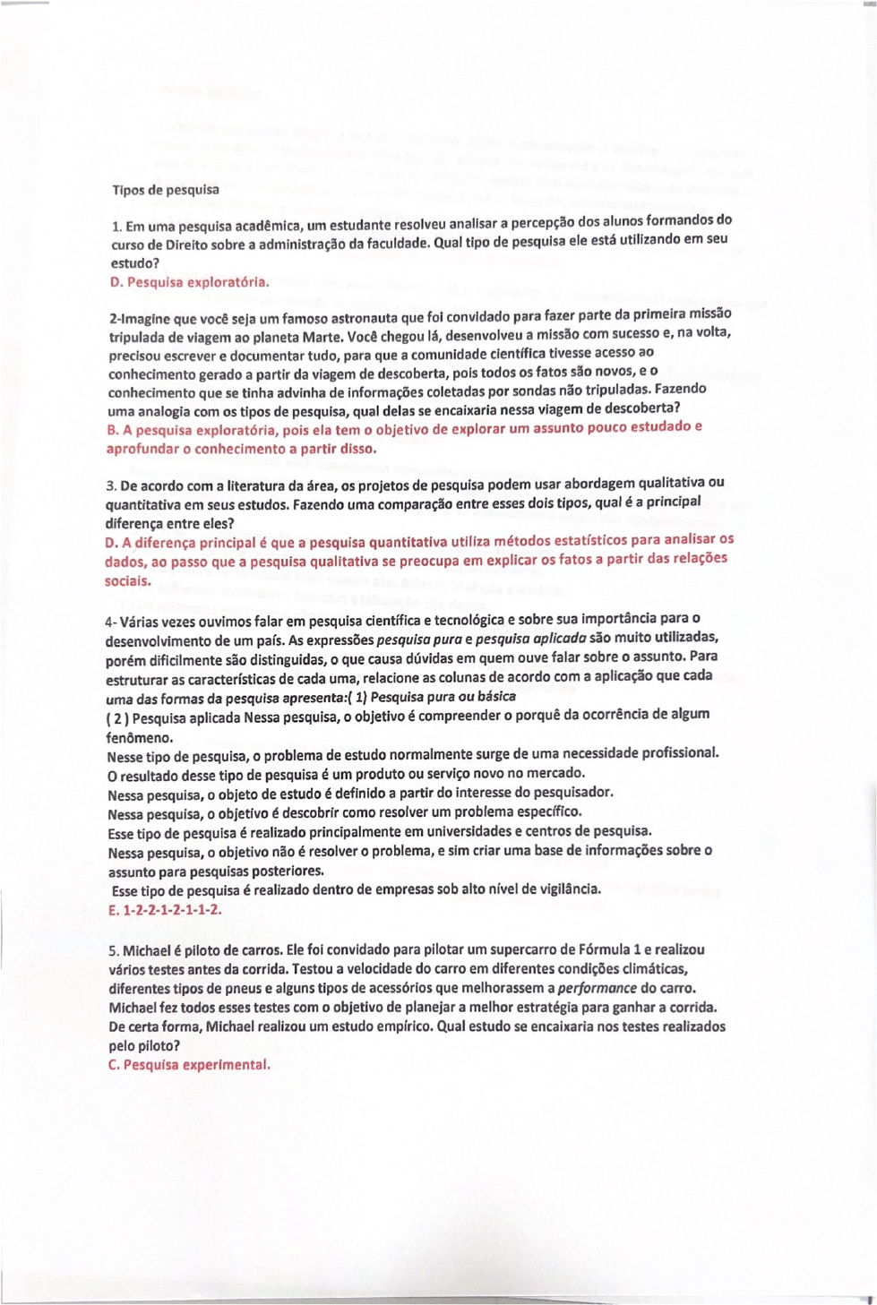 <p>Tipos de pesquisa 1. Em uma pesquisa acadêmica, um estudante resolveu analisar a percepção dos alunos formandos do curso de Direito sobre a administração da faculdade. Qual tipo de pesquisa ele está utilizando em seu estudo? D. Pesquisa exploratória. 2-Imagine que você seja um famoso astronauta que foi convidado para fazer parte da primeira missão tripulada de viagem ao planeta Marte. Você chegou lá, desenvolveu a missão com sucesso e, na volta, precisou escrever e documentar tudo, para que a comunidade científica tivesse acesso ao conhecimento gerado a partir da viagem de descoberta, pois todos os fatos são novos, e o conhecimento que se tinha advinha de informações coletadas por sondas não tripuladas. Fazendo uma analogia com os tipos de pesquisa, qual delas se encaixaria nessa viagem de descoberta? B. A pesquisa exploratória, pois ela tem o objetivo de explorar um assunto pouco estudado e aprofundar conhecimento a partir disso. 3. De acordo com a literatura da área, os projetos de pesquisa podem usar abordagem qualitativa ou quantitativa em seus estudos. Fazendo uma comparação entre esses dois tipos, qual é a principal diferença entre eles? D. A diferença principal é que a pesquisa quantitativa utiliza métodos estatísticos para analisar os dados, ao passo que a pesquisa qualitativa se preocupa em explicar os fatos a partir das relações sociais. 4- Várias vezes ouvimos falar em pesquisa científica e tecnológica e sobre sua importância para desenvolvimento de um país. As expressões pesquisa pura e pesquisa aplicada são muito utilizadas, porém dificilmente são distinguidas, o que causa dúvidas em quem ouve falar sobre assunto. Para estruturar as características de cada uma, relacione as colunas de acordo com a aplicação que cada uma das formas da pesquisa apresenta:( 1) Pesquisa pura ou básica (2) Pesquisa aplicada Nessa pesquisa, o objetivo é compreender o porquê da ocorrência de algum fenômeno. Nesse tipo de pesquisa, o problema de estudo normalmente surge de uma necessidade profissional. o resultado desse tipo de pesquisa é um produto ou serviço novo no mercado. Nessa pesquisa, o objeto de estudo é definido a partir do interesse do pesquisador. Nessa pesquisa, objetivo é descobrir como resolver um problema específico. Esse tipo de pesquisa é realizado principalmente em universidades e centros de pesquisa. Nessa pesquisa, o objetivo não é resolver o problema, e sim criar uma base de informações sobre o assunto para pesquisas posteriores. Esse tipo de pesquisa é realizado dentro de empresas sob alto nível de vigilância. E. 1-2-2-1-2-1-1-2. 5. Michael é piloto de carros. Ele foi convidado para pilotar um supercarro de Fórmula 1 e realizou vários testes antes da corrida. Testou a velocidade do carro em diferentes condições climáticas, diferentes tipos de pneus e alguns tipos de acessórios que melhorassem a performance do carro. Michael fez todos esses testes com o objetivo de planejar a melhor estratégia para ganhar a corrida. De certa forma, Michael realizou um estudo empírico. Qual estudo se encaixaria nos testes realizados pelo piloto? C. Pesquisa experimental.</p>