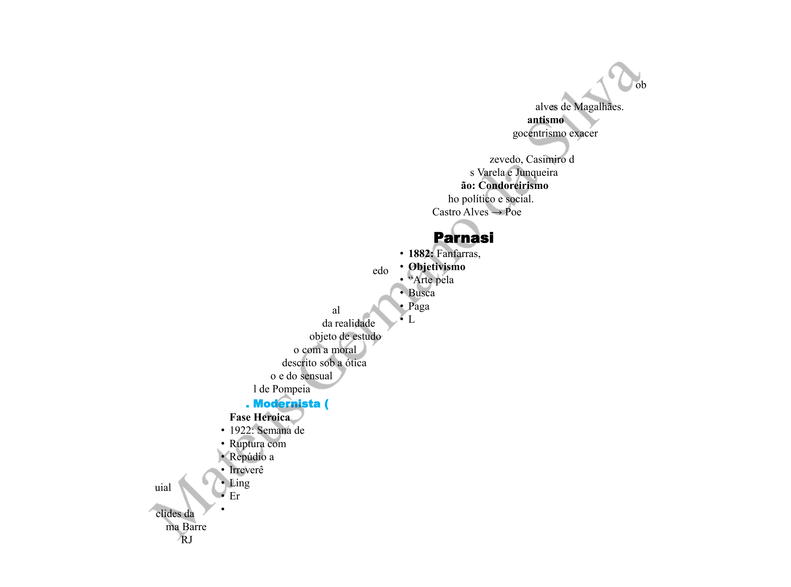 <p>Quinhentismo</p><p>• 1500: Carta, de Pero</p><p>Vaz de Caminha</p><p>• Crise na Igreja.</p><p>• Ascensão burguesa</p><p>• Expansão marítima e</p><p>comercial portuguesa.</p><p>• Descobrimento do</p><p>Brasil</p><p>• L. de informação</p><p>• L. de Catequese</p><p>Barroco</p><p>• 1601: Prosopopeia, de Bento</p><p>Teixeira</p><p>• Subjetivismo</p><p>• Culto a forma e linguagem</p><p>rebuscada</p><p>• Fé ×Razão/ Sagrado× Profano</p><p>• Cultismo/ Gongorismo =</p><p>jogo de palavras</p><p>• Conceptismo/ Quevedismo =</p><p>jogo de ideias</p><p>• Gosto por inversões e por</p><p>construções complexas e raras</p><p>• Gregório de Matos e Pe.</p><p>Antônio Vieira</p><p>Arcadismo</p><p>• 1768: Obras de Cláudio</p><p>Manuel da Costa</p><p>• Objetivismo e Racionalismo</p><p>• Neoclassicismo</p><p>• Bucolismo e Pastoralismo</p><p>• Fugere Urbem; Inutilia</p><p>truncat; Locus amoenus;</p><p>Carpe diem</p><p>• Vocabulário simples</p><p>• Uso de pseudônimos</p><p>• Valorização da paisagem e da</p><p>cultura da nossa terra</p><p>• Gosto pela ordem direta</p><p>• + Tomás Antônio Gonzaga,</p><p>Silva Alvarenga, Alvarenga</p><p>Peixoto, Santa Rita Durão</p><p>e Basílio da Gama</p><p>Romantismo – Poesia</p><p>• 1836: Suspiros poéticos e saudades, de</p><p>Gonçalves de Magalhães</p><p>• Subjetivismo e egocentrismo</p><p>• Idealização</p><p>1ª geração: Indianismo</p><p>• Nacionalista e indianista</p><p>• Gonçalves Dias e Gonçalves de Magalhães.</p><p>2ª geração: Ultrarromantismo</p><p>• "mal do século", egocentrismo exacerbado,</p><p>pessimismo</p><p>• Álvares de Azevedo, Casimiro de Abreu,</p><p>Fagundes Varela e Junqueira Freire.</p><p>3ª geração: Condoreirismo</p><p>• cunho político e social.</p><p>• Castro Alves → Poeta dos escravos</p><p>Romantismo –</p><p>Prosa</p><p>• A busca do nacional</p><p>• José de Alencar → maior</p><p>romancista brasileiro, escreveu</p><p>obras que enfocaram esses três</p><p>aspectos, como O guarani,</p><p>romance histórico-indianista, O</p><p>gaúcho, romance regional, e</p><p>Senhora, romance urbano.</p><p>• Indianista: índio como único e</p><p>legítimo representante da</p><p>América</p><p>• Histórico: Temáticas históricas</p><p>• Regional: a vida rural</p><p>• Urbano: a vida citadina</p><p>Parnasianismo</p><p>• 1882: Fanfarras, de Teófilo Dias.</p><p>• Objetivismo</p><p>• “Arte pela arte”</p><p>• Busca pela perfeição poética</p><p>• Paganismo greco-latino</p><p>• Linguagem precisa, objetiva, culta</p><p>• Materialismo, racionalismo</p><p>• Retomada de elementos da tradição</p><p>clássica</p><p>• + Alberto de Oliveira e Raimundo</p><p>Correia</p><p>Simbolismo</p><p>• 1893: Missal e Broquéis, de Cruz e Sousa</p><p>• Subjetivismo, Misticismo, religiosidade,</p><p>Antimaterialismo, antirracionalismo</p><p>• Mergulho e Sondagem do “eu”</p><p>• Metáforas, comparações, aliterações,</p><p>assonâncias e sinestesias</p><p>• Retomada de elementos da tradição</p><p>romântica</p><p>• Interesse pelas zonas profundas da mente</p><p>e pela loucura</p><p>• Caráter Melódico na linguagem</p><p>Pré – Modernismo</p><p>• Transição→ Conservador (séc. XIX) ×</p><p>Moderno (séc. XX): Presos aos modelos do</p><p>romance realista-naturalista e da poesia</p><p>simbolista</p><p>• Interesse pela realidade brasileira</p><p>• Linguagem mais simples e coloquial</p><p>• Regionalismo e Nacionalismo</p><p>• Graça Aranha (Canaã → ES); Euclides da</p><p>Cunha (Os sertões → Nordeste); Lima Barreto</p><p>(Triste Fim de Policarpo Quaresma → RJ) ;</p><p>Monteiro Lobato (→SP)</p><p>• Exceção: poesia de Augusto dos Anjos → fuga</p><p>do interesse social.</p><p>2ª G. Modernista (1930 – 1945)</p><p>• Poesia: Mais amadurecida. Questiona a</p><p>existência humana; Amplia as conquistas</p><p>geração anterior. Denuncia social</p><p>• Carlos D. de Andrade →Fases: 1ª:</p><p>Gauche (1930); 2ª: Social (40 – 45); 3ª:</p><p>Não (50 –60); 4ª: Memória (70 –80)</p><p>• Cecília Meireles; Vinícius de Moraes;</p><p>Murilo Mendes; Jorge de Lima</p><p>• Prosa: Temas nacionais: Regionalismo</p><p>nordestino e Romance urbano</p><p>• Jorge Amado; Graciliano Ramos; Rachel</p><p>de Queiroz; José Lins do rego; Érico</p><p>Veríssimo</p><p>Realismo</p><p>• 1881: Memórias póstumas de Brás Cubas,</p><p>de Machado de Assis</p><p>• Objetivismo e Universalismo</p><p>• Amor e outros sentimentos subordinados</p><p>aos interesses sociais.</p><p>• Mulher não idealizada</p><p>• Descrições e adjetivação objetivas, voltadas</p><p>a captar o real como ele é</p><p>• Herói problemático e cheio de fraquezas</p><p>• M. de Assis: a parte mais significativa de</p><p>suas obras é representada por seus romances</p><p>e contos. Fase de Transição: Ressurreição,</p><p>Helena, A mão e a luva, laiá Garcia</p><p>Naturalismo</p><p>• 1881: O Mulato, de Aluísio Azevedo</p><p>• Objetivismo e Determinismo</p><p>• Miséria das Cidades</p><p>• Temas de patologia social</p><p>• Observação e análise da realidade</p><p>• Ser humano como objeto de estudo</p><p>• Despreocupação com a moral</p><p>• Ser humano descrito sob a ótica do</p><p>animalesco e do sensual</p><p>• + Raul de Pompeia</p><p>1ª G. Modernista (1922 – 1930)</p><p>• Fase Heroica</p><p>• 1922: Semana de Arte Moderna.</p><p>• Ruptura com a influência europeia</p><p>• Repúdio ao conservadorismo</p><p>• Irreverência e Ironia;</p><p>• Linguagem Coloquial e livre</p><p>• Erros Gramaticais</p><p>• Temas cotidianos;</p><p>• Poesia: Oswald de Andrade; Mário de</p><p>Andrade; Manuel Bandeira; Menotti</p><p>Del Picchia</p><p>• Prosa: Os Andrades; Antônio de</p><p>Alcântara Machado</p><p>3ª G. Modernista (1945 – 1960)</p><p>• Geração de 45</p><p>• Preocupação com o esti
