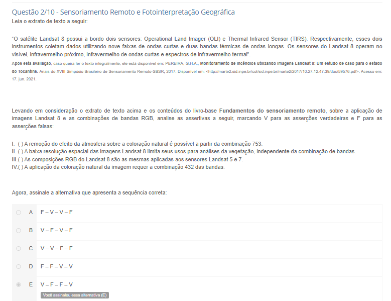 <p>Questão 2/10 - Sensoriamento Remoto e Fotointerpretação Leia 0 extrato de texto a seguir: satélite Landsat 8 possui a bordo dois sensores: Operational Land Imager (OLI) e Thermal Infrared Sensor (TIRS). Respectivamente, esses dois instrumentos coletam dados utilizando nove faixas de ondas curtas e duas bandas de ondas Os sensores do Landsat 8 operam no infravermelho infravermelho de ondas curtas e espectros de infravermelho esta caso queira texto ele está disponível em: PEREIRA Monitoramento de utilizando Landsat 8: Um estudo de para estado do Tocantina Anais do XVIII Brasileiro de Sensoriamento Remoto-SBSR 2017. Disponível em: 17 jun. Levando em consideração extrato de texto acima e os conteudos do livro-base Fundamentos do sensoriamento sobre a aplicação de imagens Landsat 8 e as combinações de bandas analise as assertivas a seguir, marcando V para as asserções verdadeiras e F para as asserções falsas: A remoção do efeito da atmosfera sobre a coloração natural é possível a partir da combinação 753. II. A baixa resolução espacial das imagens Landsat 8 limita seus usos para análises da independente da combinação de bandas As composições RGB do Landsat 8 são as mesmas aplicadas aos sensores Landsat 5 e 7. IV.() A aplicação da coloração natural da imagem requer a combinação 432 das Agora, assinale a alternativa que apresenta a sequência correta: A F-V-V-F B V-F-V-F C V-V-F-F D F-F-V-V E V-F-F-V assinalou alternativa E</p>