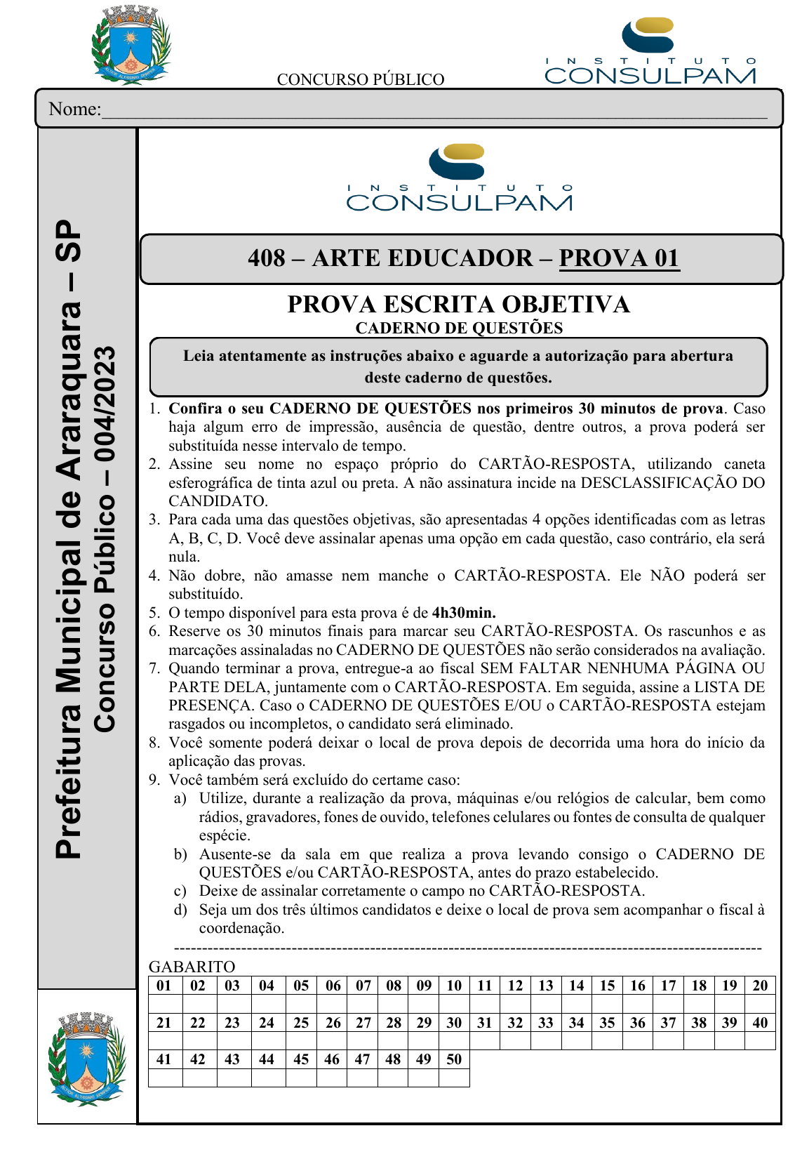 <p>pcimarkpci MDAwMDowMDAwOjAwMDA6MDAwMDowMDAwOmZmZmY6YjM3NTozNDJh:TW9uLCAwOSBTZXAgMjAyNCAxNjowNjoyMyAtMDMwMA==</p><p>www.pciconcursos.com.br</p><p>1</p><p>CONCURSO PÚBLICO</p><p>PROVA ESCRITA OBJETIVA</p><p>CADERNO DE QUESTÕES</p><p>1. Confira o seu CADERNO DE QUESTÕES nos primeiros 30 minutos de prova. Caso</p><p>haja algum erro de impressão, ausência de questão, dentre outros, a prova poderá ser</p><p>substituída nesse intervalo de tempo.</p><p>2. Assine seu nome no espaço próprio do CARTÃO-RESPOSTA, utilizando caneta</p><p>esferográfica de tinta azul ou preta. A não assinatura incide na DESCLASSIFICAÇÃO DO</p><p>CANDIDATO.</p><p>3. Para cada uma das questões objetivas, são apresentadas 4 opções identificadas com as letras</p><p>A, B, C, D. Você deve assinalar apenas uma opção em cada questão, caso contrário, ela será</p><p>nula.</p><p>4. Não dobre, não amasse nem manche o CARTÃO-RESPOSTA. Ele NÃO poderá ser</p><p>substituído.</p><p>5. O tempo disponível para esta prova é de 4h30min.</p><p>6. Reserve os 30 minutos finais para marcar seu CARTÃO-RESPOSTA. Os rascunhos e as</p><p>marcações assinaladas no CADERNO DE QUESTÕES não serão considerados na avaliação.</p><p>7. Quando terminar a prova, entregue-a ao fiscal SEM FALTAR NENHUMA PÁGINA OU</p><p>PARTE DELA, juntamente com o CARTÃO-RESPOSTA. Em seguida, assine a LISTA DE</p><p>PRESENÇA. Caso o CADERNO DE QUESTÕES E/OU o CARTÃO-RESPOSTA estejam</p><p>rasgados ou incompletos, o candidato será eliminado.</p><p>8. Você somente poderá deixar o local de prova depois de decorrida uma hora do início da</p><p>aplicação das provas.</p><p>9. Você também será excluído do certame caso:</p><p>a) Utilize, durante a realização da prova, máquinas e/ou relógios de calcular, bem como</p><p>rádios, gravadores, fones de ouvido, telefones celulares ou fontes de consulta de qualquer</p><p>espécie.</p><p>b) Ausente-se da sala em que realiza a prova levando consigo o CADERNO DE</p><p>QUESTÕES e/ou CARTÃO-RESPOSTA, antes do prazo estabelecido.</p><p>c) Deixe de assinalar corretamente o campo no CARTÃO-RESPOSTA.</p><p>d) Seja um dos três últimos candidatos e deixe o local de prova sem acompanhar o fiscal à</p><p>coordenação.</p><p>---------------------------------------------------------------------------------------------------------</p><p>GABARITO</p><p>01 02 03 04 05 06 07 08 09 10 11 12 13 14 15 16 17 18 19 20</p><p>21 22 23 24 25 26 27 28 29 30 31 32 33 34 35 36 37 38 39 40</p><p>41 42 43 44 45 46 47 48 49 50</p><p>Leia atentamente as instruções abaixo e aguarde a autorização para abertura</p><p>deste caderno de questões.</p><p>408 – ARTE EDUCADOR – PROVA 01</p><p>P</p><p>re</p><p>fe</p><p>it</p><p>u</p><p>ra</p><p>M</p><p>u</p><p>n</p><p>ic</p><p>ip</p><p>a</p><p>l</p><p>d</p><p>e</p><p>A</p><p>ra</p><p>ra</p><p>q</p><p>u</p><p>a</p><p>ra</p><p>–</p><p>S</p><p>P</p><p>C</p><p>o</p><p>n</p><p>c</p><p>u</p><p>rs</p><p>o</p><p>P</p><p>ú</p><p>b</p><p>li</p><p>c</p><p>o</p><p>–</p><p>0</p><p>0</p><p>4</p><p>/2</p><p>0</p><p>2</p><p>3</p><p>Nome:_______________________________________________________________________________</p><p>pcimarkpci MDAwMDowMDAwOjAwMDA6MDAwMDowMDAwOmZmZmY6YjM3NTozNDJh:TW9uLCAwOSBTZXAgMjAyNCAxNjowNjoyMyAtMDMwMA==</p><p>www.pciconcursos.com.br</p><p>2</p><p>CONCURSO PÚBLICO</p><p>TEXTO</p><p>O QUE É UM CAFÉ ARÁBICA?</p><p>CONHEÇA SUAS CARACTERÍSTICAS E</p><p>COMO É CLASSIFICADO</p><p>Você que ama tomar aquele cafezinho já sabe</p><p>que a bebida é feita com os grãos torrados da fruta do</p><p>cafeeiro, certo? No entanto, também é importante</p><p>saber que nem toda fruta é igual.</p><p>Assim como existem diferentes espécies de</p><p>uvas – como pinot noir, malbec e cabernet</p><p>sauvignon – que dão características distintas aos</p><p>variados tipos de vinhos, o café também possui</p><p>variadas espécies de frutas de diferentes aspectos,</p><p>influenciando diretamente no sabor e na qualidade do</p><p>café que tomamos.</p><p>No Brasil, as espécies mais usadas para a</p><p>produção do café são robusta – também conhecido</p><p>como conilon – e arábica, de que falaremos.</p><p>O café arábica foi catalogado por volta de</p><p>1750 e é originário da Etiópia. A espécie corresponde</p><p>a aproximadamente ¾ dos grãos produzidos em todo</p><p>o mundo e é tida como a mais nobre da família dos</p><p>cafés devido à sua complexidade de sabor e aroma.</p><p>O cultivo de seus grãos é feito entre 600 e 2 mil</p><p>metros de altitude. A escolha de altitude impacta</p><p>diretamente nas características do café, pois, quanto</p><p>mais alto, maior a concentração de minerais nos grãos</p><p>e mais ameno é o clima para o seu desenvolvimento,</p><p>o que ajuda na acentuação de sabor, acidez e aroma</p><p>do café.</p><p>O café arábica possui um sabor suave,</p><p>ligeiramente ácido e naturalmente adocicado. Isso</p><p>porque seus grãos possuem uma concentração de</p><p>açúcares muito maior do que a do robusta. Além</p><p>disso, o café arábica também possui um aroma mais</p><p>suave e frutado e a concentração de cafeína em seus</p><p>grãos é bem menor do que a de outras espécies de</p><p>café.</p><p>Os blends são misturas entre diferentes espécies</p><p>e variedades de grãos. Devido aos aspectos distintos</p><p>encontrados no café robusta e no café arábica – e em</p><p>suas variedades -, é muito comum que os produtores</p><p>façam blends entre grãos tanto para combinar</p><p>propriedades quanto para baratear os custos de</p><p>produção, já que o café arábica tem um custo mais</p><p>elevado devido aos cuidados que precisa ter no</p><p>cultivo.</p><p>Um café 100% arábica é produzido unicamente</p><p>com variedades de grãos da espécie arábica. Esses</p><p>cafés recebem a classificação de gourmets ou</p><p>especiais pela ABIC (Associação Brasileira de</p><p>Indústria do Café), 