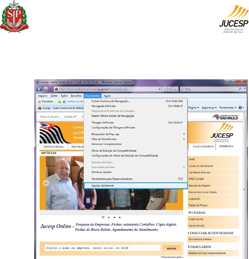 <p>GOVERNO DO ESTADO DE SÃO PAULO</p><p>Secretaria de Desenvolvimento Econômico, Ciência, Tecnologia e Inovação</p><p>Junta Comercial do Estado de São Paulo</p><p>Junta Comercial do Estado de São Paulo | Jucesp</p><p>SETI - Secretaria Executiva de Tecnologia da Informação</p><p>2016</p><p>Configuração – Redefinindo o Internet Explorer</p><p>1. No menu do Internet Explorer, clique na opção “Ferramentas -> Opções da</p><p>Internet”:</p><p>GOVERNO DO ESTADO DE SÃO PAULO</p><p>Secretaria de Desenvolvimento Econômico, Ciência, Tecnologia e Inovação</p><p>Junta Comercial do Estado de São Paulo</p><p>Junta Comercial do Estado de São Paulo | Jucesp</p><p>SETI - Secretaria Executiva de Tecnologia da Informação</p><p>2016</p><p>2. Clique na aba “Avançadas”:</p><p>GOVERNO DO ESTADO DE SÃO PAULO</p><p>Secretaria de Desenvolvimento Econômico, Ciência, Tecnologia e Inovação</p><p>Junta Comercial do Estado de São Paulo</p><p>Junta Comercial do Estado de São Paulo | Jucesp</p><p>SETI - Secretaria Executiva de Tecnologia da Informação</p><p>2016</p><p>3. Clique em “Restaurar configurações avançadas -> Aplicar -> Redefinir”:</p><p>GOVERNO DO ESTADO DE SÃO PAULO</p><p>Secretaria de Desenvolvimento Econômico, Ciência, Tecnologia e Inovação</p><p>Junta Comercial do Estado de São Paulo</p><p>Junta Comercial do Estado de São Paulo | Jucesp</p><p>SETI - Secretaria Executiva de Tecnologia da Informação</p><p>2016</p><p>4. Marque a opção “Excluir configurações pessoais” e clique em “Redefinir”:</p><p>5. Ao término da redefinição, clique em “Fechar”:</p><p>6. Deverá aparecer uma mensagem solicitando que o navegador ou o</p><p>computador seja reiniciado:</p><p>GOVERNO DO ESTADO DE SÃO PAULO</p><p>Secretaria de Desenvolvimento Econômico, Ciência, Tecnologia e Inovação</p><p>Junta Comercial do Estado de São Paulo</p><p>Junta Comercial do Estado de São Paulo | Jucesp</p><p>SETI - Secretaria Executiva de Tecnologia da Informação</p><p>2016</p><p>7. Abra o Internet Explorer e siga os passos abaixo:</p><p>Internet Explorer 8 e 9 – Teste se o problema foi solucionado.</p><p>Internet Explorer 10 e 11 – Inclua o endereço “sp.gov.br” nas configurações do</p><p>modo de exibição de compatibilidade.</p><p>Clique em “Ferramentas -> Configurações do Modo de Exibição de</p><p>Compatibilidade ”:</p><p>GOVERNO DO ESTADO DE SÃO PAULO</p><p>Secretaria de Desenvolvimento Econômico, Ciência, Tecnologia e Inovação</p><p>Junta Comercial do Estado de São Paulo</p><p>Junta Comercial do Estado de São Paulo | Jucesp</p><p>SETI - Secretaria Executiva de Tecnologia da Informação</p><p>2016</p><p>Digite o endereço “sp.gov.br” depois clique em “Adicionar”:</p><p>Clique em “Fechar” e teste se o problema foi solucionado:</p>