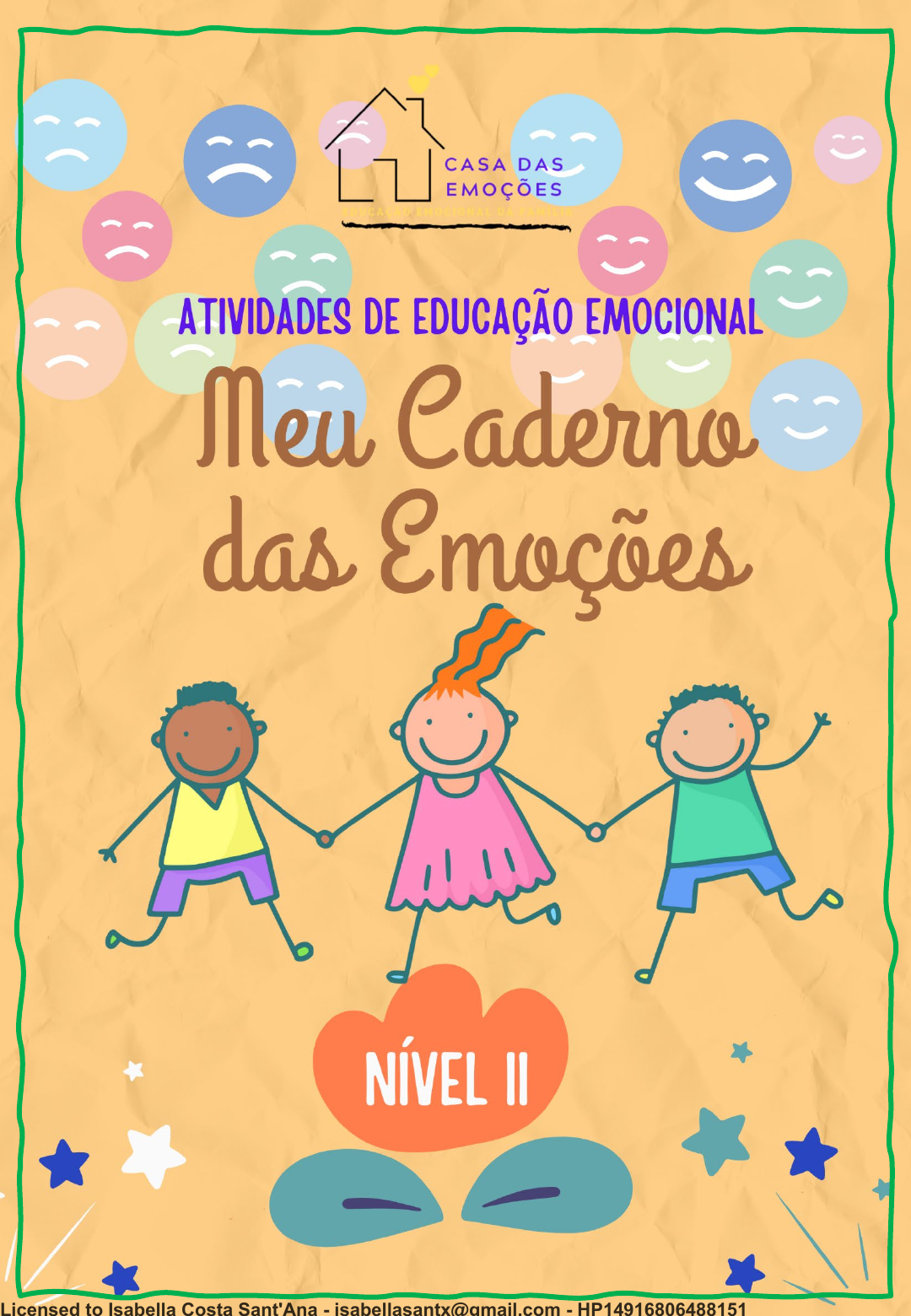<p>Licensed to Isabella Costa Sant'Ana - isabellasantx@gmail.com - HP14916806488151</p><p>EDUCAÇÃO EMOCIONAL</p><p>APRESENTAÇÃO DO CADERNO</p><p>Este material é protegido pela Lei de Direitos Autorais (Lei nº 9.610/98).</p><p>Seu uso é exclusivamente pessoal e/ou profissional, sendo proibida sua</p><p>revenda, cópia ou distribuição, mesmo que de forma gratuita.</p><p>TODOS OS DIREITOS DE COMERCIALIZAÇÃO - Casa das Emoções®</p><p>www.casadasemocoes.com.br</p><p>Olá você, seja muito bem-vindo, seja muito bem-vinda!</p><p>Esse Caderno de Atividades foi desenvolvido para a educação das</p><p>emoções, visando o desenvolvimento da Inteligência Emocional</p><p>infantil.</p><p>São atividades lúdicas para envolver as crianças no processo da</p><p>identificação, compreensão, regulação e expressão emocional.</p><p>Fazer as Atividades em momentos diferentes de acordo com a</p><p>faixa de idade das criança segundo a numeração dos Cadernos:</p><p>- Caderno 1 e 2 para crianças de 04 a 06 anos</p><p>- Cadernos 3 e 4 – crianças de 07 a 09 anos</p><p>Muito sucesso e alegria no caminho do encontro e gestão das</p><p>emoções.</p><p>Com amor</p><p>Isa Magalhães</p><p>Autora e Coordenadora da Casa das Emoções</p><p>Licensed to Isabella Costa Sant'Ana - isabellasantx@gmail.com - HP14916806488151</p><p>EDUCAÇÃO EMOCIONAL</p><p>ESCOLA DE EDUCAÇÃO EMOCIONAL</p><p>image1.png</p><p>O que eu não gosto O que eu gosto</p><p>Brincadeira</p><p>preferida</p><p>O que eu</p><p>acho de mim</p><p>Meu</p><p>herói/heroína</p><p>Meu melhor</p><p>passeio</p><p>Como me sinto na escola</p><p>DESAFIO:</p><p>responda as</p><p>indagações</p><p>usando apenas</p><p>palavras soltas!</p><p>ATIVIDADE 1</p><p>QUEM É VOCÊ?</p><p>Casa das Emoções®</p><p>TO</p><p>D</p><p>O</p><p>S</p><p>O</p><p>S</p><p>D</p><p>IR</p><p>EI</p><p>TO</p><p>S</p><p>D</p><p>E</p><p>C</p><p>O</p><p>M</p><p>ER</p><p>C</p><p>IA</p><p>LI</p><p>ZA</p><p>Ç</p><p>ÃO</p><p>D</p><p>A</p><p>C</p><p>AS</p><p>A</p><p>D</p><p>AS</p><p>E</p><p>M</p><p>O</p><p>Ç</p><p>Õ</p><p>ES</p><p>®</p><p>Licensed to Isabella Costa Sant'Ana - isabellasantx@gmail.com - HP14916806488151</p><p>QUEM É VOCÊ?</p><p>_____________________________________________________________________________________________</p><p>_____________________________________________________________________________________________</p><p>_____________________________________________________________________________________________</p><p>_____________________________________________________________________________________________</p><p>_____________________________________________________________________________________________</p><p>_____________________________________________________________________________________________</p><p>_____________________________________________________________________________________________</p><p>_____________________________________________________________________________________________</p><p>_____________________________________________________________________________________________</p><p>_____________________________________________________________________________________________</p><p>Faça um desenho que representa você!</p><p>ATIVIDADE 2</p><p>Vamos nos apresentar? Escreve seu nome, idade, onde você estuda. Coisas que gosta e coisas que não gosta.</p><p>Casa das Emoções®</p><p>TO</p><p>D</p><p>O</p><p>S</p><p>O</p><p>S</p><p>D</p><p>IR</p><p>EI</p><p>TO</p><p>S</p><p>D</p><p>E</p><p>C</p><p>O</p><p>M</p><p>ER</p><p>C</p><p>IA</p><p>LI</p><p>ZA</p><p>Ç</p><p>ÃO</p><p>D</p><p>A</p><p>C</p><p>AS</p><p>A</p><p>D</p><p>AS</p><p>E</p><p>M</p><p>O</p><p>Ç</p><p>Õ</p><p>ES</p><p>®</p><p>Licensed to Isabella Costa Sant'Ana - isabellasantx@gmail.com - HP14916806488151</p><p>ATIVIDADE 3</p><p>Vamos conversar sobre os temperamentos?</p><p>É o nosso jeito de sentir, pensar e agir.</p><p>Todas as pessoas têm o seu jeito de ser, cada uma é diferente da outra e essa é a</p><p>beleza do nosso planeta! Pinte as carinhas dos temperamentos.</p><p>Existem 4 tipos principais de temperamentos:</p><p>SANGUÍNEO</p><p>São crianças alegres e brincalhonas, mas que têm</p><p>dificuldade em prestar atenção nas coisas, na aula, e</p><p>adoram conversar.</p><p>FLEUMÁTICOS</p><p>São crianças que não sabem dizer não, porque querem agradar os</p><p>outros. São amigas de todos e adoram ajudar as pessoas.</p><p>COLÉRICO</p><p>São crianças que se irritam com facilidade, falam alto e às</p><p>vezes, são agressivas. São ótimos líderes e geralmente,</p><p>conseguem o que querem.</p><p>MELANCÓLICO</p><p>São crianças tímidas, caladas, que têm dificuldades de fazer</p><p>amigos, por isso, não participam muito das brincadeiras.</p><p>Com qual dos temperamentos você mais se identificou?</p><p>Desenhe o rosto desse temperamento.</p><p>Baseado no temperamento escolhido, responda:</p><p>como é o seu comportamento no dia a dia? Sou mais</p><p>alegre ou irritado(a), medroso(a) ou tristonho(a)?</p><p>VAMOS FAZER O JOGO DOS TEMPERAMENTOS?</p><p>Casa das Emoções®</p><p>TO</p><p>D</p><p>O</p><p>S</p><p>O</p><p>S</p><p>D</p><p>IR</p><p>EI</p><p>TO</p><p>S</p><p>D</p><p>E</p><p>C</p><p>O</p><p>M</p><p>ER</p><p>C</p><p>IA</p><p>LI</p><p>ZA</p><p>Ç</p><p>ÃO</p><p>D</p><p>A</p><p>C</p><p>AS</p><p>A</p><p>D</p><p>AS</p><p>E</p><p>M</p><p>O</p><p>Ç</p><p>Õ</p><p>ES</p><p>®</p><p>Licensed to Isabella Costa Sant'Ana - isabellasantx@gmail.com - HP14916806488151</p><p>ESTA É A</p><p>MINHA FAMÍLIA</p><p>Preencha os quadradinhos da Árvore com nos</p><p>nomes e depois, pinte-a bem legal!</p><p>ATIVIDADE 4</p><p>A ÁRVORE DA FAMÍLIA</p><p>Faça um desenho da sua família</p><p>Minha família tem pessoas.</p><p>Meu pai se chama</p><p>Minha mãe se chama</p><p>Tenho irmãos? SIM ( ) NÃO ( )</p><p>Quantos?</p><p>Casa das Emoções®</p><p>TO</p><p>D</p><p>O</p><p>S</p><p>O</p><p>S</p><p>D</p><p>IR</p><p>EI</p><p>TO</p><p>S</p><p>D</p><p>