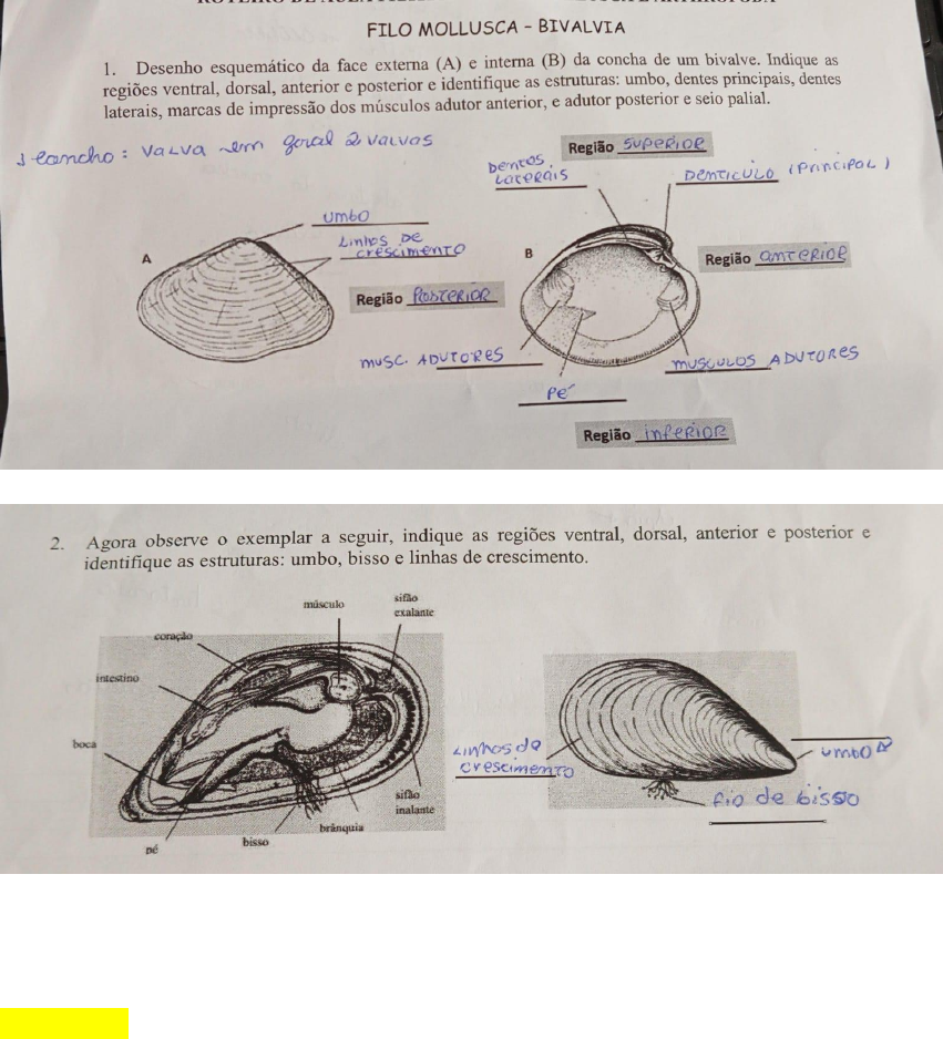 <p>RELATÓRIOS- AULAS PRÁTICAS DE ZOOLOGIA DE MOLUSCOS E</p><p>ARTRÓPODES</p><p>Discente: Heloisa Moreira branco Miranda</p><p>RA: 126442-22</p><p>AULA 1 – CARACTERIZAÇÃO DO FILO MOLUSCA - GASTROPODA</p><p>3) Identifique o exemplar anterior através do seu nome popular e descreva</p><p>o seu modo de vida.</p><p>Resposta:</p><p>O mexilhão é um molusco bivalve que vive em ambientes aquáticos como: estuários e costões</p><p>rochosos e áreas de água salobra. E seu modo de vida é caracterizado em: fixação em substratos</p><p>duros como rochas e cascos de navio por meio dos fios de bisso e não descole com a força de</p><p>ondas e correntes; também são filtradores já que se alimentam de partículas orgânicas presentes</p><p>na água, bombeiam a água através do sifão inalante retendo partículas em suas brânquias e</p><p>liberam água limpa. Além disso, vivem em colônias em áreas favoráveis, proporcionando</p><p>proteção contra futuros predadores e seu ciclo reprodutivo é complexo, já que envolve a liberação</p><p>de gametas na água para que haja fertilização externa, as larvas planctônicas se desenvolvem</p><p>para depois se fixarem nos substratos adequados e se tornarem adultos.</p><p>1- Considerando a figura abaixo, responda:</p><p>a) Quais são as estruturas indicadas em 1, 2 e 3?</p><p>b) As estruturas indicadas na figura indicam modo de vida aquático,</p><p>semiaquático ou terrestre? Por quê?</p><p>Resposta:</p><p>a) As figuras indicadas na seta 1- Concha e abertura ; 2- Pé musculoso; 3- Tentáculos</p><p>sensoriais e Olhos.</p><p>b) O caracol neste caso é terrestre pois os tentáculos oculares são melhores</p><p>desenvolvidos, já que precisam de ter mais sentido para ir em busca de comida e</p><p>melhor se orientar. Além do pé musculoso para sua locomoção e o rastro de gosma.</p><p>3 - Relatório) Cite e explique três características que indicam avanços</p><p>evolutivos dos gastrópodes em relação aos demais grupos de Mollusca ,</p><p>exceto Cephalopoda.</p><p>Resposta:</p><p>1 -Os gastrópodes possuem simetria bilateral, o que lhes confere uma forma mais adaptável e</p><p>direcional em relação ao ambiente em que vivem; 2- possuem uma estrutura chamada rádula,</p><p>que consiste em uma espécie de "língua" raspadora com dentículos quitinosos e esse órgão é</p><p>utilizado para raspar alimentos, como algas e detritos; 3- e também possuem uma estrutura</p><p>reprodutiva chamada espermateca, que armazena o esperma do parceiro durante a cópula esse</p><p>órgão vai permitir que a fertilização dos ovos em momentos posteriores à cópula, aumentando</p><p>as chances de sucesso reprodutivo</p><p>AULA 2 – CARACTERIZAÇÃO DO FILO MOLUSCA – CEPHALOPODA</p><p>(LULA)</p><p>1- A lula corresponde a um dos principais representantes do grupo</p><p>Cephalopoda, que possui características morfológicas específicas, as</p><p>quais exprimem o seu potencial de vida ativo e predatório. Diante disso,</p><p>indique as estruturas correspondentes a esse modo de vida,</p><p>enumeradas na figura abaixo:</p><p>Resposta:</p><p>2 – Relatório) Quais características visíveis que são utilizadas na atividade</p><p>predatória do Mollusca analisado na questão?</p><p>Resposta:</p><p>As características visíveis que são utilizadas na atividade predatória do Molusca analisado na</p><p>questão são: Tentáculos: utilizados para capturar e segurar as presas; Bico: utilizado para cortar</p><p>e rasgar a presa; Boca: utilizada para ingerir a presa e Manto: utilizado para proteger o corpo do</p><p>Molusca e para se locomover.</p><p>AULA 3 – FILO ARTHROPODA (SUBFILO CHELICERIFORMES)</p><p>1- Avalie o exemplar de “aranha caranguejeira”, ilustrado na figura</p><p>abaixo, e responda:</p><p>a) Qual é o nome das estruturas enumeradas em 1, 2, 3 e 4.</p><p>b) Quais as principais funções dos pedipalpos?</p><p>Resposta:</p><p>AULA 4 – FILO ARTHROPODA (SUBFILO CRUSTACEA)</p><p>1- Considerando a figura abaixo, responda:</p><p>a) Qual é a principal diferença morfológica entre os caranguejos e</p><p>os siris?</p><p>b) A que Ordem pertencem esses animais? Por quê?</p><p>c) Identifique entre as figuras “C” e “D” qual corresponde ao macho</p><p>e a fêmea da respectiva espécie. Por quê?</p><p>Resposta:</p><p>c)</p><p>a)</p><p>A principal diferença morfológica entre os caranguejos e os siris está relacionada à</p><p>forma do corpo e à disposição das pernas.</p><p>Caranguejos: Possuem um corpo mais achatado e lateralmente comprimido, com</p><p>um abdômen curto e dobrado sob o tórax. Suas pernas traseiras são achatadas e</p><p>adaptadas para nadar, enquanto as patas dianteiras são maiores e mais robustas,</p><p>utilizadas para caminhar e manipular alimentos.</p><p>Siris: têm um corpo mais alongado e cilíndrico, com um abdômen longo que se</p><p>estende para trás do tórax. Suas pernas são mais uniformes em tamanho e forma,</p><p>sendo adaptadas principalmente para caminhar no fundo do oceano.</p><p>b)</p><p>Caranguejo e Siri ambos pertencem á classe dos crustáceos e a subclasse dos</p><p>Malacostraca, sendo classificados na ordem Decapoda devido as suas</p><p>características de cinco pares de pernas e estrutura geral dos corpos. A ordem</p><p>Brachyura é uma subordem específica de caranguejos dentro da ordem Decapoda</p><p>que é caracterizada pela redução do abdômen e forma de sua carapaça.</p><p>Referência Bibliográfica</p><p>Obs: nem todas as referências são dos sites, apenas foram usadas para a</p><p>complementação do material da aula.</p><p>DEXTRO, Rafael Barty. Siri. 2020. Disponível em:</p><p>https://www.infoescola.com/animais/siri/. Acesso em: 01 jul. 2024.</p><p>SANTOS, Vanessa Sardinha dos. "Caranguejo"; Brasil Escola. Disponível em:</p><p>https://brasilescola.uol.com.br/animais/caranguejo.htm. Acesso em 01 de julho de 2024.</p><p>SANTOS, Vanessa Sardinha dos. "Moluscos"; Brasil Escola. Disponív
