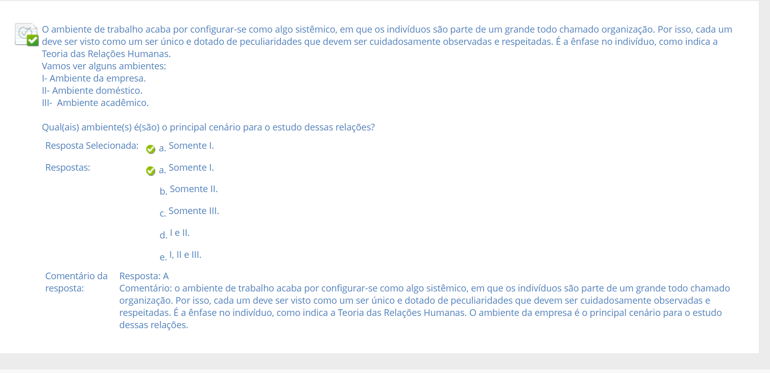 <p>ambiente de trabalho acaba por configurar-se como algo sistêmico, em que os indivíduos são parte de um grande todo chamado organização. Por isso, cada um deve ser visto como um ser único e dotado de peculiaridades que devem ser cuidadosamente observadas e respeitadas. É a ênfase no indivíduo, como indica a Teoria das Relações Humanas. Vamos ver alguns ambientes: Ambiente da empresa. II- Ambiente doméstico. III- Ambiente acadêmico. Qual(ais) ambiente(s) é(são) principal cenário para estudo dessas relações? Resposta Selecionada: a. Somente I. Respostas: a. Somente I. b. Somente II. C. Somente III. d. e. Comentário da Resposta: A resposta: Comentário: ambiente de trabalho acaba por configurar-se como algo sistêmico, em que os indivíduos são parte de um grande todo chamado organização. Por isso, cada um deve ser visto como um ser único e dotado de peculiaridades que devem ser cuidadosamente observadas e respeitadas. É a ênfase no indivíduo, como indica a Teoria das Relações Humanas. ambiente da empresa é principal cenário para o estudo dessas relações.</p>