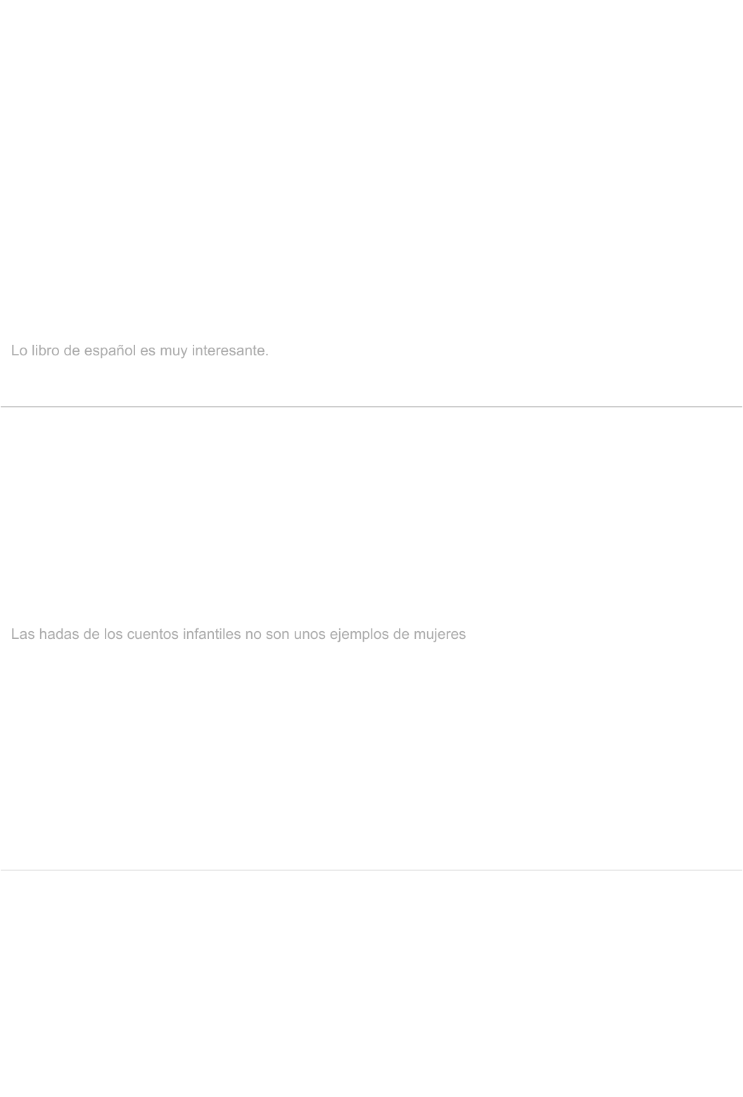 <p>Mostrar opções de resposta</p><p>Mostrar opções de resposta</p><p>Mostrar opções de resposta</p><p>Pergunta 1</p><p>Señala la alternativa INCORRECTA cuanto al uso de los artículos:</p><p>Lo más importante en la vida es nunca desistir.</p><p>El agua del sistema Cantareira se está agotando.</p><p>Estamos llegando en el trabajo.</p><p>La leche condensada engorda mucho.</p><p>Lo libro de español es muy interesante.</p><p>Pergunta 2</p><p>Indica cual alternativa corresponde, correctamente, al plural de la oración “El hada del cuento infantil no es un</p><p>ejemplo de mujer”.</p><p>Las hadas de los cuentos infantiles no son unos ejemplos de mujeres.</p><p>Las hadas de los cuentos infantis no son uns ejemplos de mujeres.</p><p>Los hadas delos cuentos infantiles no son unos ejemplos de mujeres.</p><p>Las hadas dels cuentos infantiles no son uns ejemplos de mujeres.</p><p>Los hadas dels cuentos infantiles no es un ejemplo de mujer.</p><p>Pergunta 3</p><p>Señala la alternativa en que las palabras en español empiecen con letras de sonido distinto del portugués:</p><p>queso y joven.</p><p>05/09/2024, 15:47 Comentários</p><p>https://bb.cruzeirodosulvirtual.com.br/ultra/courses/_1007541_1/outline/assessment/_18062920_1/overview/attempt/_166795607_1/review/inline-… 1/2</p><p>anton</p><p>Realce</p><p>anton</p><p>Realce</p><p>Mostrar opções de resposta</p><p>gente y xilofón.</p><p>sapo y flores.</p><p>pared y hotel.</p><p>violeta y taxi.</p><p>Pergunta 4</p><p>Las palabras físicamente y secretaría son consideradas, respectivamente, cuanto a la posición de la sílaba</p><p>tónica:</p><p>llana y sobresdrújula.</p><p>esdrújula y llana.</p><p>aguda y esdrújula.</p><p>llana y aguda.</p><p>sobresdrújula y llana.</p><p>05/09/2024, 15:47 Comentários</p><p>https://bb.cruzeirodosulvirtual.com.br/ultra/courses/_1007541_1/outline/assessment/_18062920_1/overview/attempt/_166795607_1/review/inline-… 2/2</p><p>anton</p><p>Realce</p><p>anton</p><p>Realce</p><p>anton</p><p>Realce</p>