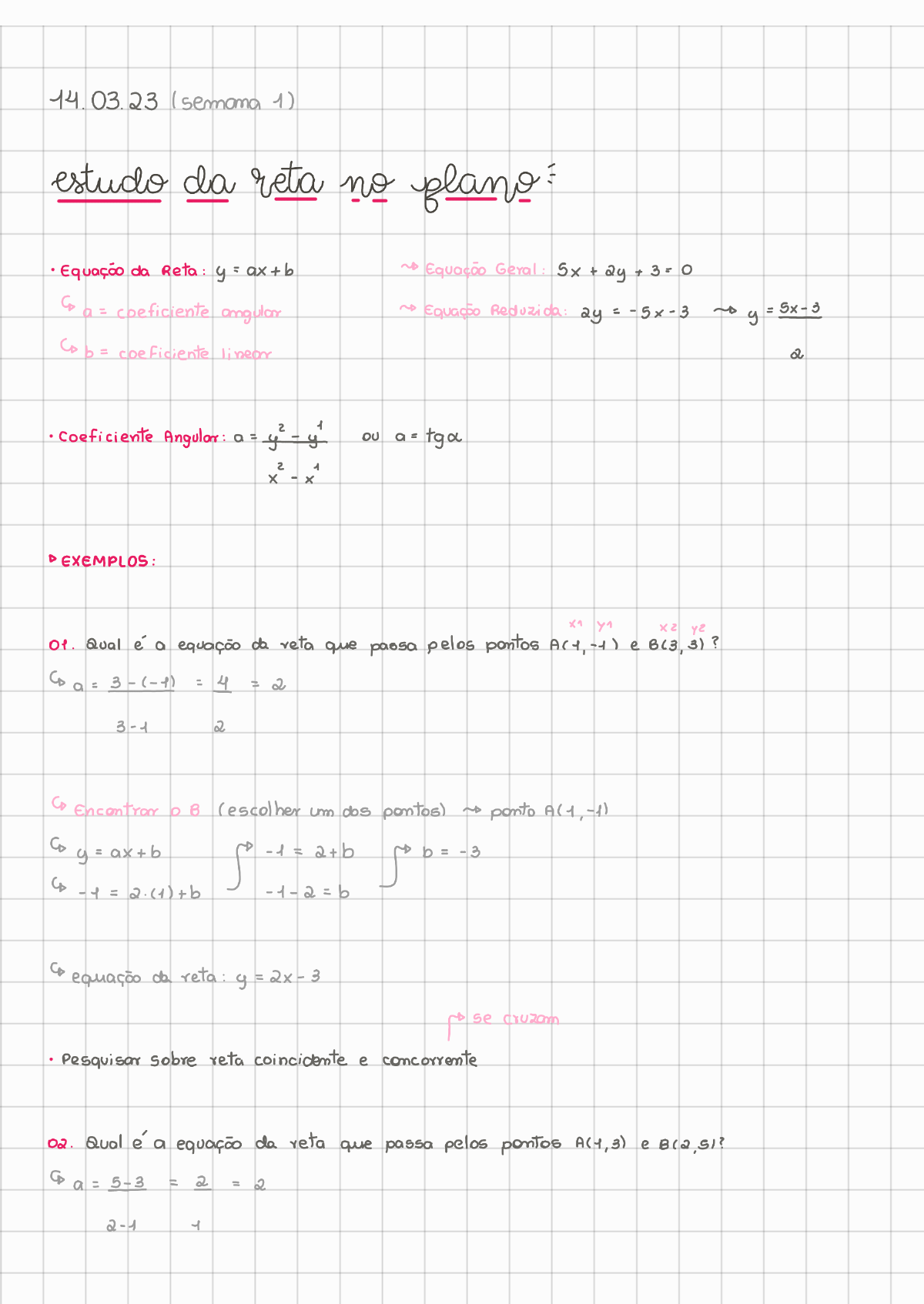 <p>03. 23 1) estudo da reta no plano da Reta: y = ax +b Equaçõo 5x + 2y + 3=0 a= cbeficiente = 5x-3 = CD coeficiente - 1 ou a= tga - 2 EXEMPLOS: Qual e a da veta que passa pelos pontos Act, ) e 3) ? CD = 3 = 4 = 2 3-1 2 Encontror um dos pontos) ponto -1) CD y = ax + b -1 = 2+b D b = 3 CD = 2.(1) + b - - 2 = b reta: = 2x - 3 se sobre reta coincidente e concorrente 02. Qual a da reta que passa pelos pontos 3) = 5-3 = 2 = 2 2-1</p><p>CD = ax+b 3 = 2+b b = = b = 3-2 y=2x+ estudo da reta no espaco Equação (x, y, 2) = + + (a,b,c) EXEMPLOS Of. Qual a equaçõo vetorial da reta que passa pelo ponto -1, 4) e que tem mesma do vetor diretor v( CD = ( -1,4) + + (2,3,2) B A 2-ponto - O2. Qual a vetorial da que passa pelos pontos e BC - 1, 7,3) e que tem mesma do vetor v(4,0,2)? CD BA = = ( = CD = + = + at y = + bt + ct EXEMPLO Quais as da reta r onde ponto pertence reta e possui vetor v(1,-2,3)?</p><p>CD x = 2 + It y = 3 = -4 + 3t = = ye a b EXEMPLO Quais as equações simetricas reta r oncle ponto A(3,0, -5) a reta e possui vetor (2, 2 trai CD = y-(-4) = (-3) 2 = y+4 = 2 -3 2 3 regra de sinais CD Reduzida ye em evidencia CD = 9+4 2x -4 - = y+4 2x - 8 = X 2 CD = L-3 3y +18 = L = - z = - 2 3 3g +18 = 2 3y + 12 = -2 3y + 12+6 = exercícios pontos ACO, e quais 500 as equações e da reta que 05 possui ?</p><p>= = = CD = + CD = -4t y= + = 2+ (-3)+ CD simetrical = L-2 = -4 3 4 3 CD = 4 y= = x-4 CD -4y+4 -4 CD = - = - 4 3 CD -4 Doobs pontos e -3,-6) encontre: a) vetorial CD BA = B-A = -3, = CD xyz = + J</p><p>CD = 3-4+ c) simetrica CD x-3 = = = -4 -3 -4 4 3 4 d) simetrica reduzida CD - 3 = - 3x = =y 4 3 - 4 CD = - 32-6 y= 32-6 3 4 -4 03. Sendo e verifique pertence a reta: = 2+3+ S: y + at = 3t = 3+ + = 213 CD = - It I at 3-1 = at 9-1 = at 8 = (noo portence) V 3 3 3 3</p><p>B) 7 = 2+3+ 5 = 3t -D + = 513 CD - -3 = - + = + at (noo 3 c) - = 2+3+ = - + 2 = 1 3 04. Qual a da reta que passa pelos pontos A(-3,7) e CD a = = (-1)-(-3) 2 CD 7 = 7 = 27 +b 14- - = b 2 2 2 CD 7 = +b 7-27 =b b= 13 2 2 2 da y= - 13 2 2</p><p>OS. a reta (x, = 2,3) + (2, quais suas equações at = 2 - = 3 + ot 06. Quais as reduzidas em de da reta formoda pelos pontos e vetor diretor = y = 2 4 5 x-4 - = y 4x - 16 = 2y 4x - 16 = =y y= 2x- - 8 V 2 4 2 = - 20 = 22+6 5x - 26 2 = 2 2 2 07. Quais as equações reduzidas reta formoda pelos pontos 2,3) e B(2,-1,3) BA = B-A = (2,-1,3) - ( - 3) = (3,-3,0) = 9-2 = 9+2 3 -3 3 3 = - - = 3x+3 = - 3 -3 3 CD 08. 05 pontos e B(3,5) qual a equação da reta que passa por esses pontos?</p><p>CD a = 5-2 = 3 CD y= 3 11 3+1 4 4 4 CD 2 = 2+3 = b V 4 4 4 Co 2= - -3 +b 8+3 =b 4 4 09. pontos e B(12,10) e a reta que passa por esses pontos? CD a = 10-0 = 10 = I 12+8 20 2 CD y= ax+b 8 + b b=4 2 da Reta: y= + 4V 2</p>