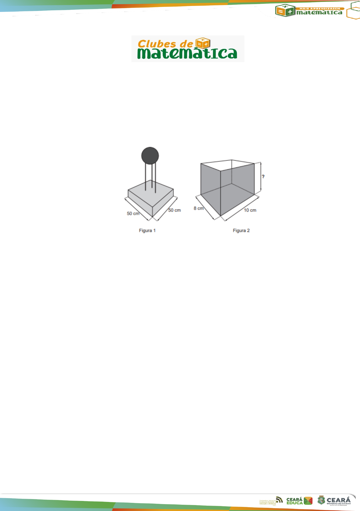 <p>SIMULADO ENEM</p><p>Conteúdo Base: Geometria</p><p>1. (ENEM 2020) Um clube deseja produzir miniaturas em escala do troféu que ganhou no</p><p>último campeonato. O troféu está representado na Figura 1 e é composto por uma</p><p>base em formato de um paralelepípedo reto-retângulo de madeira, sobre a qual estão</p><p>fixadas três hastes verticais que sustentam uma esfera de 30 cm de diâmetro, que fica</p><p>centralizada sobre a base de madeira. O troféu tem 100 cm de altura, incluída sua base</p><p>A miniatura desse troféu deverá ser instalada no interior de uma caixa de vidro, em formato de</p><p>paralelepípedo reto-retângulo, cujas dimensões internas de sua base estão indicadas na Figura</p><p>2, de modo que a base do troféu seja colada na base da caixa e distante das paredes laterais</p><p>da caixa de vidro em pelo menos 1 cm. Deve ainda haver uma distância de exatos 2 cm entre o</p><p>topo da esfera e a tampa dessa caixa de vidro. Nessas condições deseja-se fazer a maior</p><p>miniatura possível. A medida da altura, em centímetro, dessa caixa de vidro deverá ser igual a</p><p>a) 12</p><p>b) 14</p><p>c) 16</p><p>d) 18</p><p>e) 20</p><p>2. (ENEM 2020) O fenômeno das manifestações populares de massa traz à discussão</p><p>como estimar o número de pessoas presentes nesse tipo de evento. Uma metodologia</p><p>usada é: no momento do ápice do evento, é feita uma foto aérea da via pública</p><p>principal na área ocupada, bem como das vias afluentes que apresentem</p><p>aglomerações de pessoas que acessam a via principal. A foto é sobreposta por um</p><p>mapa virtual das vias, ambos na mesma escala, fazendo-se um esboço geométrico da</p><p>situação. Em seguida, subdivide-se o espaço total em trechos, quantificando a</p><p>densidade, da seguinte forma:</p><p>• 4 pessoas por metro quadrado, se elas estiverem andando em uma mesma direção;</p><p>• 5 pessoas por metro quadrado, se elas estiverem se movimentando sem deixar o</p><p>local;</p><p>• 6 pessoas por metro quadrado, se elas estiverem paradas.</p><p>É feito, então, o cálculo do total de pessoas, considerando os diversos trechos, e</p><p>desconta-se daí 1 000 pessoas para cada carro de som fotografado</p><p>Com essa metodologia, procederam-se aos cálculos para estimar o número de</p><p>participantes na manifestação cujo esboço geométrico é dado na figura. Há três</p><p>trechos na via principal: MN, NO e OP, e um trecho numa via afluente da principal: QR</p><p>.</p><p>Segundo a metodologia descrita, o número estimado de pessoas presentes a essa</p><p>manifestação foi igual a</p><p>a) 110 000.</p><p>b) 104 000.</p><p>c) 93 000.</p><p>d) 92 000.</p><p>e) 87 000.</p><p>3. (ENEM 2020) Uma das Sete Maravilhas do Mundo Moderno é o Templo de Kukulkán,</p><p>localizado na cidade de Chichén Itzá, no México. Geometricamente, esse templo pode</p><p>ser representado por um tronco reto de pirâmide de base quadrada.</p><p>As quantidades de cada tipo de figura plana que formam esse tronco de pirâmide são</p><p>a) 2 quadrados e 4 retângulos.</p><p>b) 1 retângulo e 4 triângulos isósceles.</p><p>c) 2 quadrados e 4 trapézios isósceles.</p><p>d) 1 quadrado, 3 retângulos e 2 trapézios retângulos.</p><p>e) 2 retângulos, 2 quadrados e 2 trapézios retângulos</p><p>4. (ENEM 2020) Num recipiente com a forma de paralelepípedo reto-retângulo, colocou-</p><p>se água até a altura de 8 cm e um objeto, que ficou flutuando na superfície da água.</p><p>Para retirar o objeto de dentro do recipiente, a altura da coluna de água deve ser de,</p><p>pelo menos, 15 cm. Para a coluna de água chegar até essa altura, é necessário</p><p>colocar dentro do recipiente bolinhas de volume igual a 6 cm³ cada, que ficarão</p><p>totalmente submersas.</p><p>O número mínimo de bolinhas necessárias para que se possa retirar o objeto que flutua</p><p>na água, seguindo as instruções dadas, é de</p><p>a) 14.</p><p>b) 16.</p><p>c) 18.</p><p>d) 30.</p><p>e) 34.</p><p>5. (ENEM 2020) Azulejo designa peça de cerâmica vitrificada e/ou esmaltada usada,</p><p>sobretudo, no revestimento de paredes. A origem das técnicas de fabricação de</p><p>azulejos é oriental, mas sua expansão pela Europa traz consigo uma diversificação de</p><p>estilos, padrões e usos, que podem ser decorativos, utilitários e arquitetônicos.</p><p>Disponível em: www.itaucultural.org.br. Acesso em: 31 jul. 2012</p><p>Azulejos no formato de octógonos regulares serão utilizados para cobrir um painel</p><p>retangular conforme ilustrado na figura.</p><p>Entre os octógonos e na borda lateral dessa área, será necessária a colocação de 15</p><p>azulejos de outros formatos para preencher os 15 espaços em branco do painel. Uma loja</p><p>oferece azulejos nos seguintes formatos:</p><p>1 – Triângulo retângulo isósceles;</p><p>2 – Triângulo equilátero;</p><p>3 – Quadrado.</p><p>Os azulejos necessários para o devido preenchimento das áreas em branco desse painel são</p><p>os de formato</p><p>a) 1.</p><p>b) 3.</p><p>c) 1 e 2.</p><p>d) 1 e 3.</p><p>e) 2 e 3.</p><p>6. (ENEM 2020) No período de fim de ano, o síndico de um condomínio resolveu colocar,</p><p>em um poste, uma iluminação natalina em formato de cone, lembrando uma árvore de</p><p>Natal, conforme as figuras 1 e 2.</p><p>A árvore deverá ser feita colocando-se mangueiras de iluminação, consideradas</p><p>segmentos de reta de mesmo comprimento, a partir de um ponto situado a 3 m de altura no</p><p>poste até um ponto de uma circunferência de fixação, no chão, de tal forma que esta fique</p><p>dividida em 20 arcos iguais. O poste está fixado no ponto C (centro da circunferência)</p><p>perpendicularmente ao plano do chão.</p><p>Para economizar, ele utilizará mangueiras de iluminação aproveitadas de anos anteriores,</p><p>que juntas totalizaram pouco mais de 100 m de comprimento, dos quais ele decide usar</p><p>exatamente 100 m e deixar o