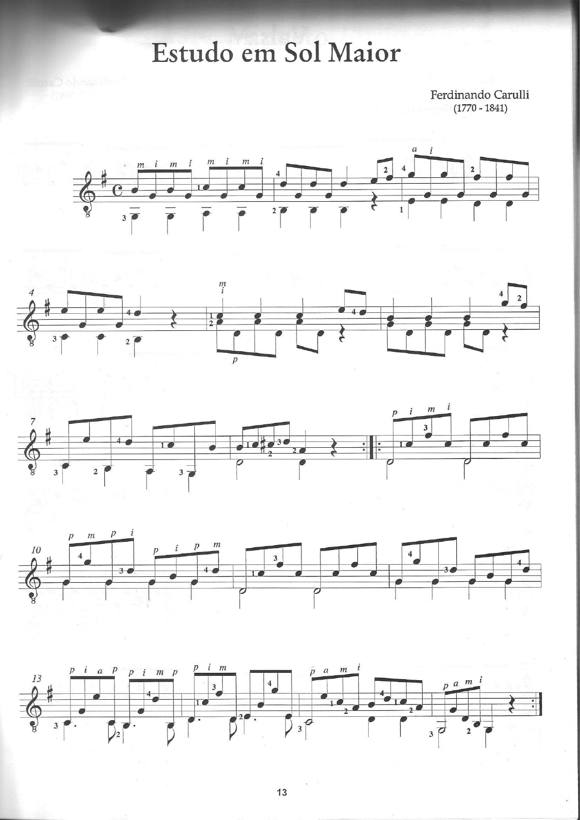 <p>Estudo em Sol Maior Ferdinando Carulli (1770 1841) m m i m 2 4 2 4 2 1 3 4 4 2 4 2 3 2 7 3 4 + 2 3 2 3 p m i m 10 p 4 4 3 4 3 3 p m p i m p a 13 4 3 pami 4 4 + 2 2 2 3 3 2 3 2 13</p>