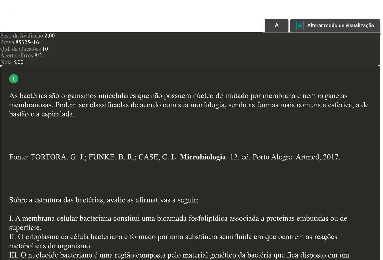 <p>A Alterar modo de visualização Peso da Avaliação 2,00 Prova 85325416 Qtd. de Questões 10 Acertos/Erros 8/2 Nota 8,00 1 As bactérias são organismos unicelulares que não possuem núcleo delimitado por membrana e nem organelas membranosas. Podem ser classificadas de acordo com sua morfologia, sendo as formas mais comuns a esférica, a de bastão e a espiralada. Fonte: TORTORA, G.J.; FUNKE, B. R.; CASE, C. L. Microbiologia. 12. ed. Porto Alegre: Artmed, 2017. Sobre a estrutura das bactérias, avalie as afirmativas a seguir: I. A membrana celular bacteriana constitui uma bicamada fosfolipídica associada a proteínas embutidas ou de II. O citoplasma da célula bacteriana é formado por uma substância semifluida em que ocorrem as reações metabólicas do organismo. III. O nucleoide bacteriano é uma região composta pelo material genético da bactéria que fica disposto em um</p><p>cromossomo único, superenovelado e circular. IV. Os ribossomos bacterianos são as organelas responsáveis pela síntese proteica e possuem as mesmas características físicas e químicas que os ribossomos dos eucariotos. É correto que se afirma em: A II e III, apenas. B IV. C III e IV, apenas. D I, II e III, apenas. 2 A coloração de Gram é um passo muito importante na caracterização e classificação inicial das bactérias. Afinal, esse método de coloração permite que as bactérias sejam visualizadas no microscópio óptico, uma vez que sem a coloração é impossível observá-las ou identificar sua estrutura. O método de coloração de Gram recebeu esse nome em homenagem ao patologista Hans Christian Joachim Gram que realizou a descoberta em 1884 e, aliás, até hoje continua sendo a mais utilizada nos laboratórios de análises clínicas e microbiologia. Através da coloração é possível identificar e diferenciar os dois principais grupos de bactérias, sejam Gram-positivas ou Gram-negativas.</p><p>Em suma, procedimento de coloração de Gram permite que as bactérias retenham a cor com base nas diferenças nas propriedades químicas e físicas da parede celular. De fato, uso dos corantes permite aumentar contraste e evidenciar a estrutura bacteriana. Disponível Acesso em: 10 abr. 2023. Considerando esse contexto, avalie as asserções a seguir e a relação proposta entre elas: I. As bactérias Gram-positivas são mais suscetíveis a corantes de Gram do que as bactérias Gram-negativas. PORQUE II. As bactérias Gram-positivas possuem uma parede celular mais espessa e rígida, composta principalmente por peptidoglicano, que retém corante de cristal violeta durante processo de coloração. A respeito dessas asserções, assinale a opção correta:</p><p>A As asserções I e II são proposições verdadeiras, e a II é uma justificativa correta da I. B A asserção I é uma proposição verdadeira, e a II é uma proposição falsa. C As asserções I e II são proposições verdadeiras, mas a II não é uma justificativa correta da I. D A asserção I é uma proposição falsa, e a II é uma proposição verdadeira. 3 Os agentes de doenças infecciosas humanas pertencem a cinco principais grupos de organismos: bactérias, fungos, protozoários, helmintos e vírus. As bactérias pertencem ao reino dos procariotos, os fungos e os protozoários são membros do reino protista e os helmintos (vermes) são classificados no reino animal. Os vírus são bastante distintos dos demais organismos - não exibem natureza celular, mas só conseguem replicar-se no interior de células. Fonte: LEVINSON, W. Microbiologia médica e imunologia. 10 ed. Porto Alegre: Artmed, 2010.</p><p>Sobre os microrganismos, assinale a alternativa correta: O formato dos vírus é determinado de acordo com os capsômeros, que são estruturas extremamente simples e A facilmente cultivados em laboratórios em meios artificiais. Os ribossomos bacterianos, locais em que ocorre a síntese de proteínas, são iguais aos ribossomos em células B eucariontes. C Os fungos são eucariontes, ou seja, apresentam núcleo delimitado por carioteca, e podem ser unicelulares ou multicelulares. D Os fungos, assim como os podem apresentar estruturas de material genético denominadas de plasmídeo. 4 [Laboratório Virtual - Coloração de Gram] A técnica de Coloração de Gram é uma das mais tradicionais para a observação da morfologia e classificação preliminar de bactérias em Gram-positivas ou Gram-negativas. Sobre as características da técnica de coloração de Gram, assinale a alternativa CORRETA:</p><p>É uma técnica de coloração morfológica, pois torna possível visualizar a morfologia bacteriana e sua coloração é A tipicamente azul, vermelha ou amarela. B É uma técnica de coloração diferencial, pois os reagentes atuam de maneira diferente nos distintos tipos de bactérias, com base na estrutura da parede celular. C É uma técnica de coloração preferencial, pois os reagentes utilizados são preferencialmente absorvidos por determinado tipo de bactéria, baseado nas características do núcleo celular. É uma técnica de coloração artificial, pois utiliza reagentes químicos feitos em laboratório, cada um deles capaz D de degradar a parede celular bacteriana e mostrar cromossomo. 5 A maioria das bactérias varia de 0,2 a 2 um de diâmetro e de 2 a 8 um de comprimento. Elas podem apresentar uma diversidade morfológica de esfera (cocos, que significa frutificação), de bastão (bacilos, que significa bastonete ou bengala) e de espiral.</p><p>Fonte: TORTORA, G. J.; FUNKE, B. R.; CASE, C.L. Microbiologia. 12. ed. Porto Alegre: Artmed, 2017. Sobre os tipos de bactérias, avalie as afirmativas a seguir: I. Os bacilos são bactérias com estrutura alongada ou cilíndrica. II. Os cocos são bactérias com estrutura esférica ou arredondada. III. Os espirilos são bactérias espirais, longas e com a presença de flagelos. IV. As espiroquetas são bactérias espirais, flexíveis e que realizam contrações citoplasmá