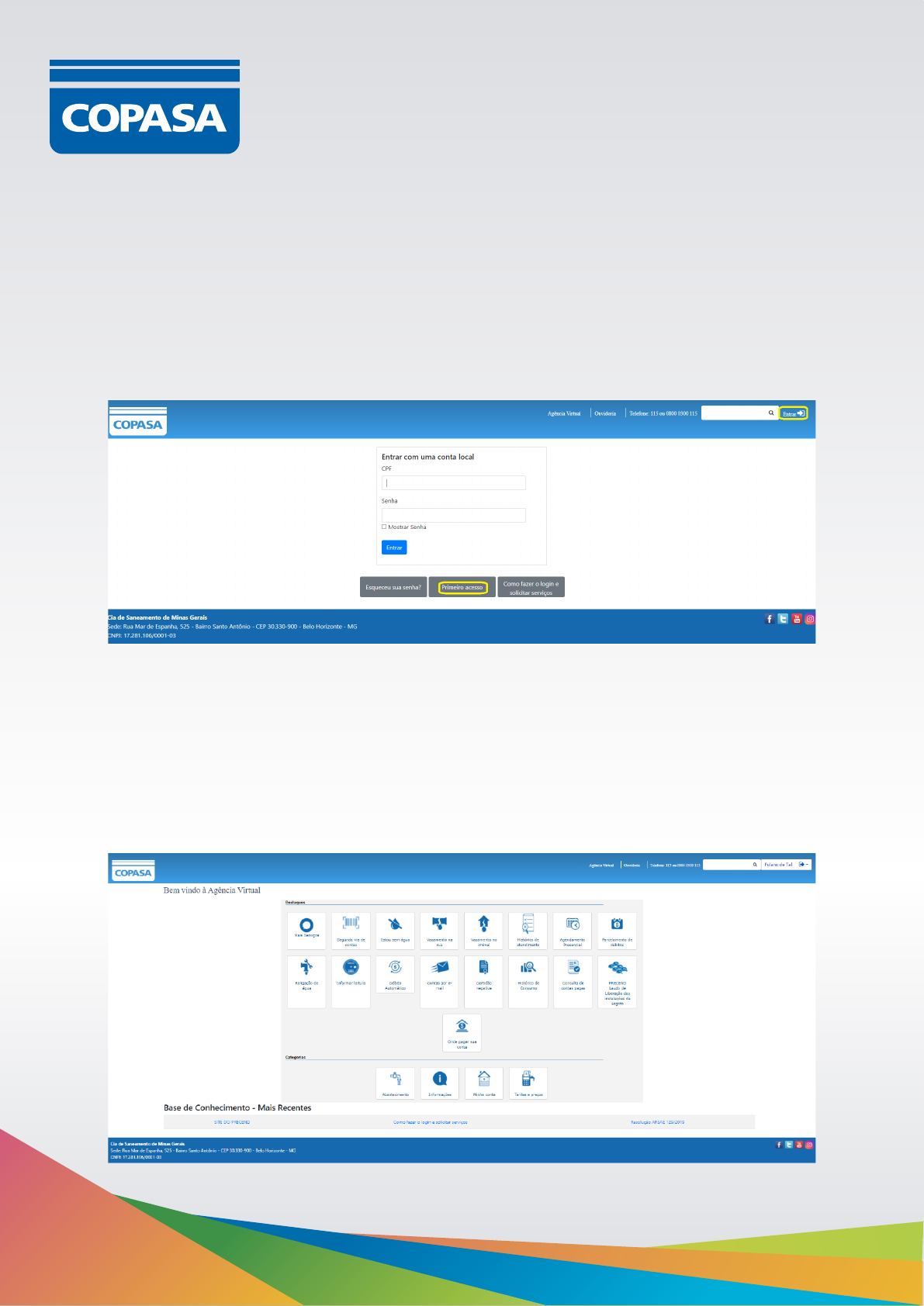 <p>O próximo passo para registrar solicitações de serviço na Agência Virtual é fazer o seu</p><p>cadastro no portal. Caso seja sua primeira vez nesta nova página, acesse o endereço web</p><p>acima, clique em Entrar, Primeiro Acesso e preencha as informações solicitadas.</p><p>Para solicitar serviços à Copasa, digite o endereço http://www.copasa.com.br/ em seu</p><p>navegador e, em seguida, escolha Agência Virtual. Utilize sempre um desses</p><p>navegadores: Microsoft Edge, Google Chrome ou Mozilla Firefox (versão 77 ou superior).</p><p>Como fazer login e solicitar serviços</p><p>São sempre cadastrados os dados de quem está acessando o portal, ou seja, da pessoa</p><p>física. Depois de incluídas as informações básicas, você será redirecionado para a página</p><p>de login da Agência Virtual.</p><p>Uma vez que você tenha se autenticado com sucesso, será exibida a página principal da</p><p>Agência Virtual, conforme imagem abaixo:</p><p>Por padrão, já são exibidos os identificadores, vinculados às suas matrículas existentes na</p><p>base comercial da Copasa, desde que você possua imóveis em seu CPF e com instalação</p><p>de água e/ou esgoto. Além desses, serão exibidos os identificadores associados</p><p>anteriormente por você.</p><p>Caso o imóvel para o qual você deseja fazer a solicitação de serviço não esteja listado, é</p><p>necessário realizar primeiramente o que se denomina de Associação de Identificador.</p><p>Essa associação permite que o usuário faça requisições de serviço em nome dos titulares</p><p>desses identificadores, sejam pessoas físicas (outros CPFs) ou jurídicas (CNPJs). Neste</p><p>caso, escolha a opção Associar Identificador.</p><p>Ao solicitar um serviço, a tela abaixo é apresentada:</p><p>a) 'Identificador', disponível na fatura da Copasa;</p><p>b) 'CPF' ou 'CNPJ' que esteja vinculado ao identificador fornecido.</p><p>Na tela abaixo preencha:</p><p>Como fazer login e solicitar serviços</p><p>Após preencher os dois campos, clique no botão Adicionar. O sistema validará as</p><p>informações fornecidas e, caso estejam corretas, retornará uma mensagem de Sucesso,</p><p>conforme imagem abaixo:</p><p>Agora é só seguir as novas instruções que aparecerem na tela. Cada serviço vai apresentar</p><p>opções específicas, e, por isso, as telas vão variar, dependendo de qual solicitação você</p><p>deseja realizar.</p><p>Volte à página da Agência Virtual e escolha o serviço que deseja solicitar. A página</p><p>seguinte apresentará o protocolo do atendimento, assim como a lista de identificadores,</p><p>vinculados às suas matrículas. Escolha para qual imóvel você deseja registrar o serviço e</p><p>clique em Prosseguir.</p><p>Como fazer login e solicitar serviços</p>