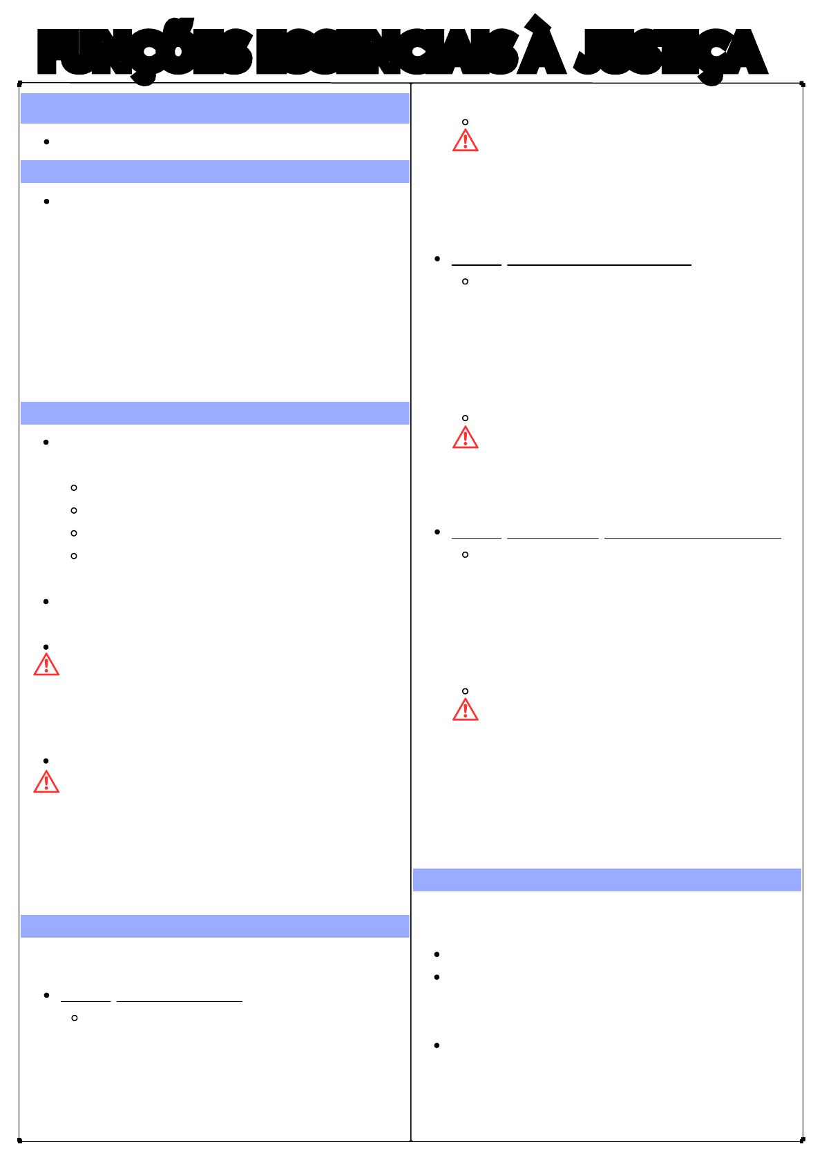 <p>FUNÇÕES ESSENCIAIS À JUSTIÇAFUNÇÕES ESSENCIAIS À JUSTIÇA</p><p>@constitucionalempauta</p><p>MINISTÉRIO PÚBLICO</p><p>Não faz parte do Poder Judiciário.</p><p>Natureza Jurídica</p><p>A Constituição Federal, instituiu o</p><p>Ministério Público como um órgão</p><p>autônomo e independente, não</p><p>subordinado a qualquer dos Poderes</p><p>da República, consistindo em autêntico</p><p>fiscal da nossa Federação, da separação</p><p>dos Poderes, da moralidade pública, da</p><p>legalidade, do regime democrático e dos</p><p>direitos e garantias constitucionais.</p><p>Estrutura do Ministério Público</p><p>Ministério Público da União (MPU), que</p><p>compreende:</p><p>Ministério Público Federal (MPF)</p><p>Ministério Público do Trabalho (MPT)</p><p>Ministério Público Militar (MPM)</p><p>Ministério Público do Distrito Federal</p><p>e Territórios (MPDFT)</p><p>Ministério Público dos Estados</p><p>O Ministério Público do Tribunal de</p><p>Contas NÃO é órgão do Ministério</p><p>Público, e sim órgão vinculado ao</p><p>próprio tribunal que lhe empresta o</p><p>nome.</p><p>Temos também o Ministério Público</p><p>Eleitoral que é órgão do Ministério</p><p>Público, apesar da omissão</p><p>constitucional. Entretanto, não há</p><p>concurso para ocupar cargo, pois é</p><p>composto por membros do Ministério</p><p>Público Federal e dos Estados.</p><p>Estrutura do Ministério Público</p><p>Princípio da Unidade</p><p>Os integrantes do Ministério Público</p><p>fazem parte de uma única</p><p>instituição, sendo dirigidos por um</p><p>mesmo chefe institucional (PGR) e</p><p>possuidores das mesmas prerroga-</p><p>tivas funcionais. Não existe divisão</p><p>Os princípios institucionais do MP, estão</p><p>dispostos no art. 127, §1°da CF/88, que são:</p><p>funcional. O Ministério Público é Uno.</p><p>Mas, não se pode confundir o</p><p>Ministério Público da União com os</p><p>Ministérios Públicos Estaduais, pois</p><p>existe uma divisão orgânica. Assim,</p><p>a unidade que existe é a de cada um</p><p>dos Ministérios Públicos.</p><p>Princípio da indivisibilidade</p><p>Os membros do Ministério Público</p><p>não se vinculam aos processos em</p><p>que atuam, podendo ser substituídos</p><p>uns pelos outros, de acordo com as</p><p>regras legais, sem nenhum prejuízo</p><p>para o processo.</p><p>Da mesma forma que o princípio da</p><p>unidade, não há que se falar em</p><p>indivisibilidade entre os diferentes</p><p>Ministérios Públicos, devendo existir</p><p>somente dentro de cada um deles.</p><p>Princípio da Independência Funcional</p><p>O Ministério Público não se sujeita a</p><p>ordens de ninguém, de nenhum dos</p><p>Poderes do Estado; seus membros</p><p>não devem obediência a instruções</p><p>vinculantes de nenhuma autoridade</p><p>pública.</p><p>Nem mesmo seus superiores</p><p>hierárquicos podem impor-lhes</p><p>ordens no sentido de agir desta ou</p><p>daquela maneira em um</p><p>determinado processo, haja vista que</p><p>a relação de subordinação existen-</p><p>te entre eles é meramente adminis-</p><p>trativa, e não funcional.</p><p>Ingresso no Ministério Público</p><p>Bacharel em Direito.</p><p>Comprovação de três anos, no mínimo,</p><p>de atividade jurídica, condição imposta</p><p>pela EC n. 45/04.</p><p>Aprovação em concurso público de</p><p>provas e títulos, com a obrigatória</p><p>participação da OAB em sua realização</p><p>(art. 129, §3° da CF/88).</p><p>O ingresso na carreira do MP, depende do</p><p>preenchimento dos seguintes requisitos:</p><p>Licenciado para - T</p><p>erezinha C</p><p>abral - undefined - P</p><p>rotegido por E</p><p>duzz.com</p><p>@constitucionalempauta</p><p>Garantias aos membros do Ministério</p><p>Público</p><p>Autonomia Funcional</p><p>O Ministério Público não se sujeita a</p><p>controle elaborado por qualquer dos</p><p>Poderes;</p><p>Autonomia Administrativa</p><p>Temos a capacidade de autogestão,</p><p>que resulta na escolha de seus</p><p>órgãos diretivos, na autorização para</p><p>realizar seus próprios concursos</p><p>públicos, no exercício da iniciativa de</p><p>apresentação de projetos de lei para</p><p>organização de sua estrutura interna,</p><p>etc;</p><p>Autonomia Financeira</p><p>Capacidade de elaborar sua proposta</p><p>orçamentária, dentro dos limites</p><p>estabelecidos na Lei de Diretrizes</p><p>Orçamentária.</p><p>Vitaliciedade</p><p>Membro do MP se torna vitalício</p><p>após dois anos de efetivo exercício,</p><p>não podendo mais perder o cargo</p><p>senão após decisão judicial</p><p>transitada em julgado.</p><p>Inamovibilidade</p><p>Membros do MP, uma vez titulares</p><p>do cargo, somente poderão ser</p><p>removidos, ou mesmo promovidos,</p><p>por iniciativa própria. Não podem,</p><p>portanto, ser removidos ou</p><p>promovidos ex officio e de forma</p><p>unilateral, sem que haja solicitação</p><p>ou autorização.</p><p>EXCEÇÃO: por motivo de interesse</p><p>público, mediante decisão, por</p><p>maioria absoluta de votos, do órgão</p><p>colegiado competente (que é o</p><p>Conselho Nacional do Ministério</p><p>Público), assegurada ampla defesa.</p><p>GARANTIAS INSTITUCIONAIS</p><p>GARANTIAS PRÓPRIAS DOS MEMBROS</p><p>DO MP</p><p>Diante do art. 128, §5°, I, da CF/88, vamos ter</p><p>as seguintes garantias aos membros do MP:</p><p>Irredutibilidade de subsídio</p><p>Essa garantia da irredutibilidade</p><p>assegura que os membros do MP</p><p>não sofram pressões por diminui-</p><p>ções remuneratórias indevidas no</p><p>exercício de suas funções e</p><p>atribuições.</p><p>Para que o membro do MP faça jus as</p><p>garantias de inamovibilidade e</p><p>irredutibilidade de subsídio, não é</p><p>necessário que tenha vitaliciedade, pois</p><p>vão ter assim que ingressar na</p><p>carreira.</p><p>Vedações aos membros do Ministério</p><p>Público</p><p>De acordo com o art. 128, §5°, II,