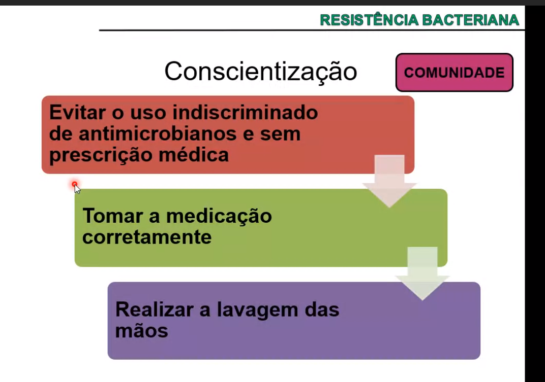 <p>RESISTÊNCIA BACTERIANA Conscientização COMUNIDADE Evitar o uso indiscriminado de antimicrobianos e sem prescrição médica Tomar a medicação corretamente Realizar a lavagem das mãos</p>