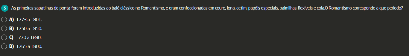 <p>5 As primeiras sapatilhas de ponta foram introduzidas ao balé clássico no Romantismo, e eram confeccionadas em couro, lona, cetim, papéis especiais, palmilhas flexíveis e cola.0 Romantismo corresponde a que período? A) 1773 a 1801. B) 1750 a 1850. C) 1770 a 1880. D) 1765 a 1800.</p>
