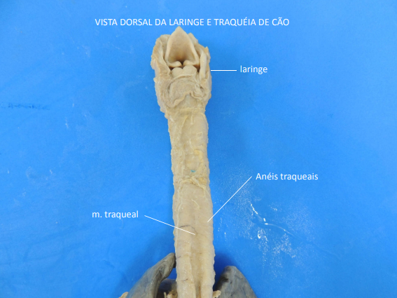 <p>VISTA DORSAL DA LARINGE E TRAQUÉIA DE CÃO laringe Anéis traqueais m. traqueal</p>