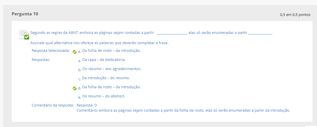 <p>Pergunta 10 0.5 em 0.5 pontos Segundo as regras da embora as páginas sejam contadas a partir elas só serão enumeradas a partir Assinale qual alternativa nos oferece as palavras que deverão completar a frase. Resposta Selecionada: d. Da folha de rosto - da introdução. Respostas: a. Da capa - da b. Do resumo - dos agradecimentos. Da introdução - do resumo. d. Da folha de rosto - da introdução. e. Do resumo - do abstract. Comentário da resposta: Resposta: D Comentário: embora as páginas sejam contadas a partir da folha de rosto, elas só serão enumeradas a partir da introdução.</p>