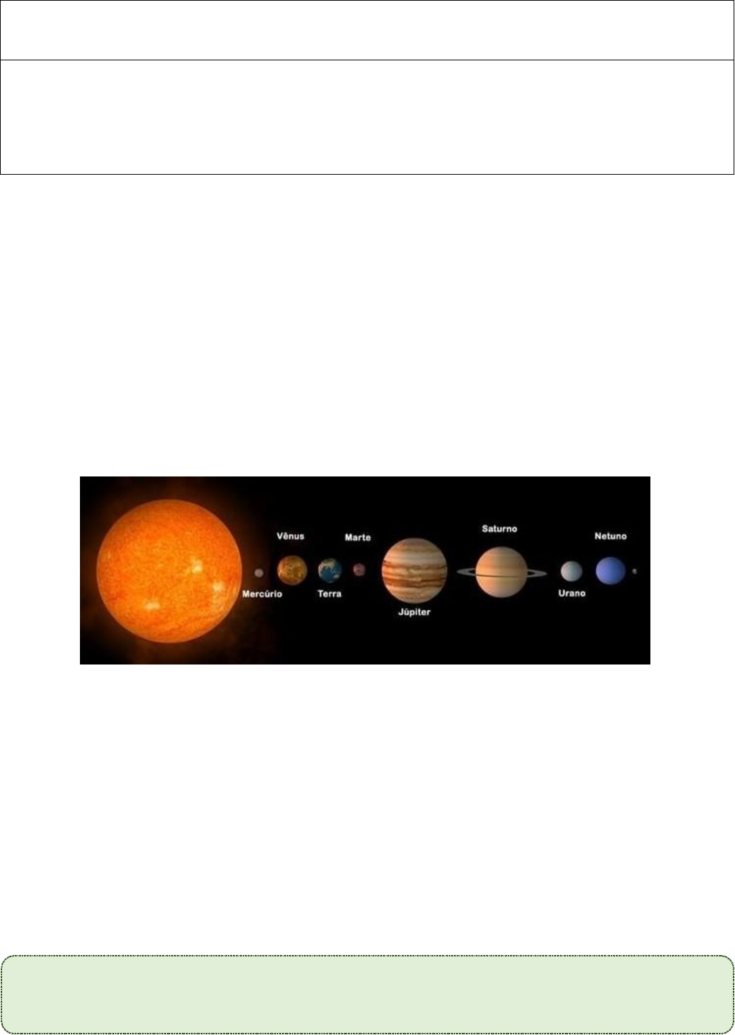 <p>EEEFM “São João do Sobrado”.</p><p>Ciências – Prof: Kamyla Amorim</p><p>Data – 20/10/2023</p><p>Conteúdo: Terra e Universo</p><p>Descritor: D063_CN: Analisar o movimento de corpos no Sistema Solar.</p><p>Sistema Solar e seus Planetas</p><p>Um Sistema Solar é composto por um Sol e todos os planetas e corpos celestes que orbitam ao redor dessa estrela. Há casos de sistemas solares formados por duas estrelas (binários) ou até três estrelas (ternários). Mas no caso do sistema do qual o nosso planeta, a Terra, faz parte, há apenas uma estrela, que é considerada de pequeno porte.</p><p>Além do sol, existem no Sistema Solar um total de oito planetas, cinco planetas anões, 179 luas e uma grande quantidade de corpos celestes, como asteroides, cometas e outros, incluindo aqueles presentes no Cinturão de Kuiper. A idade estimada para a formação desse Cinturão de Kuiper é de pouco mais que 4,6 bilhões de anos.</p><p>Os oito planetas do Sistema Solar, em ordem de proximidade ao sol, são: Mercúrio, Vênus, Terra, Marte, Júpiter, Saturno, Urano e Netuno. Os planetas anões são: Ceres, Plutão, Haumea, Makemake e Éris, com a possibilidade de inclusão de dezenas de outros nessa categoria nos próximos anos. Plutão já foi considerado como um planeta, mas, a partir de 2006, foi “rebaixado” à categoria de planeta anão.</p><p>Planetas do Sistema Solar. Disponível em: <https://tinyurl.com/5y8atc8j>. Adaptado. Acesso em 22 set. 2021.</p><p>Entre os planetas citados, os quatro primeiros são planetas rochosos, ou seja, apresentam uma superfície composta por uma litosfera rochosa. Esses planetas, por se encontrarem mais próximos ao sol, apresentam uma atmosfera gasosa com diferentes composições. Os quatro últimos planetas são chamados de planetas gasosos por não possuírem uma superfície rochosa e serem compostos por uma densa atmosfera, sendo muito maiores em razão das baixas temperaturas e do afastamento em relação ao sol.</p><p>É possível, dessa forma, dividir o Sistema Solar em três partes ou etapas. A primeira, mais quente, é composta pelos planetas rochosos, onde se encontra a Terra. A segunda, mais fria, é formada pelos planetas gigantes gasosos. E a terceira, ainda mais remota e congelada, é formada pelos objetos transnetunianos, ou seja, que estão além da órbita do Netuno, o que inclui quase todos os planetas anões, o Cinturão de Kuiper e alguns outros corpos celestes recentemente descobertos.</p><p>Disponível em: <https://tinyurl.com/y2ml8c8v>. Adaptado. Acesso em 22 set. 2021.</p><p>O sistema solar normalmente não é representado em sua escala de tamanho real, devido ao tamanho massivo do Sol, o que faz com que os planetas rochosos como a Terra quase desapareçam da visualização, além das distâncias serem muito grandes.</p><p>Galáxias e o Universo</p><p>Aumentando a nossa lupa de visualização, partimos para uma escala maior. Os sistemas solares são compostos por planetas e corpos celestes, mas galáxias são compostas basicamente por milhões, bilhões ou trilhões de estrelas que possuem seus respectivos sistemas solares. Mas existem também os exoplanetas, corpos celestes que não estão orbitando nenhuma estrela, poeira cósmica e outros elementos astronômicos que ficam em um centro comum, o centro luminoso e energético de uma galáxia. A força da gravidade é a principal responsável pela união dos componentes de uma determinada galáxia. A galáxia que nosso sistema solar está localizado é conhecida como Via Láctea.</p><p>Via Láctea. Disponível em: <https://tinyurl.com/5xbydxt9>.</p><p>Acesso em 22 set. 2021.</p><p>Até o começo do século XX acreditava-se que estas manchas longas e difusas no espaço com um brilho intenso no meio eram apenas aglomerados de estrelas, os quais receberam o nome de “nebulosas” e foram catalogadas às centenas até que em 1923, Edwin Powell Hubble, conseguiu provar definitivamente que as tais nebulosas de formato espiral eram na verdade objetos extra galácteos (fora da nossa galáxia). Ou seja, eram galáxias completamente independentes.</p><p>Nebulosa captada pelo Hubble. Disponível em:</p><p><https://tinyurl.com/b7zy2mt4>. Acesso em 22 set. 2021.</p><p>Já naquela época sabia-se que a extensão de nossa galáxia era de 100 mil anos-luz de diâmetro. Baseado nisso, e na identificação de uma “variável Cefeida” (relação conhecida entre período e luminosidade das Cefeidas, estrelas pulsantes de curto período) na nebulosa de Andrômeda (M31), ele conseguiu calcular a distância de M31, comprovando que ela se situava fora dos limites da Via Láctea.</p><p>A partir daí, o próprio Hubble classificou as galáxias de acordo com sua forma em: elípticas, espirais e espirais barradas. As que não apresentam uma forma definida são chamadas de irregulares, mas de acordo com a classificação de Hubble, estão em uma quarta categoria à parte.</p><p>· Galáxias espirais – possuem extensos braços de estrelas e nuvens de poeira cósmica.</p><p>· Galáxias espirais em barra – apresentam braços de estrelas e núcleo central menos desenvolvido se comparado às galáxias espirais.</p><p>· Galáxias elípticas – são formadas por um grande conjunto de estrelas e pouca poeira cósmica.</p><p>· Galáxias irregulares – recebem esse nome por não apresentarem forma definida.</p><p>O conjunto de galáxias é conhecido como supercluster ou superaglomerado de galáxias (tradução livre) sendo estimados cerca de 10 milhões de supercluster no universo e, por exemplo, o supercluster que nossa galáxia está localizada, o Supercluster de Virgem, contém cerca de 50 mil galáxias.</p><p>Estima-se que existam cerca de 200 milhões de galáxias no universo.</p><p>Disponível em: <https://tinyurl.com/y4tb3j33> e <https://tinyurl.com/yyj395hz>. Adaptado. Acesso em 22 set. 2021.</p><p>Vamos conhecer mais sobre os planetas do Sistema Solar? Se possível, assista ao vídeo:</p><p><h