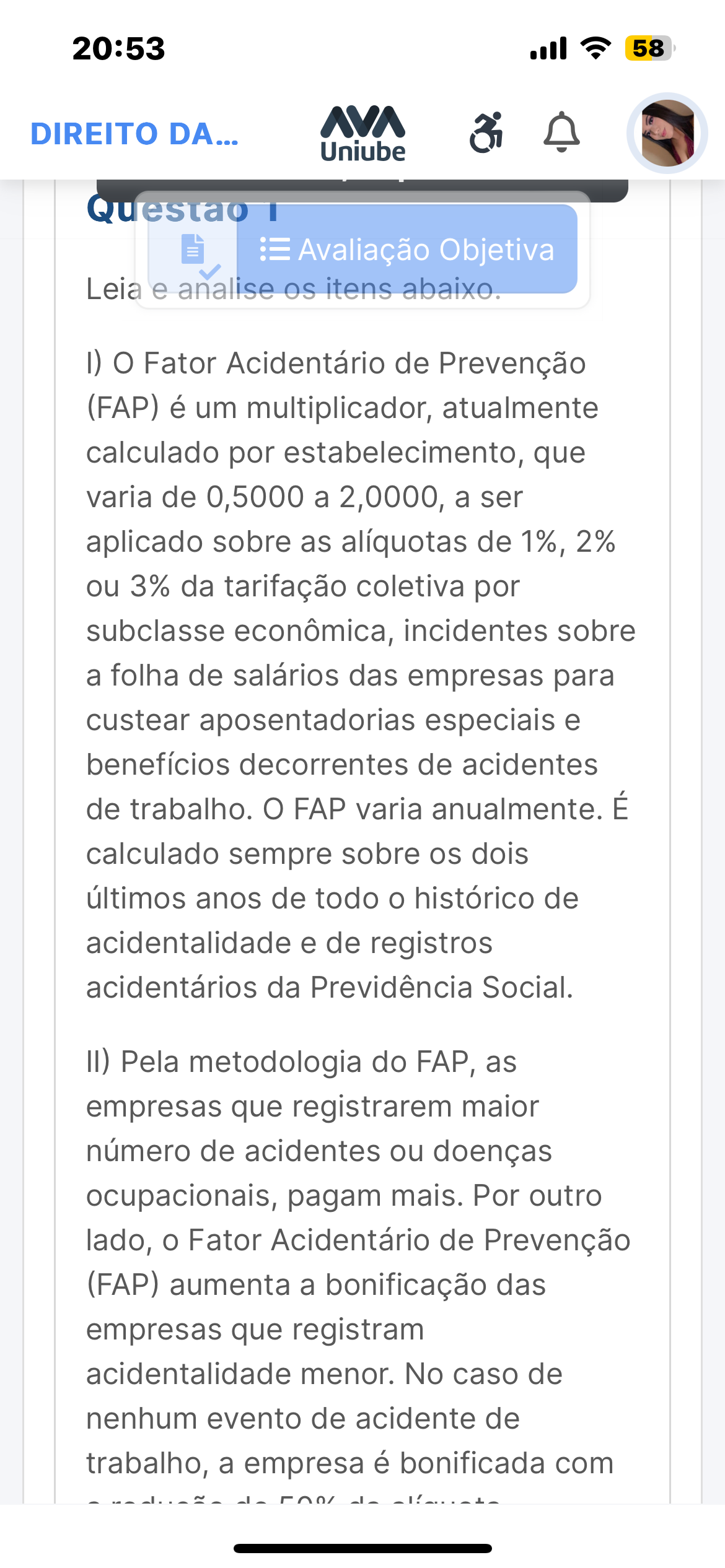 <p>20:53 58 DIREITO DA... AVA 3i Uniube Questao Avaliação Objetiva Leia e analise itens abaixo. O Fator Acidentário de Prevenção (FAP) é um multiplicador, atualmente calculado por estabelecimento, que varia de 0,5000 a 2,0000, a ser aplicado sobre as alíquotas de 1%, 2% ou 3% da tarifação coletiva por subclasse econômica, incidentes sobre a folha de salários das empresas para custear aposentadorias especiais e benefícios decorrentes de acidentes de trabalho. O FAP varia anualmente. É calculado sempre sobre os dois últimos anos de todo histórico de acidentalidade e de registros acidentários da Previdência Social. II) Pela metodologia do FAP, as empresas que registrarem maior número de acidentes ou doenças ocupacionais, pagam mais. Por outro lado, Fator Acidentário de Prevenção (FAP) aumenta a bonificação das empresas que registram acidentalidade menor. No caso de nenhum evento de acidente de trabalho, a empresa é bonificada com</p>
