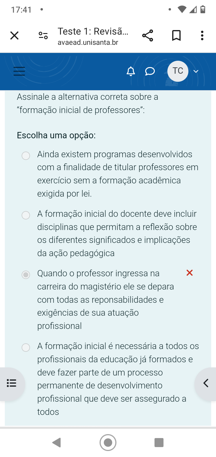 <p>17:41 Teste 1: Revisã... X avaead.unisanta.br TC V Assinale a alternativa correta sobre a "formação inicial de professores": Escolha uma opção: Ainda existem programas desenvolvidos com a finalidade de titular professores em exercício sem a formação acadêmica exigida por lei. A formação inicial do docente deve incluir disciplinas que permitam a reflexão sobre os diferentes significados e implicações da ação pedagógica Quando O professor ingressa na X carreira do magistério ele se depara com todas as reponsabilidades e exigências de sua atuação profissional A formação inicial é necessária a todos os profissionais da educação já formados e deve fazer parte de um processo permanente de desenvolvimento < profissional que deve ser assegurado a todos</p>