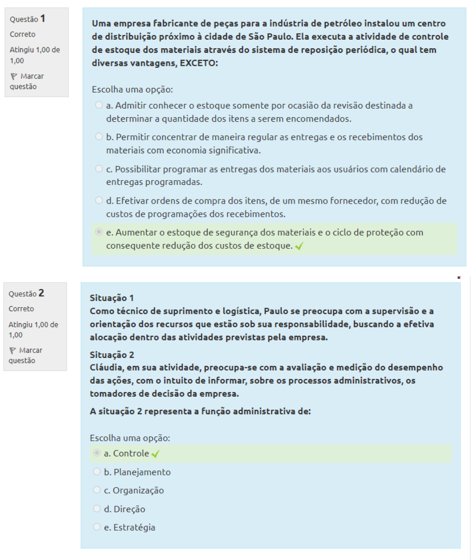 <p>Questão 1 Uma empresa fabricante de peças para a indústria de petróleo instalou um centro Correto de distribuição próximo à cidade de São Paulo. Ela executa a atividade de controle Atingiu 1,00 de de estoque dos materiais através do sistema de reposição periódica, o qual tem 1,00 diversas vantagens, EXCETO: Marcar questão Escolha uma opção: a. Admitir conhecer o estoque somente por ocasião da revisão destinada a determinar a quantidade dos itens a serem encomendados. b. Permitir concentrar de maneira regular as entregas e os recebimentos dos materiais com economia significativa. C. Possibilitar programar as entregas dos materiais aos usuários com calendário de entregas programadas. d. Efetivar ordens de compra dos itens, de um mesmo fornecedor, com redução de custos de programações dos recebimentos. e. Aumentar estoque de segurança dos materiais e ciclo de proteção com consequente redução dos custos de estoque. Questão 2 Situação 1 Correto Como técnico de suprimento e logística, Paulo se preocupa com a supervisão e a Atingiu 1,00 de orientação dos recursos que estão sob sua responsabilidade, buscando a efetiva 1,00 alocação dentro das atividades previstas pela empresa. Marcar Situação 2 questão Cláudia, em sua atividade, preocupa-se com a avaliação e medição do desempenho das ações, com intuito de informar, sobre os processos administrativos, os tomadores de decisão da empresa. A situação 2 representa a função administrativa de: Escolha uma opção: a. Controle b. Planejamento C. Organização d. Direção e. Estratégia</p><p>Questão 3 Uma empresa contratou um serviço de auditoria com o objetivo de certificar seu Correto Sistema de Gestão da Qualidade no âmbito da excelência. Tal certificação é obtida Atingiu 1,00 de por meio da Norma: 1,00 Marcar Escolha uma opção: questão a. ASME 16000 b. OSHAS 18000 BS 7800 d. NBR ISO 9004 e. ISO 14000 Questão 4 Pensamento Administrativo afeta diretamente a qualidade das organizações, cujo Correto fator de influência são os recursos que estas têm disponíveis (REBOUÇAS, 2008). Atingiu 1,00 de Os recursos nos quais podem ser consideradas as variáveis motivação e habilidade 1,00 profissional são recursos: P Marcar questão Escolha uma opção: a. Informacionais b. Tecnológicos Humanos d. Administrativos e. Financeiros Questão 5 enquadramento de uma organização nos requisitos da Norma OHSAS 18001 visa à Correto sua certificação em um sistema de gestão de: Atingiu 1,00 de 1,00 Escolha uma opção: Marcar a. Segurança e Saúde Ocupacional. questão b. Qualidade e Segurança Ocupacional. Segurança Patrimonial e Saúde. d. Meio Ambiente e Qualidade. e. Qualidade e Segurança Patrimonial.</p><p>Questão 6 Situação 1 Correto Como técnico de suprimento e logística, Paulo se preocupa com a supervisão e a Atingiu 1,00 de orientação dos recursos que estão sob sua responsabilidade, buscando a efetiva 1,00 alocação dentro das atividades previstas pela empresa. Marcar Situação 2 questão Cláudia, em sua atividade, preocupa-se com a avaliação e medição do desempenho das ações, com o intuito de informar, sobre os processos administrativos, os tomadores de decisão da empresa. A situação 1 representa a função administrativa de: Escolha uma opção: a. Estratégia. b. Controle. Direção. d. Organização. e. Planejamento. Questão 7 As empresas têm utilizado, preferencialmente, transporte rodoviário para Correto movimentação de cargas no mercado interno. Uma das vantagens inerentes ao Atingiu 1,00 de transporte rodoviário, em comparação ao ferroviário e o aéreo, é: 1,00 Marcar Escolha uma opção: questão a. Ser mais rápido tempo de entrega para longas distâncias. b. Movimentar grandes cargas por frete, acima de nove mil toneladas. Apresentar serviço de coleta e entrega de produtos acabados, porta a porta. d. Ser mais confiável. e. Possibilitar serviços para o mercado de cargas de grande porte. Questão 8 Um funcionário preocupa-se com a qualidade do seu trabalho. A compreensão de Correto qualidade está proposta pela capacidade de um produto ou serviço: Atingiu 1,00 de 1,00 Escolha uma opção: Marcar a. Valorizar trabalho dos clientes externos. questão b. Satisfazer aos anseios dos clientes externos e internos. C. Suprir as exigências dos clientes internos. d. Priorizar as necessidades dos clientes internos. e. Contribuir para a lucratividade da organização.</p><p>Questão 9 Ao enfrentar os novos desafios, sob a ótica de novos paradigmas, a área de compras Correto das empresas concentra-se, atualmente, no desenvolvimento de relacionamentos Atingiu 1,00 de apropriados com fornecedores, numa abordagem mais proativa do processo de 1,00 compras de materiais, com foco na melhoria das operações da empresa. Nesse Marcar sentido, na compra proativa, pode-se afirmar que: questão Cliente e fornecedor contribuem para as especificações dos Verdadeiro materiais; Falso Os problemas são responsabilidade do fornecedor; Falso A ênfase está no momento presente; sistema de compras pode ser integrado aos sistemas dos Verdadeiro fornecedores; Falso A área de compras subordina-se a finanças; Questão 10 As empresas precisam estar atentas às mudanças que ocorrem, no mercado com Correto produtos e serviços, a fim de serem inovadoras na solução dos problemas de seus Atingiu 1,00 de clientes. Com esse propósito, o que NÃO traz benefícios para a logística moderna à 1,00 cadeia produtiva é (são): Marcar questão Escolha uma opção: a. Racionalização dos processos. b. Valor no fluxo da informação. C. Integração dos fornecedores com clientes. d. Ciclos logísticos mais longos. e. Integração sistêmica dos setores da empresa.</p>