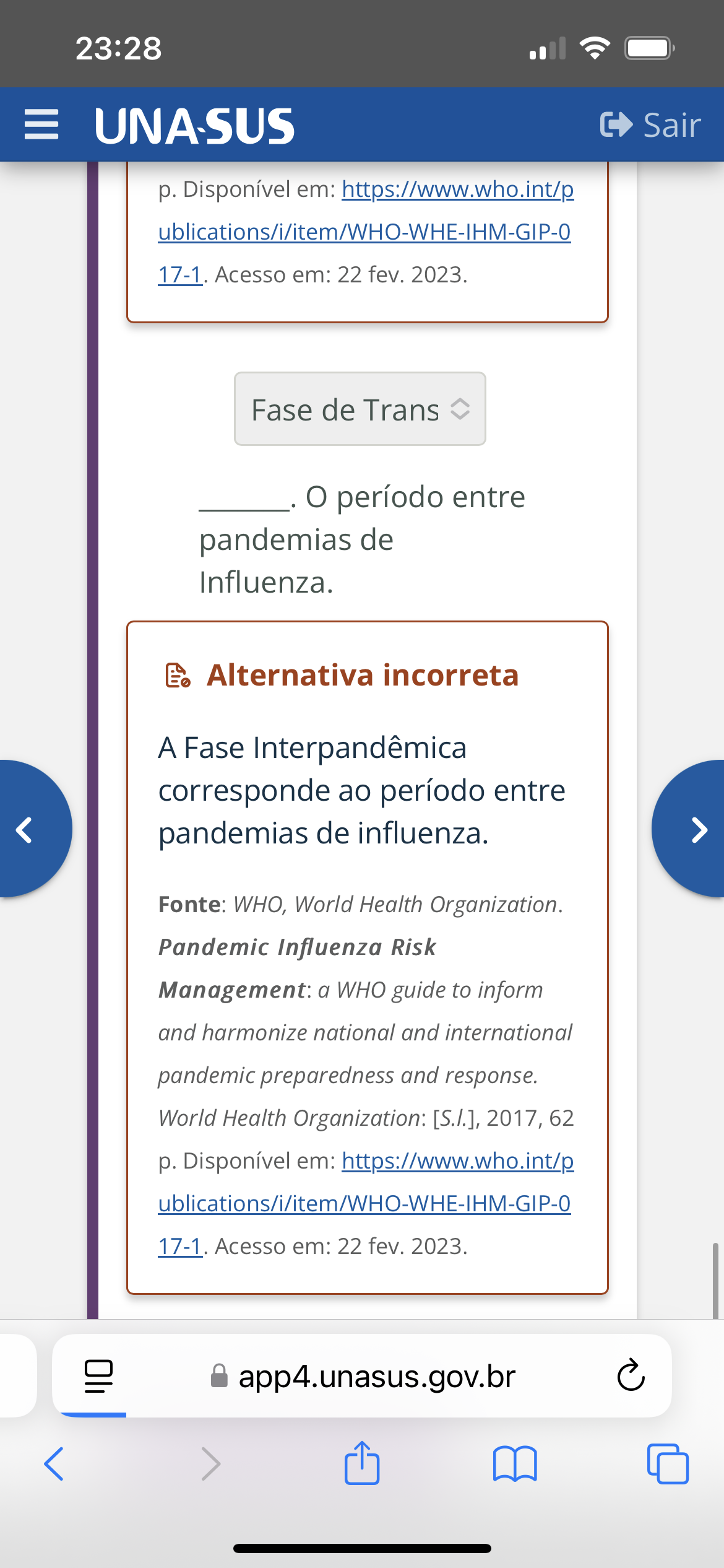 <p>23:28 UNA-SUS Sair p. Disponível em: https://www.who.int/p Acesso em: 22 fev. 2023. Fase de Trans O período entre pandemias de Influenza. Alternativa incorreta A Fase Interpandêmica corresponde ao período entre pandemias de influenza. Fonte: WHO, World Health Organization. Pandemic Influenza Risk Management: a WHO guide to inform and harmonize national and international pandemic preparedness and response. World Health Organization: [S.I.], 2017, 62 p. Disponível em: https://www.who.int/p Acesso em: 22 fev. 2023. app4.unasus.gov.br</p>