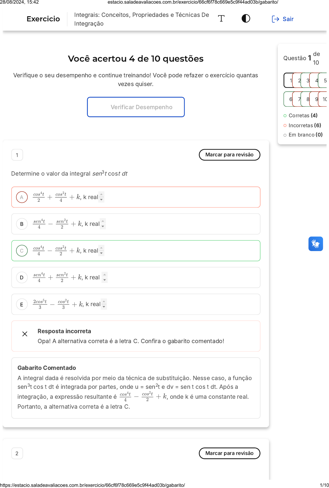 <p>Você acertou 4 de 10 questões</p><p>Verifique o seu desempenho e continue treinando! Você pode refazer o exercício quantas</p><p>vezes quiser.</p><p>Verificar Desempenho</p><p>A</p><p>B</p><p>C</p><p>D</p><p>E</p><p>1 Marcar para revisão</p><p>Determine o valor da integral sen t cost dt3</p><p>, k real+ + kcos4t</p><p>2</p><p>cos2t</p><p>4</p><p>, k real− + ksen4t</p><p>4</p><p>sen2t</p><p>2</p><p>, k real− + kcos4t</p><p>4</p><p>cos2t</p><p>2</p><p>, k real + + ksen4t</p><p>4</p><p>sen2t</p><p>2</p><p>, k real− + k2cos5t</p><p>3</p><p>cos2t</p><p>3</p><p>Resposta incorreta</p><p>Opa! A alternativa correta é a letra C. Confira o gabarito comentado!</p><p>Gabarito Comentado</p><p>A integral dada é resolvida por meio da técnica de substituição. Nesse caso, a função</p><p>sen t cos t dt é integrada por partes, onde u = sen t e dv = sen t cos t dt. Após a</p><p>integração, a expressão resultante é , onde k é uma constante real.</p><p>Portanto, a alternativa correta é a letra C.</p><p>3 2</p><p>− + kcos4t</p><p>4</p><p>cos2t</p><p>2</p><p>2 Marcar para revisão</p><p>Questão 1</p><p>de</p><p>10</p><p>Corretas �4�</p><p>Incorretas �6�</p><p>Em branco �0�</p><p>1 2 3 4 5</p><p>6 7 8 9 10</p><p>Exercicio</p><p>Integrais: Conceitos, Propriedades e Técnicas De</p><p>Integração</p><p>Sair</p><p>28/08/2024, 15:42 estacio.saladeavaliacoes.com.br/exercicio/66cf6f78c669e5c9f44ad03b/gabarito/</p><p>https://estacio.saladeavaliacoes.com.br/exercicio/66cf6f78c669e5c9f44ad03b/gabarito/ 1/10</p><p>A</p><p>B</p><p>C</p><p>D</p><p>E</p><p>As substituiç�es trigonométricas säo artificios que säo utilizados para a resolução e</p><p>integrais. Utilizando da técnica mencionada, calcule a integral de .∫ √1 − 4x2dx</p><p>[ + sen(2 arcsen(x))] + C</p><p>arcsen(x)</p><p>4</p><p>1</p><p>8</p><p>[ + sen(2 arcsen(2x))] + C</p><p>arcsen(2x)</p><p>8</p><p>1</p><p>4</p><p>[ + sen(2 arcsen(2x))] + C.</p><p>arcsen(2x)</p><p>4</p><p>1</p><p>8</p><p>[2 arcsen(2x) + sen(2 arcsen(2x))] + C.1</p><p>8</p><p>[ + sen(2 arcsen(2x))] + C</p><p>arcsen(2x)</p><p>4</p><p>Resposta incorreta</p><p>Opa! A alternativa correta é a letra C. Confira o gabarito comentado!</p><p>Gabarito Comentado</p><p>Utilizando a relaçäo trigonométrica:</p><p>Substituindo na integral:</p><p>Sabemos que Assim:</p><p>Fatorando</p><p>Integrando:</p><p>Retornando o valor de :</p><p>Substituindo na equaçăo:</p><p>cos2(θ) = 1 − sen2(θ)</p><p>2x = sen(θ) → dx = dθ</p><p>cos(θ)</p><p>2</p><p>√1 − 4x2dx = ∫ √1 − (2x)2dx = ∫ √1 − sen2 θ( dθ)</p><p>Como √1 − sen2 θ = cos θ. Assim: ∫ cos2(θ)dθ</p><p>cos(θ)</p><p>2</p><p>1</p><p>2</p><p>cos2(θ) = + .1</p><p>2</p><p>cos(θ)</p><p>2</p><p>∫ ( + ) dθ1</p><p>2</p><p>1</p><p>2</p><p>cos(2θ)</p><p>2</p><p>1</p><p>2</p><p>∫ dθ+ ∫ cos(2θ)dθ = [ + sen(2θ)] + C1</p><p>4</p><p>1</p><p>4</p><p>θ</p><p>4</p><p>1</p><p>8</p><p>x</p><p>2x = sen(θ) → θ = arcsen(2x)</p><p>θ</p><p>[ + sen(2 arcsen(2x))] + C</p><p>arcsen(2x)</p><p>4</p><p>1</p><p>8</p><p>28/08/2024, 15:42 estacio.saladeavaliacoes.com.br/exercicio/66cf6f78c669e5c9f44ad03b/gabarito/</p><p>https://estacio.saladeavaliacoes.com.br/exercicio/66cf6f78c669e5c9f44ad03b/gabarito/ 2/10</p><p>A</p><p>B</p><p>C</p><p>D</p><p>E</p><p>Assim, temos que:</p><p>∫ √1 − 4x2dx = [ + sen(2 arcsen(2x))] + C</p><p>arcsen(2x)</p><p>4</p><p>1</p><p>8</p><p>3 Marcar para revisão</p><p>Determine o valor da integral ∫ (2sec2y+ + 2y)dy3</p><p>1+y2</p><p>2tg y+3 arctg y+y+k, k real</p><p>2 seny+3 arcsen y+2y+k, k real</p><p>2tg y- arctg y-2y+k, k real</p><p>2 cos y+3 arsen y+y+k, k real</p><p>2 sen y+3 arctg y+y+k, k real</p><p>Resposta correta</p><p>Parabéns, você selecionou a alternativa correta. Confira o gabarito</p><p>comentado!</p><p>Gabarito Comentado</p><p>A integral dada é A integral de é , a integral</p><p>de é e a integral de é . Portanto, a integral da expressão dada é</p><p>, onde é uma constante real. Isso corresponde à</p><p>alternativa A.</p><p>∫ (2sec2y+ + 2y)dy.3</p><p>1+y2</p><p>2sec2y 2tgy</p><p>3</p><p>1+y2</p><p>3arctgy 2y y2</p><p>2tgy+ 3arctgy+ y2 + k k</p><p>4 Marcar para revisão</p><p>Determine o valor da integral ∫ 8</p><p>1</p><p>4u8+U 2 8√u−2</p><p>u2</p><p>28/08/2024, 15:42 estacio.saladeavaliacoes.com.br/exercicio/66cf6f78c669e5c9f44ad03b/gabarito/</p><p>https://estacio.saladeavaliacoes.com.br/exercicio/66cf6f78c669e5c9f44ad03b/gabarito/ 3/10</p><p>A</p><p>B</p><p>C</p><p>D</p><p>E</p><p>A</p><p>B</p><p>C</p><p>D</p><p>E</p><p>189</p><p>2</p><p>295</p><p>2</p><p>103</p><p>2</p><p>211</p><p>255</p><p>Resposta incorreta</p><p>Opa! A alternativa correta é a letra B. Confira o gabarito comentado!</p><p>Gabarito Comentado</p><p>O valor da integral dada é obtido através da aplicação das regras de integração. Ao</p><p>resolver a integral, encontramos que o valor é igual a , que corresponde à</p><p>alternativa B.</p><p>295</p><p>2</p><p>5 Marcar para revisão</p><p>A técnica de substituiçảo é uma das técnicas mais empregadas em resoluçảo de integrais.</p><p>Utilizando a técnica de substituiçäo, a resoluçăo é:∫ t sec2(t2)tg4 (t2) dt</p><p>tg2(t2) + C.1</p><p>10</p><p>tg3 (t2) + C.1</p><p>10</p><p>tg g4 (t2) + C.1</p><p>10</p><p>tg5(t2) + C.1</p><p>10</p><p>tg6 (t2) + C.1</p><p>10</p><p>28/08/2024, 15:42 estacio.saladeavaliacoes.com.br/exercicio/66cf6f78c669e5c9f44ad03b/gabarito/</p><p>https://estacio.saladeavaliacoes.com.br/exercicio/66cf6f78c669e5c9f44ad03b/gabarito/ 4/10</p><p>A</p><p>B</p><p>C</p><p>D</p><p>E</p><p>Resposta correta</p><p>Parabéns, você selecionou a alternativa correta. Confira o gabarito</p><p>comentado!</p><p>Gabarito Comentado</p><p>Substituindo:</p><p>Usando integração trigonométrica:</p><p>LogO,</p><p>∫ t sec2(t2) tg4(t2)dt</p><p>u = t2 → du = 2tdt → tdt = du</p><p>1</p><p>2</p><p>∫ t sec2(t2)tg4 (t2) dt = ∫ sec2(u)tg4(u)du1</p><p>2</p><p>ν = tg(u) → dν = sec2(u)du</p