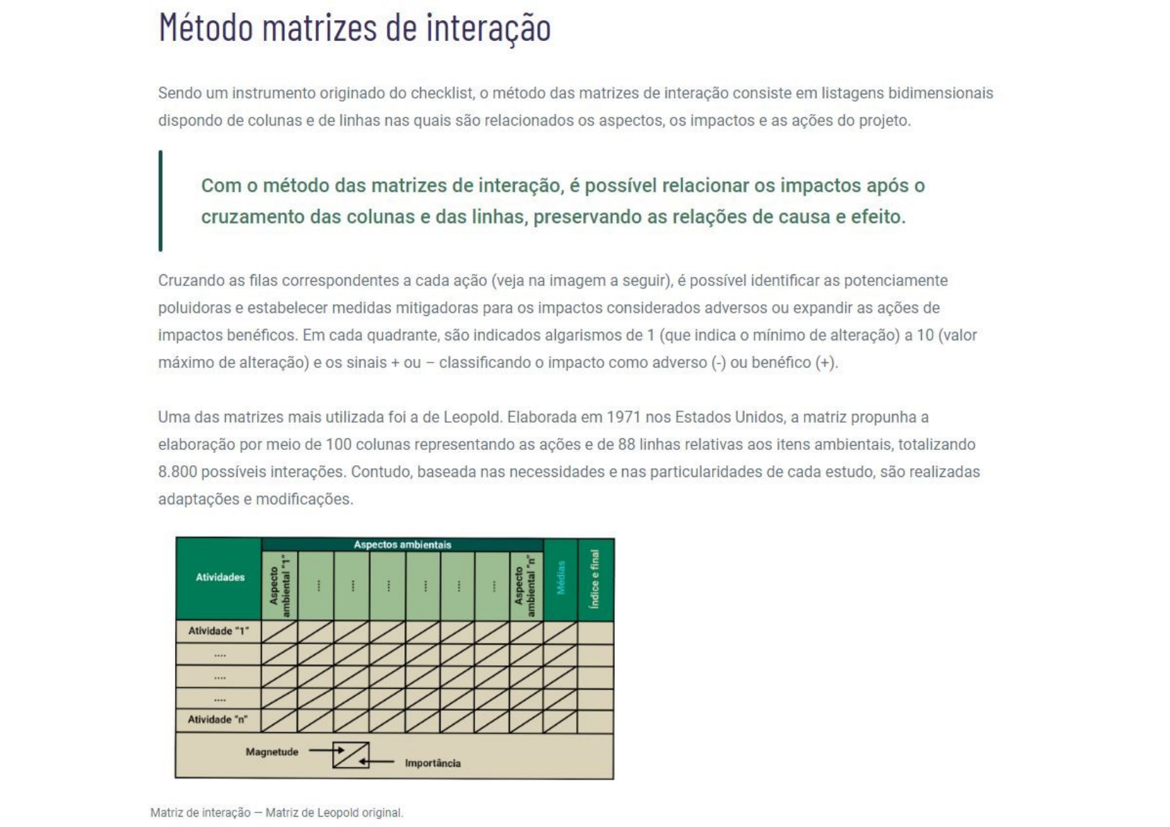 <p>Método matrizes de interação Sendo um instrumento originado do checklist, o método das matrizes de interação consiste em listagens bidimensionais dispondo de colunas e de linhas nas quais são relacionados os aspectos, os impactos e as ações do projeto. Com o método das matrizes de interação, é possível relacionar os impactos após o cruzamento das colunas e das linhas, preservando as relações de causa e efeito. Cruzando as filas correspondentes a cada ação (veja na imagem a seguir), é possível identificar as potenciamente poluidoras e estabelecer medidas mitigadoras para os impactos considerados adversos ou expandir as ações de impactos benéficos. Em cada quadrante, são indicados algarismos de 1 (que indica o mínimo de alteração) a 10 (valor máximo de alteração) e os sinais + ou classificando o impacto como adverso (-) ou benéfico (+). Uma das matrizes mais utilizada foi a de Elaborada em 1971 nos Estados Unidos, a matriz propunha a elaboração por meio de 100 colunas representando as ações e de 88 linhas relativas aos itens ambientais, totalizando 8.800 possíveis interações. Contudo, baseada nas necessidades e nas particularidades de cada estudo, são realizadas adaptações e modificações. Aspectos ambientais Atividades Atividade "1" Atividade "n" Magnetude Importância Matriz de interação - Matriz de Leopold original.</p>