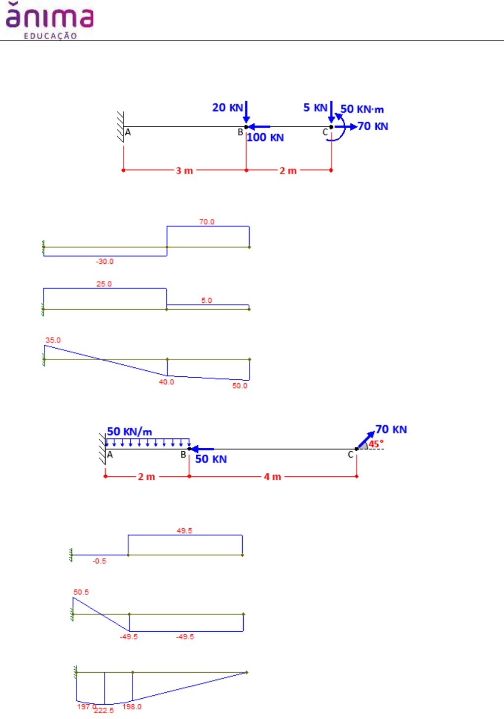 <p>UC: Estruturas Isostáticas e Hiperestáticas</p><p>Professora: Luciana Kataoka</p><p>Lista 1 – Reações de Apoio | Diagramas de Esforços Internos</p><p>Para as vigas abaixo, calcule as reações de apoio e desenhe o diagrama de esforços.</p><p>EXERCÍCIO 1</p><p>Resposta: HA = 30 KN (para a direita) VA = 25 KN (para cima) MA = 35 KN · m (anti-horário)</p><p>Diagrama de Força Normal (KN)</p><p>Diagrama de Força Cortante (KN)</p><p>Diagrama de Momento Fletor (KN)</p><p>EXERCÍCIO 2</p><p>Resposta: HA = 0,5 KN (para a direita) VA = 50,5 KN (para cima) MA = 197 KN · m (horário)</p><p>Diagrama de Força Normal (KN)</p><p>Diagrama de Força Cortante (KN)</p><p>Diagrama de Momento Fletor (KN)</p><p>UC: Estruturas Isostáticas e Hiperestáticas</p><p>Professora: Luciana Kataoka</p><p>Lista 1 – Reações de Apoio | Diagramas de Esforços Internos</p><p>EXERCÍCIO 3</p><p>Resposta: HC = 2P (para a esquerda) VC = 2P (para cima) MC = 8PL (horário)</p><p>Diagrama de Força Normal (KN)</p><p>Diagrama de Força Cortante (KN)</p><p>Diagrama de Momento Fletor (KN)</p><p>EXERCÍCIO 4</p><p>Resposta: VB = 1,67 KN (para cima) HC = 25 KN (para a direita) VC = 31,67 KN (para cima)</p><p>Diagrama de Força Normal (KN)</p><p>Diagrama de Força Cortante (KN)</p><p>UC: Estruturas Isostáticas e Hiperestáticas</p><p>Professora: Luciana Kataoka</p><p>Lista 1 – Reações de Apoio | Diagramas de Esforços Internos</p><p>Diagrama de Momento Fletor (KN)</p><p>EXERCÍCIO 5</p><p>Resposta: HA = 70 KN (para a direita) VA = 15 KN (para cima) VD = 25 KN (para cima)</p><p>Diagrama de Força Normal (KN)</p><p>Diagrama de Força Cortante (KN)</p><p>Diagrama de Momento Fletor (KN)</p><p>EXERCÍCIO 6</p><p>Resposta: HA = 20 KN (para a direita) VA = 47,5 KN (para cima) VC = 32,5 KN (para cima)</p><p>Diagrama de Força Normal (KN)</p><p>UC: Estruturas Isostáticas e Hiperestáticas</p><p>Professora: Luciana Kataoka</p><p>Lista 1 – Reações de Apoio | Diagramas de Esforços Internos</p><p>Diagrama de Força Cortante (KN)</p><p>Diagrama de Momento Fletor (KN)</p><p>EXERCÍCIO 7</p><p>Resposta: HA = 80 KN (para a esquerda) VA = 33 KN (para cima) VC = 52 KN (para cima)</p><p>Diagrama de Força Normal (KN)</p><p>Diagrama de Força Cortante (KN)</p><p>Diagrama de Momento Fletor (KN)</p><p>EXERCÍCIO 8</p><p>Resposta: VB = 14,35 KN (para cima) HC = 37,50 KN (para a esquerda) VC = 17,34 KN (para baixo)</p><p>UC: Estruturas Isostáticas e Hiperestáticas</p><p>Professora: Luciana Kataoka</p><p>Lista 1 – Reações de Apoio | Diagramas de Esforços Internos</p><p>Diagrama de Força Normal (KN)</p><p>Diagrama de Força Cortante (KN)</p><p>Diagrama de Momento Fletor (KN)</p>