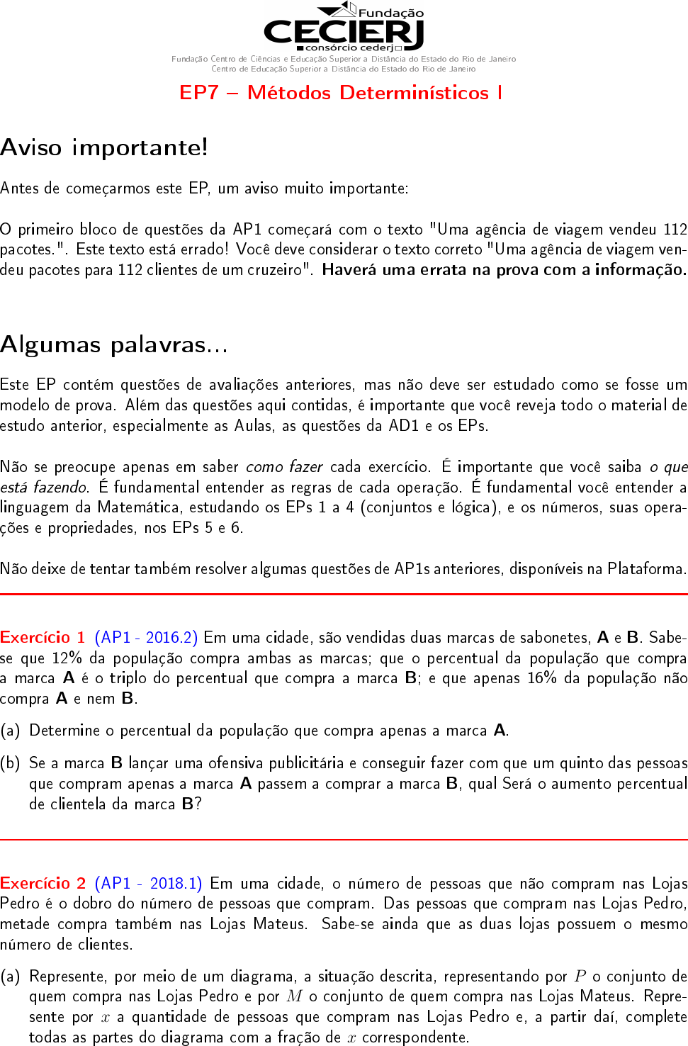 <p>Fundação Centro de Ciências e Educação Superior a Distância do Estado do Rio de Janeiro</p><p>Centro de Educação Superior a Distância do Estado do Rio de Janeiro</p><p>EP7 � Métodos Determinísticos I</p><p>Aviso importante!</p><p>Antes de começarmos este EP, um aviso muito importante:</p><p>O primeiro bloco de questões da AP1 começará com o texto "Uma agência de viagem vendeu 112</p><p>pacotes.". Este texto está errado! Você deve considerar o texto correto "Uma agência de viagem ven-</p><p>deu pacotes para 112 clientes de um cruzeiro". Haverá uma errata na prova com a informação.</p><p>Algumas palavras...</p><p>Este EP contém questões de avaliações anteriores, mas não deve ser estudado como se fosse um</p><p>modelo de prova. Além das questões aqui contidas, é importante que você reveja todo o material de</p><p>estudo anterior, especialmente as Aulas, as questões da AD1 e os EPs.</p><p>Não se preocupe apenas em saber como fazer cada exercício. É importante que você saiba o que</p><p>está fazendo. É fundamental entender as regras de cada operação. É fundamental você entender a</p><p>linguagem da Matemática, estudando os EPs 1 a 4 (conjuntos e lógica), e os números, suas opera-</p><p>ções e propriedades, nos EPs 5 e 6.</p><p>Não deixe de tentar também resolver algumas questões de AP1s anteriores, disponíveis na Plataforma.</p><p>Exercício 1 (AP1 - 2016.2) Em uma cidade, são vendidas duas marcas de sabonetes, A e B. Sabe-</p><p>se que 12% da população compra ambas as marcas; que o percentual da população que compra</p><p>a marca A é o triplo do percentual que compra a marca B; e que apenas 16% da população não</p><p>compra A e nem B.</p><p>(a) Determine o percentual da população que compra apenas a marca A.</p><p>(b) Se a marca B lançar uma ofensiva publicitária e conseguir fazer com que um quinto das pessoas</p><p>que compram apenas a marca A passem a comprar a marca B, qual Será o aumento percentual</p><p>de clientela da marca B?</p><p>Exercício 2 (AP1 - 2018.1) Em uma cidade, o número de pessoas que não compram nas Lojas</p><p>Pedro é o dobro do número de pessoas que compram. Das pessoas que compram nas Lojas Pedro,</p><p>metade compra também nas Lojas Mateus. Sabe-se ainda que as duas lojas possuem o mesmo</p><p>número de clientes.</p><p>(a) Represente, por meio de um diagrama, a situação descrita, representando por P o conjunto de</p><p>quem compra nas Lojas Pedro e por M o conjunto de quem compra nas Lojas Mateus. Repre-</p><p>sente por x a quantidade de pessoas que compram nas Lojas Pedro e, a partir daí, complete</p><p>todas as partes do diagrama com a fração de x correspondente.</p><p>Métodos Determinísticos I EP7 2</p><p>(b) Que fração da população da cidade não compra nem nas Lojas Pedro e nem nas Lojas Mateus?</p><p>(c) Que fração da população da cidade compra nas duas lojas?</p><p>(d) Que fração da população da cidade compra apenas nas Lojas Pedro? E apenas nas Lojas Mateus?</p><p>Exercício 3 (AP1 - 2022.2 [adaptado]) Em uma pesquisa com 928 pessoas, têm-se as seguintes</p><p>informações:</p><p>(i) Todos os leitores de Arte da dança também são leitores de Ballet Contemporâneo.</p><p>(ii) Alguns leitores de Clássicos não leem Ballet Contemporâneo.</p><p>(iii) 300 leitores de Ballet Contemporâneo não leem Arte da dança. Destes 300, sabe-se que 100</p><p>também leem Clássicos.</p><p>(iv) Um terço dos leitores de Arte da Dança também lê Clássicos.</p><p>(v) Metade dos leitores de Clássicos também lê Ballet Contemporâneo.</p><p>(vi) Todas as pessoas participantes da pesquisa leem pelo menos uma das três revistas, Arte da</p><p>dança, Ballet Contemporâneo ou Clássicos.</p><p>A partir destas informações:</p><p>(a) Represente a situação por meio de um diagrama de Venn, denotando por A o conjunto dos</p><p>leitores de Arte da dança, por B o conjunto dos leitores de Ballet Contemporâneo e por C o</p><p>conjunto dos leitores de Clássicos. Denote também por x a quantidade de pessoas que leem</p><p>todas as três revistas. Justi�que.</p><p>(b) Preencha o diagrama de Venn da questão 1 com todos os valores numéricos que podem ser</p><p>concluídos a partir das informações dadas em (iii). Justi�que.</p><p>(c) Determine, em função de x a quantidade de pessoas que leem apenas Clássicos e a quantidade</p><p>de pessoas que lê Arte da dança mas não lê Clássicos. Justi�que.</p><p>(d) Quantas pessoas leem todas as três revistas? Justi�que.</p><p>Exercício 4 (AP3 - 2023.1 [Adaptado])</p><p>Uma pesquisa sobre usuários do site de reclamações Queixe Lá que haviam reclamado de companhias</p><p>aéreas, veri�cou-se que:</p><p>(i) Todos os usuários pesquisados reclamaram de pelo menos uma das empresas Amarelo, Ponto</p><p>ou TALAM.</p><p>(ii) Todos os usuários que reclamaram da TALAM também reclamaram da Ponto.</p><p>(iii) Dois terços dos usuários que reclamaram da TALAM também reclamaram da Amarelo.</p><p>(iv) 200 usuários reclamaram apenas da Ponto.</p><p>Fundação CECIERJ Consórcio CEDERJ</p><p>Métodos Determinísticos I EP7 3</p><p>(v) 100 usuários reclamaram apenas da Amarelo.</p><p>(vi) 80 usuários reclamaram tanto da Amarelo quanto da Ponto, mas não reclamaram da TALAM.</p><p>(a) Represente a situação por meio de um diagrama de Venn, denotando por A o conjunto</p><p>dos usuários com reclamações sobre a Amarelo, por P o conjunto dos usuários com reclamações</p><p>sobre a Ponto e por T o conjunto dos usuários com reclamações da TALAM. Denote também</p><p>por 2x a quantidade de usuários com reclamações sobre as três companhias. Justi�que.</p><p>(b) Preencha todas as regiões do diagrama de Venn da questão 1 com todas as quantidades</p><p>de usuários, de acordo com as informações dadas. Algumas destas quantidades estarão em</p><p>função de x. Justi�que.</p><p>(c) Com as informações das questões anterior