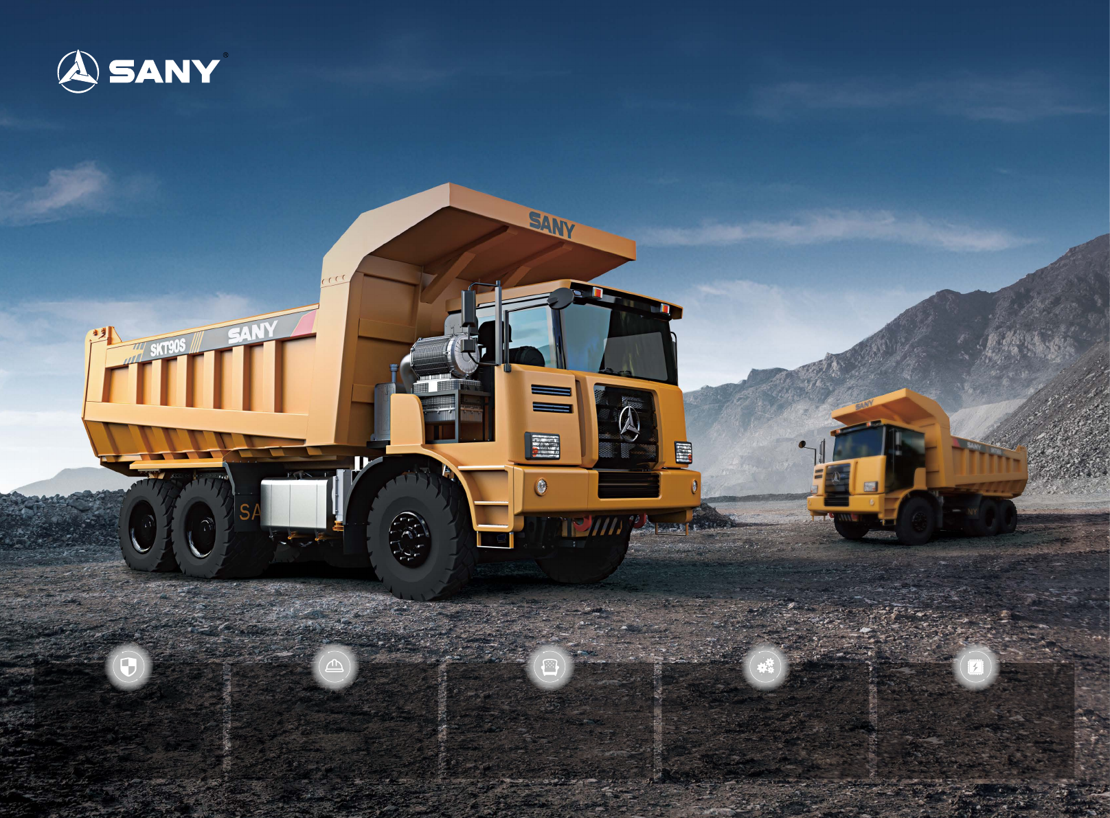 <p>High reliability</p><p>With high-strength and low-stress</p><p>frame, the integral stress level</p><p>is 50% lower than that of similar</p><p>products.</p><p>High security</p><p>Hydraulic steering, emergency steering</p><p>Emergency action is available after</p><p>losing power accidentally.</p><p>High comfort</p><p>Front suspension adopts hydro-pneumatic</p><p>suspension instead of traditional leaf</p><p>spring to make driving more comfortable.</p><p>High attendance rate</p><p>Low failure rate and high attendance rate</p><p>greatly improve the profit capability and</p><p>reduce the maintenance cost.</p><p>Smart electronic</p><p>control system</p><p>Smart network, smart protection,</p><p>preventive maintenance, procedure</p><p>remote upgrade.</p><p>Mining Hero</p><p>Leading future with wisdom</p><p>WIDE BODY DUMP TRUCK</p><p>SKT90S</p><p>Items Parameters</p><p>Gearbox</p><p>Engine power (kW/ rpm)</p><p>Axle (t) 25+35+35</p><p>Steering form</p><p>Full hydraulic steering +</p><p>emergency steering</p><p>Suspension structure</p><p>Front hydro-pneumatic</p><p>suspension + rear leaf</p><p>spring suspension</p><p>Frame structure</p><p>Displacement (L)</p><p>Max. gradeability (%)</p><p>Min. ground clearance</p><p>(mm)</p><p>325</p><p>Min. turning radius (mm)</p><p>Main technical parameters</p><p>Overall dimensions</p><p>Weights kg lb</p><p>Net weight</p><p>Rated payload 132,160</p><p>Max. gross weight</p><p>Overall dimensions Value</p><p>Length (mm)</p><p>Width (mm)</p><p>Height (mm)</p><p>Part Options</p><p>Tail-rising hopper</p><p>Load and unload large-diameter</p><p>materials</p><p>Centralized</p><p>lubrication system</p><p>Fill grease automatically</p><p>Automatic fire</p><p>extinguishing system</p><p>Automatic fire extinguishing in engine</p><p>compartment</p><p>Air suspension seat Improve driving comfort</p><p>Vacuum tire Tubeless tire</p><p>Braking sprinkler</p><p>Spray on the rake drum to lower its</p><p>temperature</p><p>Hydrodynamic</p><p>retarder</p><p>Assist braking, providing force of</p><p>retarder</p><p>Extended brim The brim covers the cab</p><p>* The maximum gross vehicle weight includes alternative devices, all</p><p>accessories and load, etc.</p><p>| Engine</p><p>| Suspension</p><p>▪ Front suspension: non-independent hydro-</p><p>pneumatic spring suspension with hydro-pneumatic</p><p>▪</p><p>| Body</p><p>▪ Container skeleton adopts pulling-through structure</p><p>▪</p><p>▪</p><p>| Tire</p><p>▪</p><p>according to working conditions)</p><p>| Axle</p><p>▪ High-strength cast steel axle housing, reliable and</p><p>| Steering system</p><p>▪</p><p>|</p><p>▪ ø196 lifting cylinder, the lifting process of single front</p><p>| Cab</p><p>▪ Extra large front windshield ensures wider driving</p><p>Follow our WeChat official</p><p>account to learn more.</p><p>Optional configurations</p><p>11,000</p><p>standard.</p><p>Weight parameters</p><p>with longer service life.</p><p>shaft.</p><p>carrying capacity.</p><p>▪ Enhanced main retarder and wheel side reducer have</p><p>double- stage driving and larger driving force.</p><p>durable.</p><p>▪ Emergency steering provides backup steering force</p><p>Full hydraulic steering, convenient, comfortable,</p><p>reliable.</p><p>when losing steering force.</p><p>cylinder is stable and reliable.</p><p>Dumping system</p><p>(nitrogen) suspension cylinder with the characteristic</p><p>of variable damping. It has large energy storage unit</p><p>and variable stiffness to absorb the impact on the</p><p>road.</p><p>▪</p><p>s p r i n g , maintenance-free balance shaft and tie rod.</p><p>R e a r s u s p e n s i o n : e q u i p p e d e n h a n c e d l e a f</p><p>Balance shaft: ø130 mm maintenance -free balance</p><p>with higher strength.</p><p>Main steel plate adopts high strength wearing plate</p><p>▪ Full-frame structure ensures safety of drivers.</p><p>vision.</p><p>Body capacity (m³)</p><p>Struck 33 / Heaped 35</p><p>7DS200</p><p>338/2,100</p><p>Riveted integral frame</p><p>11.6</p><p>30</p><p>60,000</p><p>30,000 66,080</p><p>90,000 198,240</p><p>8,967</p><p>3,468</p><p>4,308</p><p>▪ Model: Weichai WP12G460E310</p><p>▪ Rated power rate: 338kW/2100rpm</p><p>▪ Maximum torque : 2000N.m</p><p>▪ Engine emission conforms to GB20891-2014</p><p>▪ Heavy-load and full-floating semiaxle has strong</p><p>Tire model: 14.00R25 (select appropriate patterns</p><p>Volume: struck: 31 m³; heaped: 35 m³</p><p>Wide bodydump truck SKT90S Manual</p><p>SANY HEAVY EQUIPMENT CO., LTD</p><p>Address: 16 Kaifa Road, Economic & Technological</p><p>Development Zone Shenyang Liaoning Province, P.R.China.</p><p>Postal Code: 110027</p><p>Official Website: www.sanyglobal.com</p><p>Sales Hotline | Tel: 0086-24 8931 8365</p><p>Customer Service Hotline | Tel: 0086-400 8808 318</p><p>Reminder:</p><p>Any change in the technical parameters and configuration due to product modification or upgrade may occur without prior notice.</p><p>The machine in the picture may include additional equipment. This brochure is for reference only, and goods in kind shall prevail.</p><p>Copyright at SANY. No part of this brochure may be copied or used for any purpose without written approval from SANY.</p>